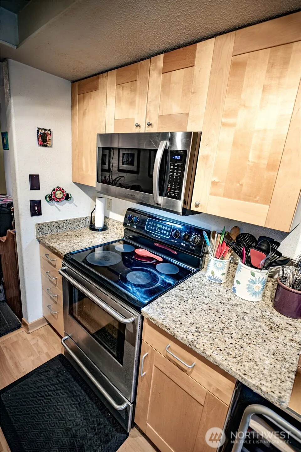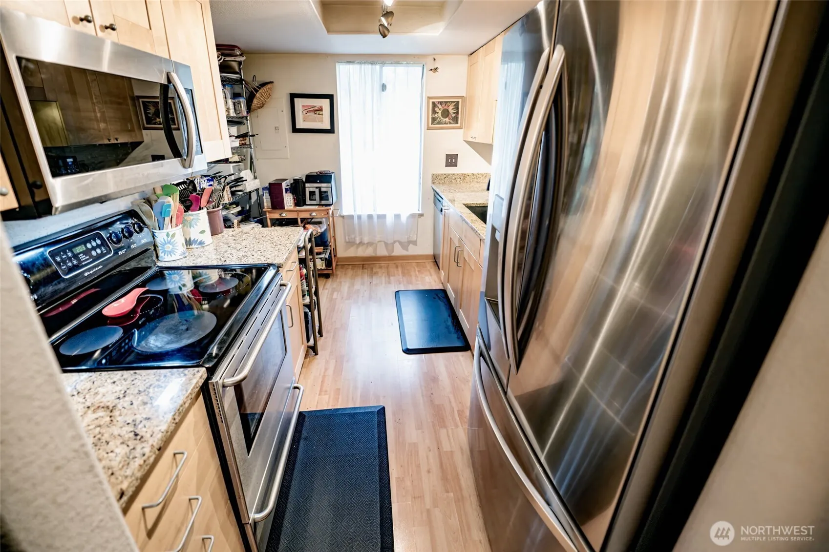 Rare opportunity to own this top floor unit with vaulted ceilings. Overlooks courtyard with swimming pool, clubhouse and playarea. East/West sun exposure. Some remodeling as kitchen offers newer cabinets with beautiful, water proof, designed stone counters, along with stainless appliances, trek lighting, microwave and ceramic double sink. Primary bath offers a porcelain tiled floor and walls with glass door. Both bathrooms have newer vanities/countertops, trifold medicine cabinets, light fixtures! Forced fan heaters. Washer/Dryer. two sliding doors to deck with storage. Gas hookups behind building for future use. Pet friendly with walking trails. Exterior siding has been finished year ago. Seller to payoff special assessment of $19,000 at closing. Super location to Costco, shopping and much more!