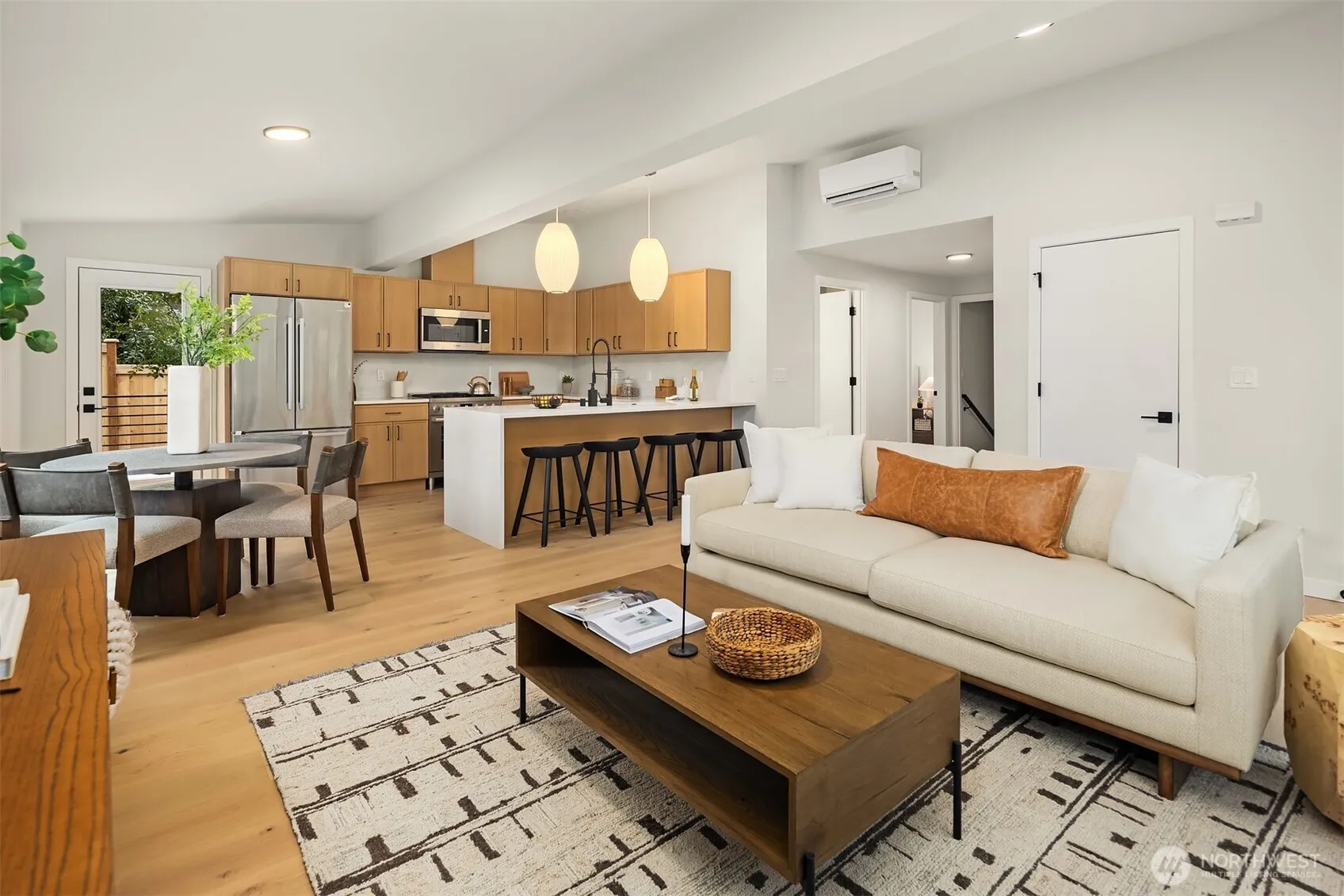 A refined, fully remodeled 4-bedroom residence offering elevated design, modern systems, and effortless comfort. Set on a quiet, light-filled corner lot in Kirkland. This open-concept home has been thoughtfully curated with premium finishes and a seamless indoor-outdoor flow, ideal for both entertaining and everyday living. The heart of the home features a Bosch Pro gas range and full Bosch appliance package, complemented by designer lighting, crisp architectural lines, and engineered hardwoods throughout. Heated bathroom floors add an understated layer of comfort, while efficient ductless mini-split heating and cooling delivers zoned, modern climate control. Extensive upgrades include a new roof, all-new electrical, and new plumbing providing both luxury and long-term peace of mind. Outside, composite decking with custom railings creates a polished extension of the living space, perfect for hosting or unwinding. Positioned on a quiet street and enhanced by its corner-lot setting, the home is filled with natural light and offers a rare blend of thoughtful craftsmanship, modern performance, and refined Kirkland living