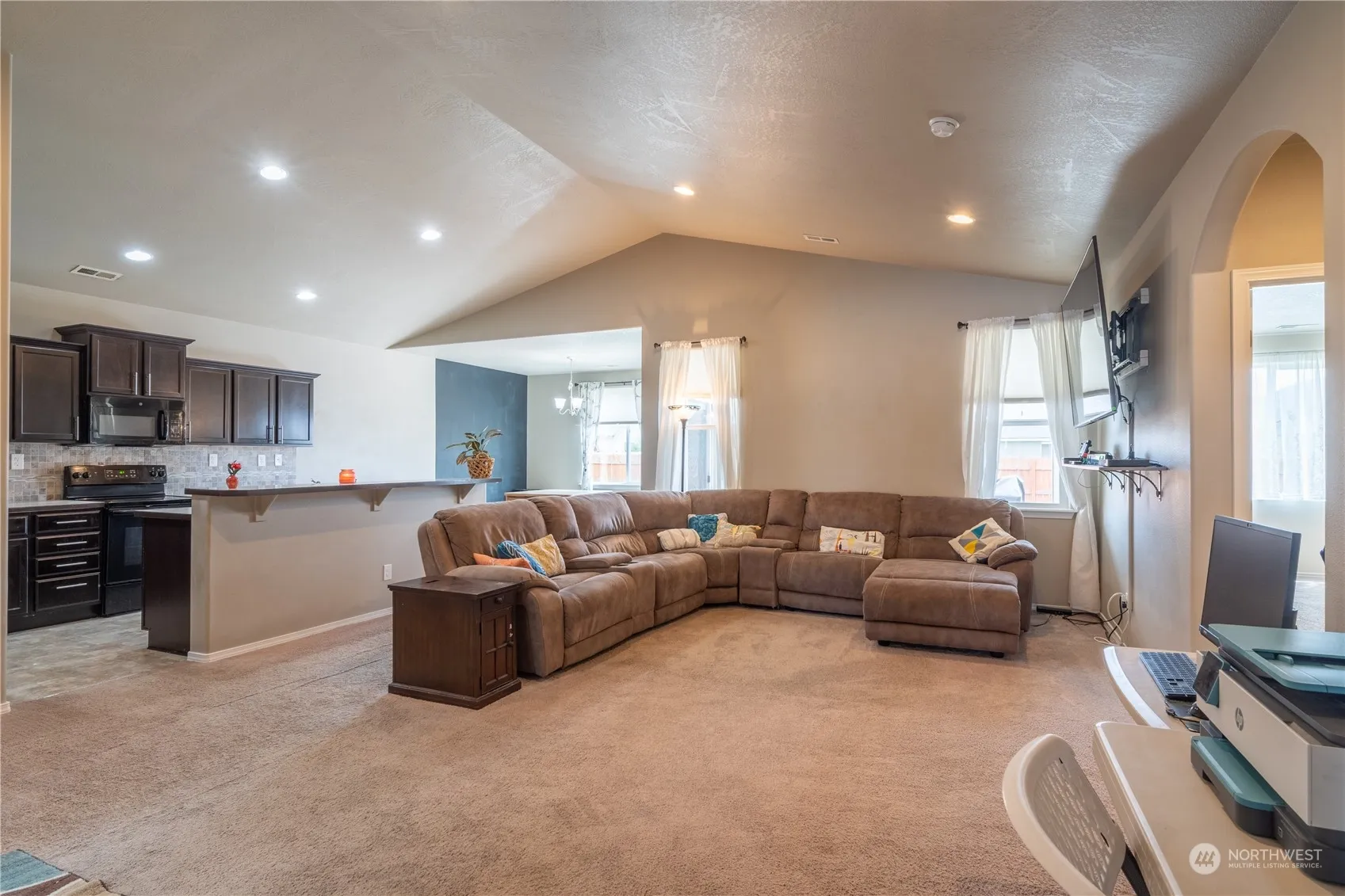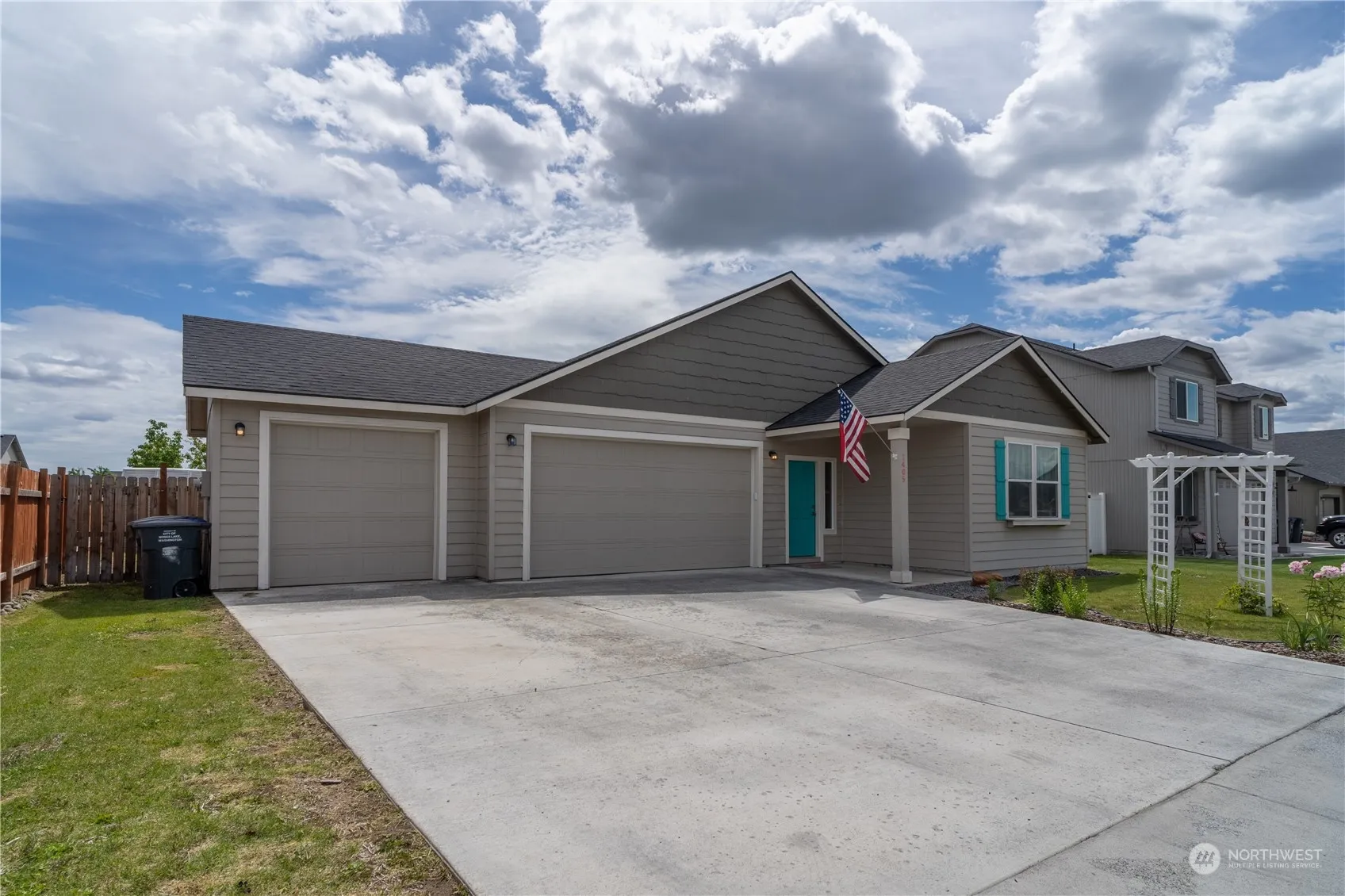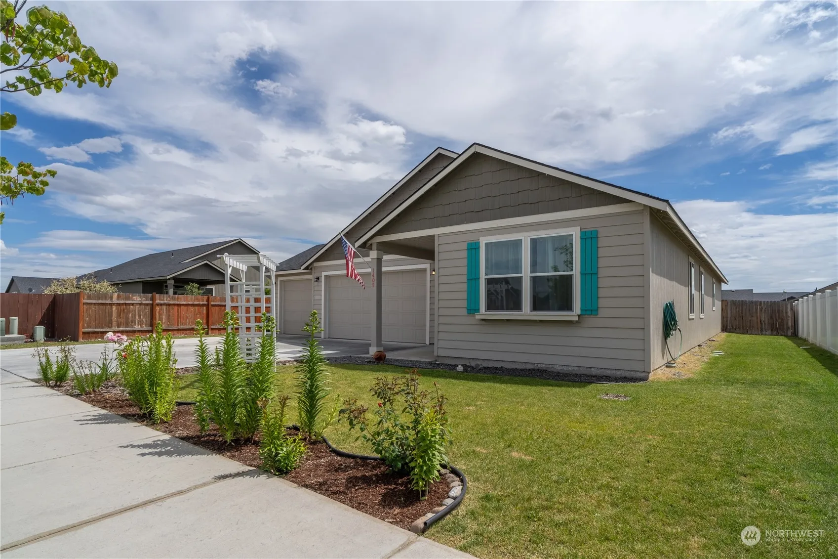 Welcome Home. This 4 bedroom, 2 bath 1979 sq. ft. home comes with a covered front porch, open floor plan with great room design, tile entry, breakfast bar, dining area, primary suite has walk-in closet, bathroom with dual vanity, shower, & tub. The back yard has a covered patio that is perfect for outdoor entertaining, easy maintenance with an underground sprinkler system, raised garden beds, and a small storage shed. You will have plenty of room with a 3 car garage. This is a must see.