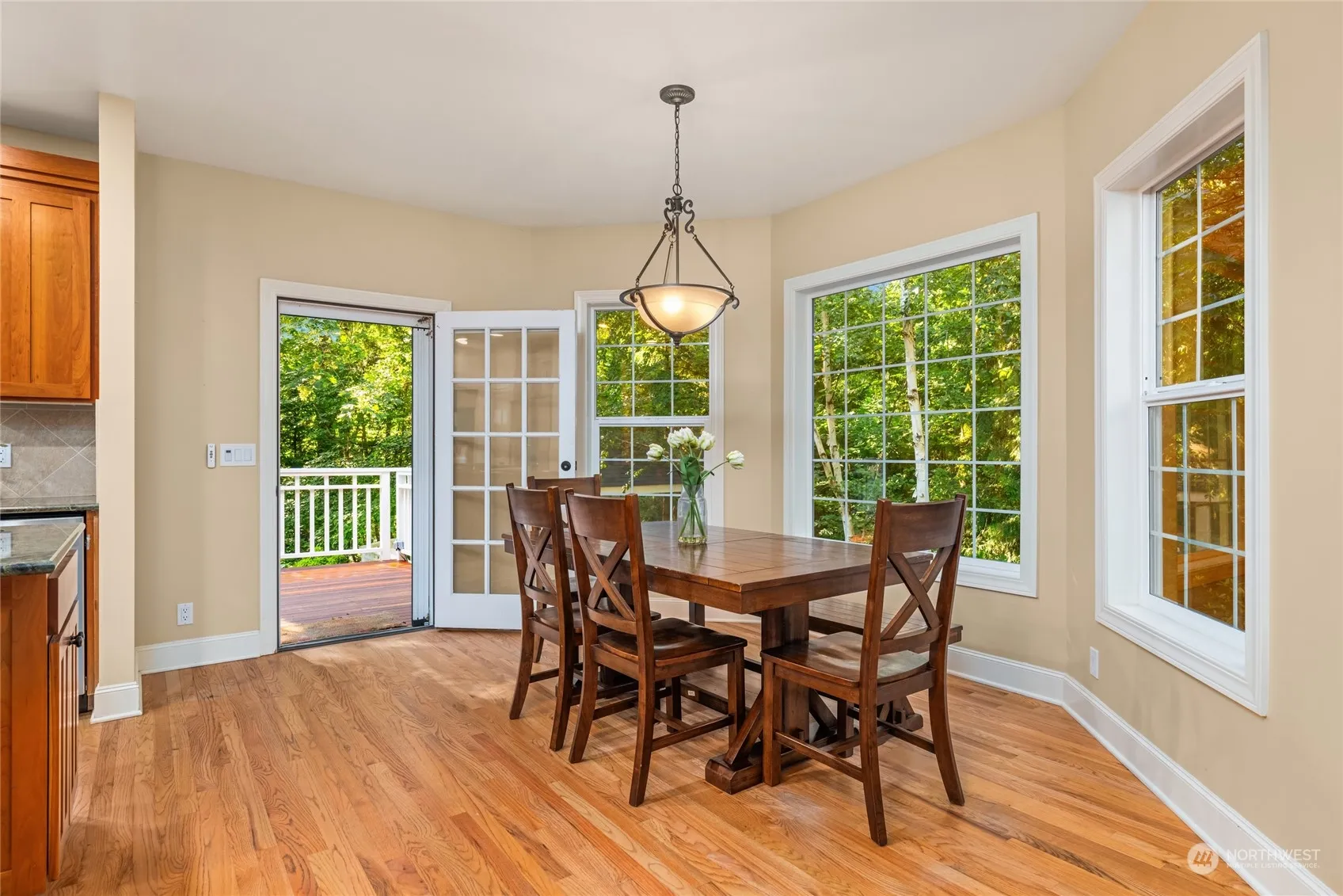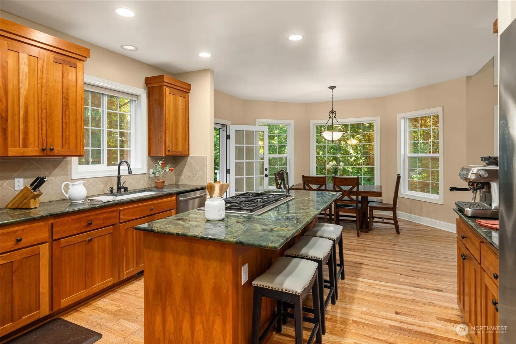 Lovely 4 bedroom home on 2.36 acres in a peaceful, park-like setting. The main floor features primary bedroom, spacious cook’s kitchen w/breakfast nook, dining room, large family room with vaulted ceilings, main floor den & walk-in pantry. The generous main floor primary suite has seating area w/fireplace, 5-piece bath, 2 vanities & large walk-in closet. Upstairs are 3 additional bedrooms (one w/ensuite bath and 2 that share a jack & jill style bathroom), large bonus room and office/library nook. The spectacular grounds include gorgeous, mature landscaping, trails, sunny fenced garden and bridge to the 2.63-acre community open space with trails. A detached 1176 sq ft 2-car garage plus shop space has potential for conversion to guest house.