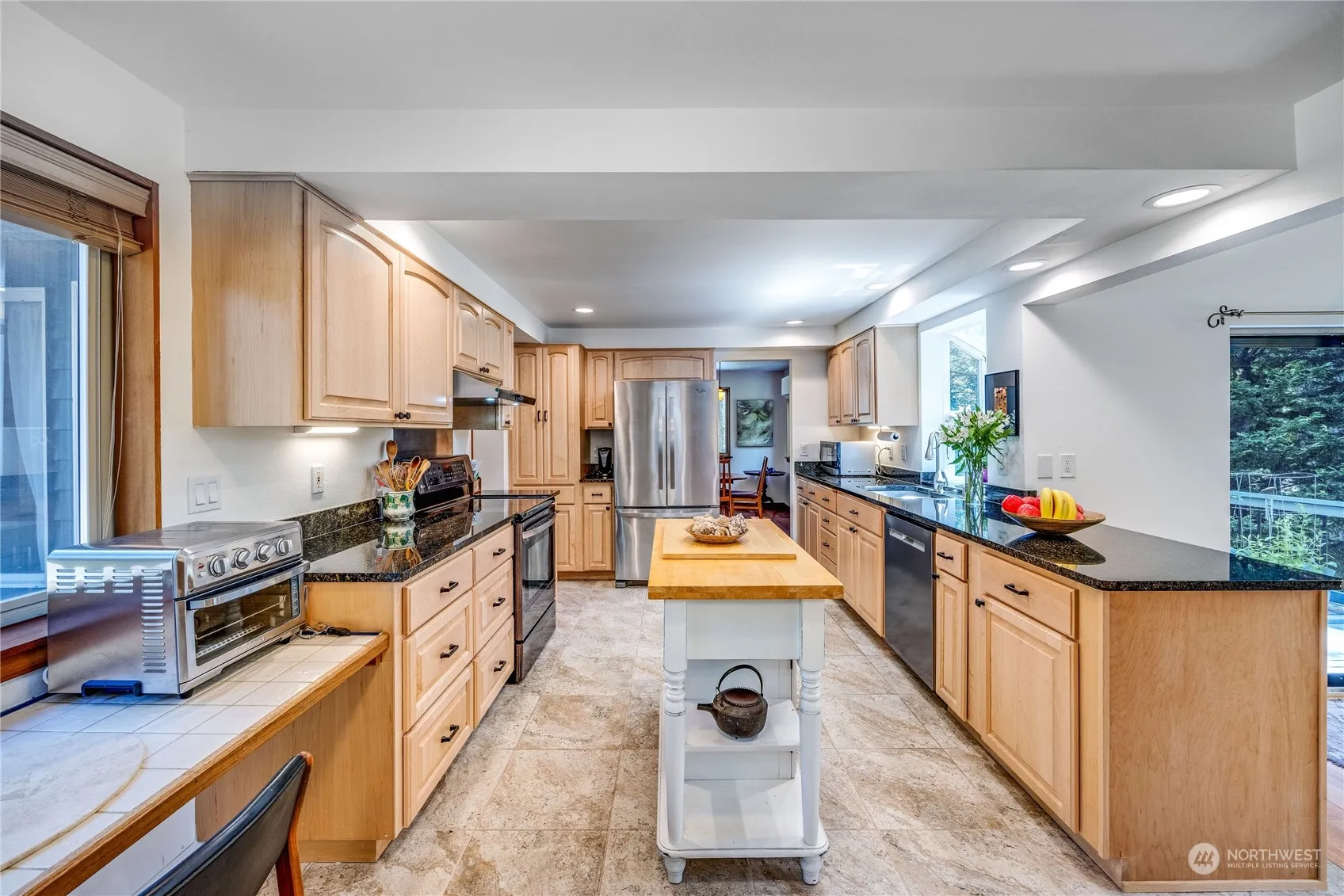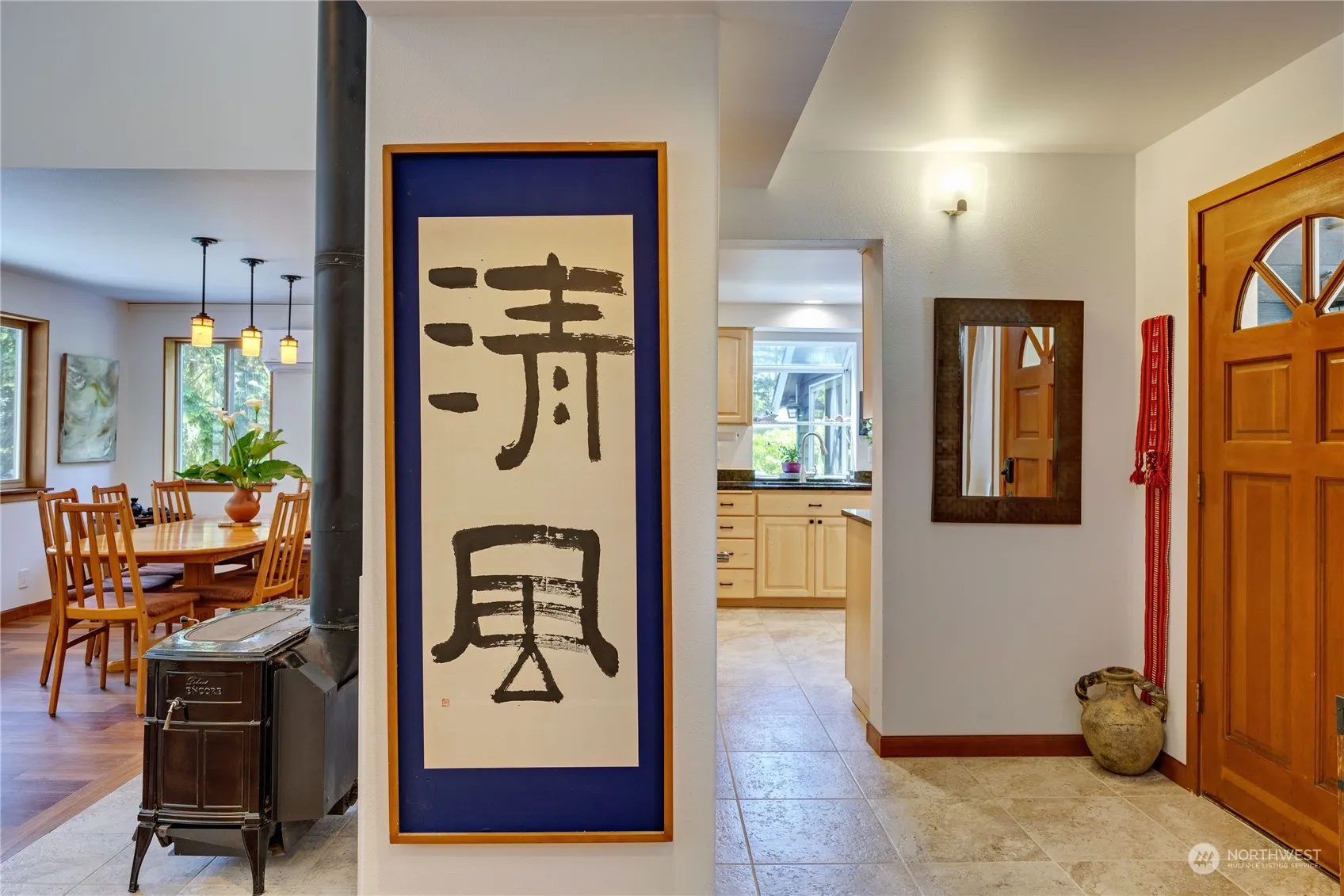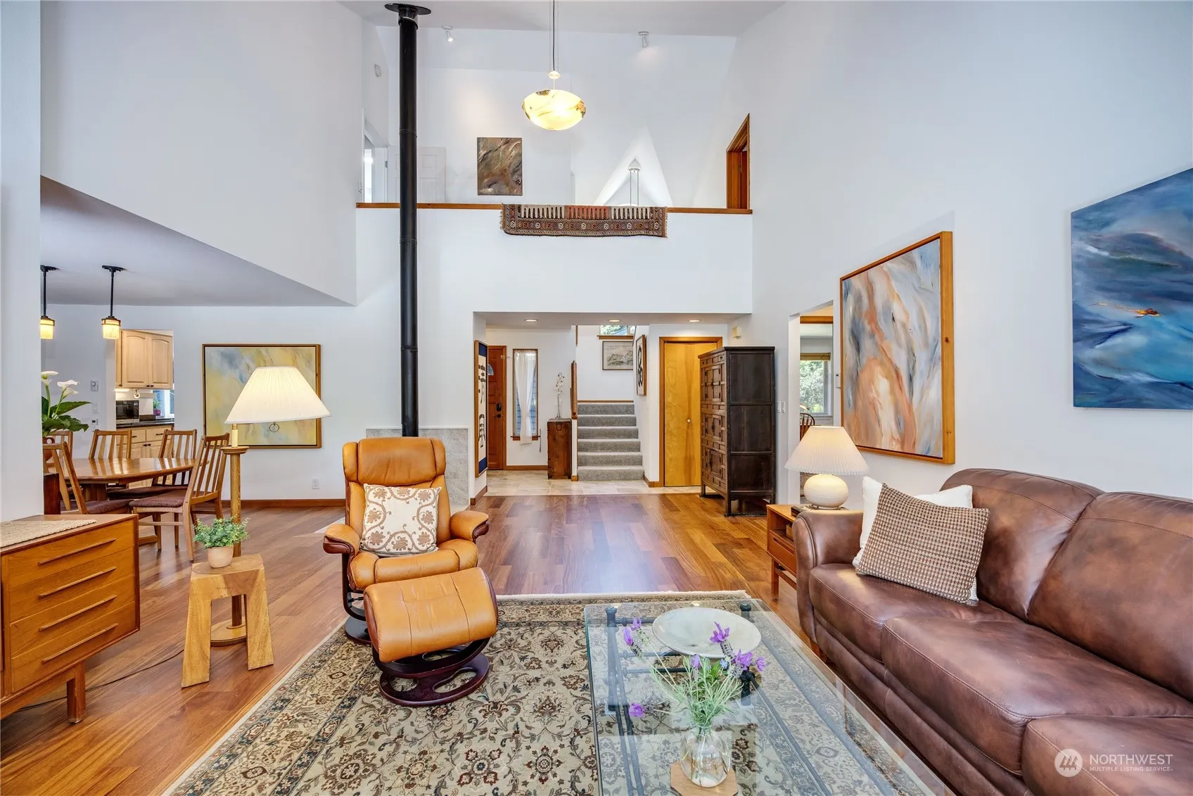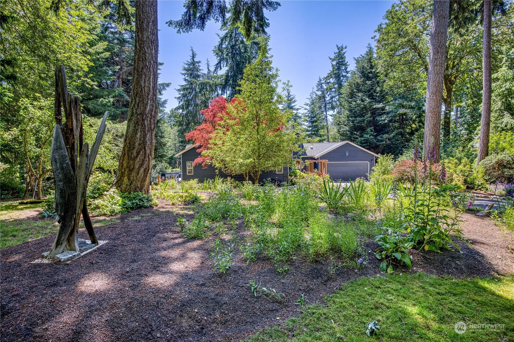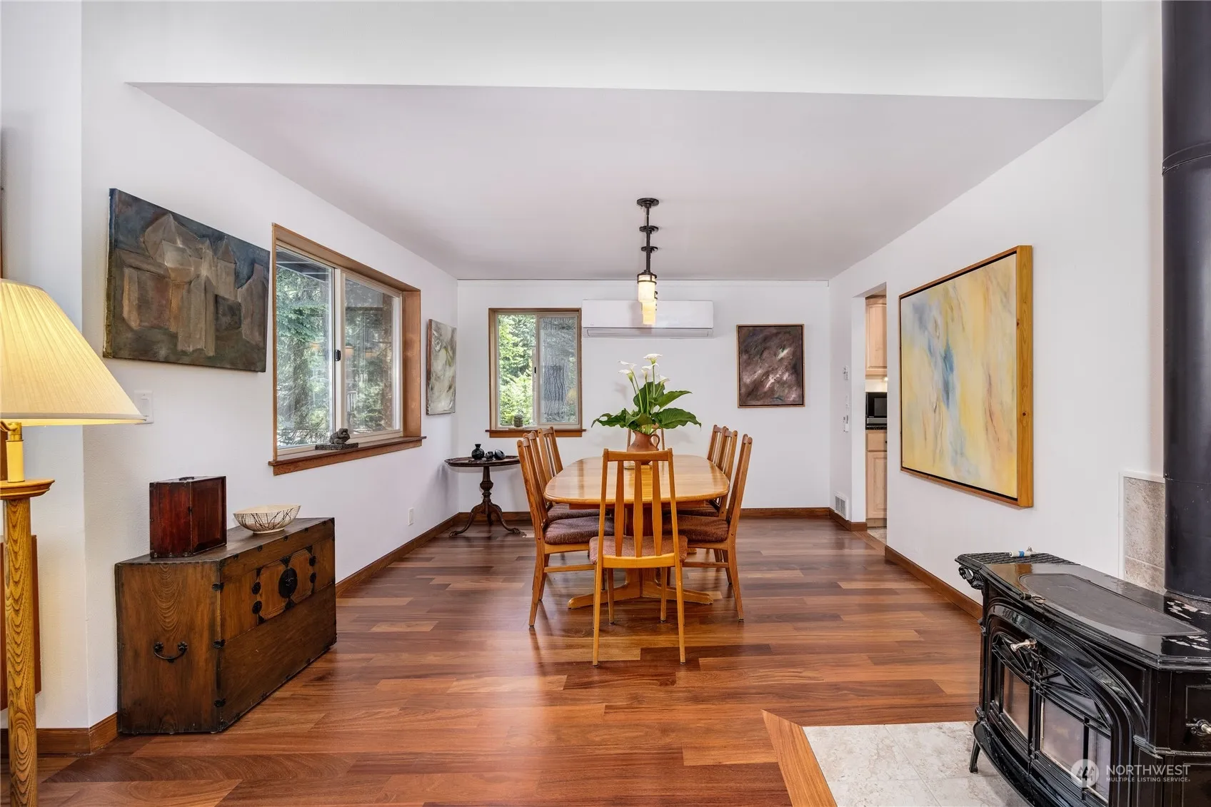 With easy access to town, and everything Bainbridge, this property promises serenity inside and out. Featuring the perfect blend of modern living, this architecturally interesting home boasts an expansive design with abundant light, generous ceiling heights and gorgeous teak floors. As you enter the home, large windows and a backdrop of greenery with lovely views of the easy-care grounds invite you in. Main level features 2 spacious bedrooms, 1.5 baths, living, dining, kitchen and cozy bonus/studio space. Upstairs, primary bedroom, ensuite bathroom w/ spa amenities, reading loft and balcony plus a home office. A Vermont Castings woodstove, oversized wrap around deck and 2 car garage completes the package. Island lifestyle at its best!