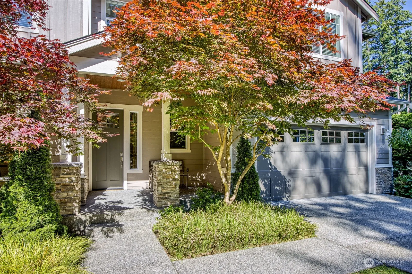 Bainbridge Island at its best. Come experience the beauty of this sophisticated home. Enter to gorgeous hardwood floors, moving through the expansive great room with soaring ceiling, framed by large picture windows overlooking the sun-drenched gardens. Wonderful Chefs kitchen perfect for entertaining. The 2-sided fireplace allows for year-round enjoyment of your covered porch. The lovely home office is just down the hall. Upstairs, you find a spacious primary Suite with walk-in shower and closets, 2 additional generous bedrooms, and a full family room. Freshly Painted interior, new carpets. Quiet neighborhood, located on a cul-de-sac. Close to Winslow Shopping, Schools, & ferry. Impeccable move in ready home.