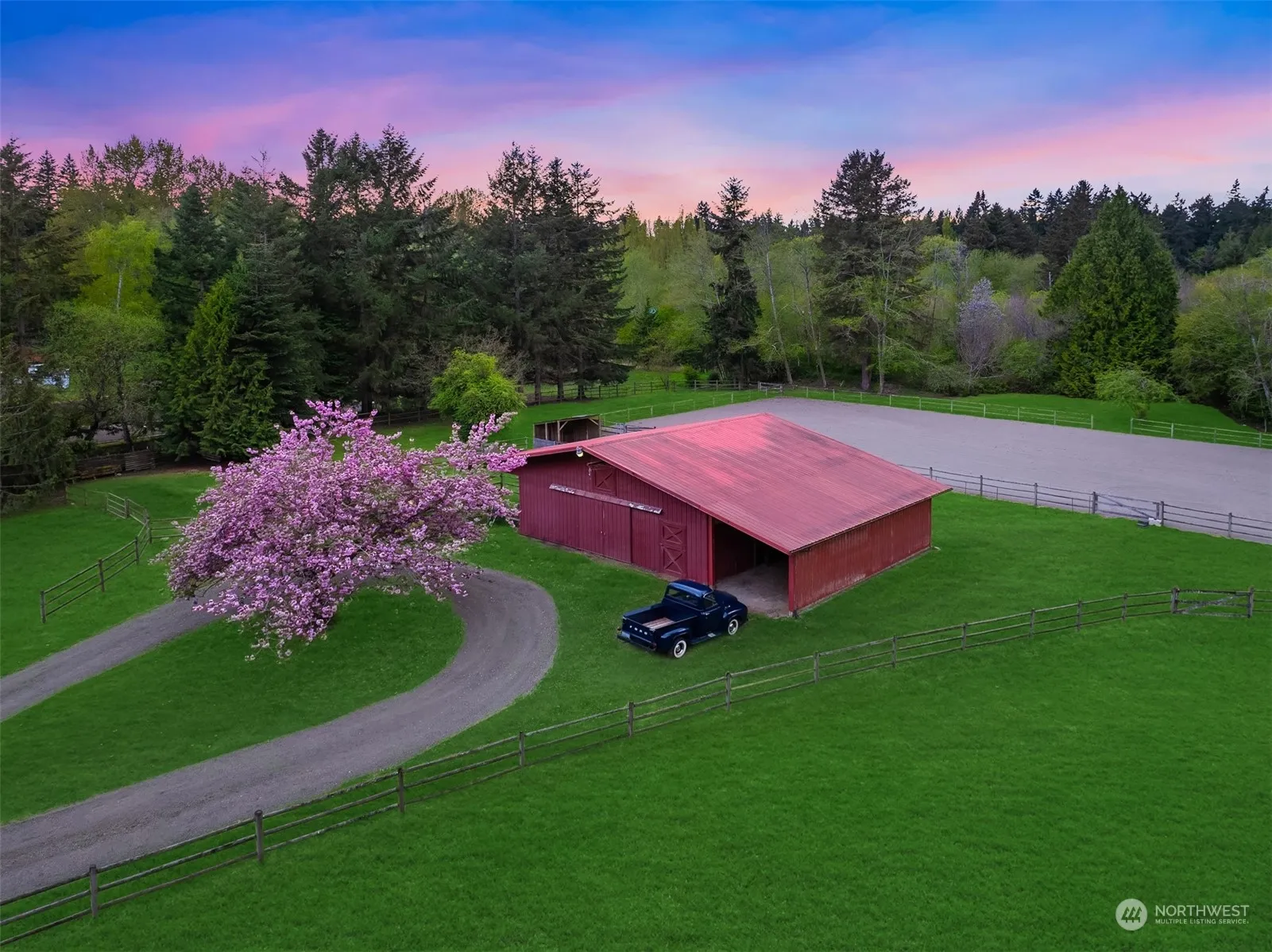 The most picturesque farm imaginable! 10 bucolic acres of ponds, pastures, barn, arena and a wonderful log home.The home is crafted of huge Spruce logs, and boasts a timeless river rock wood burning fireplace. 3 bedrooms, 2.5 baths. Gorgeous Ipe entertainment deck, and charming balcony overlooking the largest pond. Have you been dreaming of riding out from your farm onto acres of trails? The farm is backed on two sides by Manzanita Park, full of trails and adjacent to the Bainbridge Saddle Club. Classic three stall barn with heated tackroom, and sizable hayloft. Covered parking for 2 vehicles on the side of the barn – Horse trailer, truck, boat? 10 min to the quaint community of Winslow & Seattle ferries. Live the lifestyle you’ve imagined!