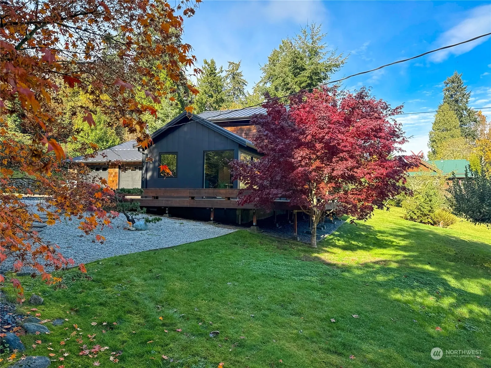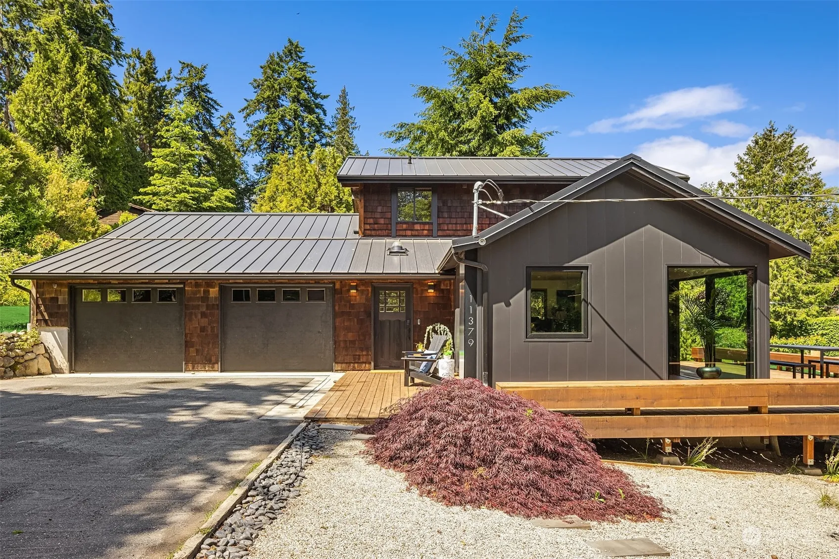 Sunny, elegant water view retreat in coveted Rolling Bay. The entry, kitchen, and dining room were built from the ground up in 2024 and feature high-end lighting, Leicht cabinets, Miele appliances and heated Inalco Spanish porcelain floors. Kolbe glass sliders open to a wrap-around deck. Updated garage doors, metal roof and heating/cooling system add capital value! The main fl offers a living room w/oak floors, a bedroom, and full bath. The second floor includes bedroom #2 and a primary bedroom with a vaulted ceiling, water view, and updated ensuite bath. Enjoy your private orchard’s cherry, plum, and apple trees. The 832 sq ft garage has a large shop, vaulted ceiling and loft. Stroll to the public beach, a restaurant, cafe, and mercantile!