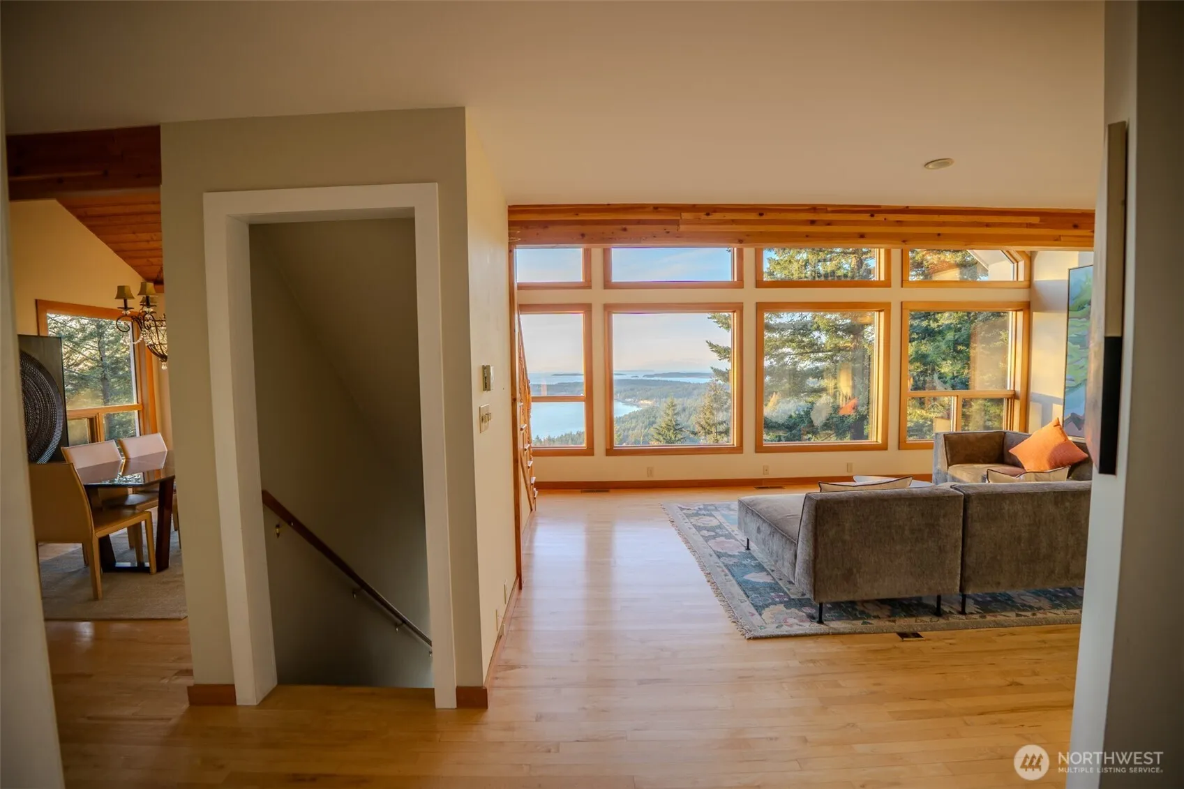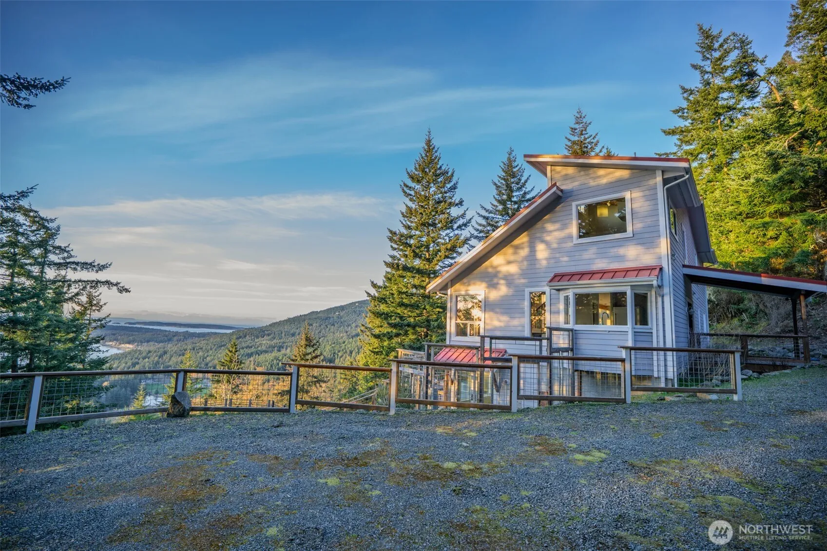 Jaw-dropping views take in the village of Eastsound and a peaceful meadow with pond in the foreground, giving way to distant islands, mountains, and the soft glow of the Canadian coastline at night. This 3-bedroom, 3-bath home on nearly 2 acres spans three levels with plenty of outdoor deck space for sunsets and entertaining. Flexible layout includes a loft primary suite with rooftop deck, main level living with high ceilings and 2 bedrooms, and a lower level great room, utility space with exterior entrance, office, and full bath, perfect for guests or creative space. Well-appointed throughout with timber frame carport, generator, fiber internet, and heat pump recently added. Conveniently located in the Orcas Highlands, minutes to Eastsound and Moran State Park.