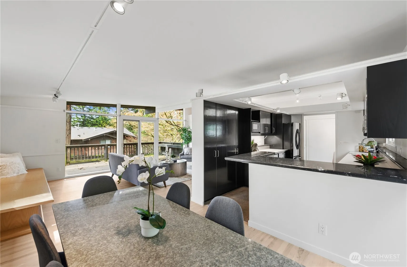 Tucked into a quiet Mid-Island enclave of just 10 homes with a private shared community pool, this classic midcentury modern offers timeless design. Sunlight beams into this home from the numerous walls of windows, creating a bright and inviting atmosphere throughout. This 2,840 sq ft residence features 3 bedrooms and 2.25 bathrooms. A spacious primary suite includes dual closets and a private ensuite bath. The light-filled main level showcases hardwood floors, a wood-burning fireplace, and a dramatic wall of windows that opens to a large deck—perfect for indoor-outdoor living. The kitchen offers abundant storage, an eat-in area, and seamless flow to the dining space. Downstairs, a walk-out lower level features a second fireplace, expansive windows, and a flexible bonus room ideal for a home office or gym. A standout feature is the attached 1-bedroom apartment with its own kitchen, living and dining areas, walk-in closet, updated tiled 3/4 bath, and in-unit washer/dryer—ideal for guests, rental income, or multigenerational living. Additional highlights include air conditioning, a 2-car carport with EV charging, and two large storage rooms. The fully fenced yard feels like a park-like setting with mature landscaping. Situated on a 9,630 SF corner lot with quick access to I-90 and top-rated Mercer Island schools, this home blends privacy, functionality, and midcentury charm.