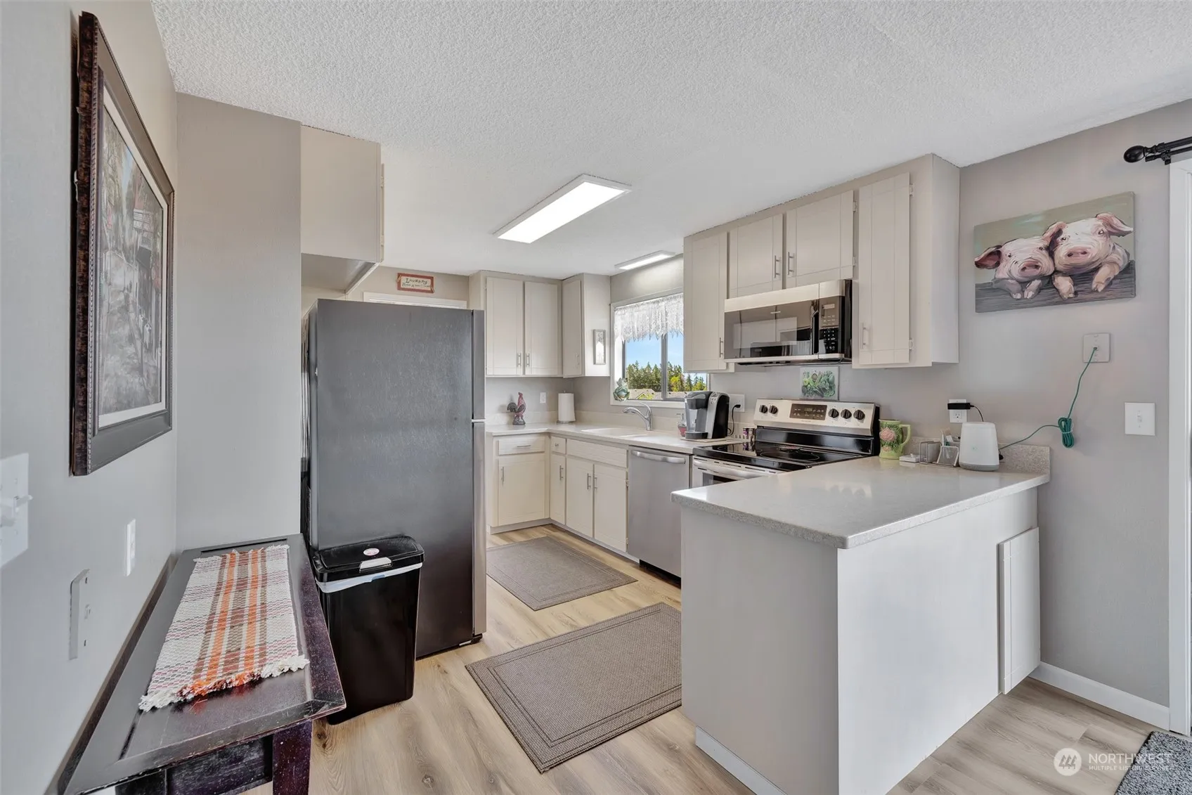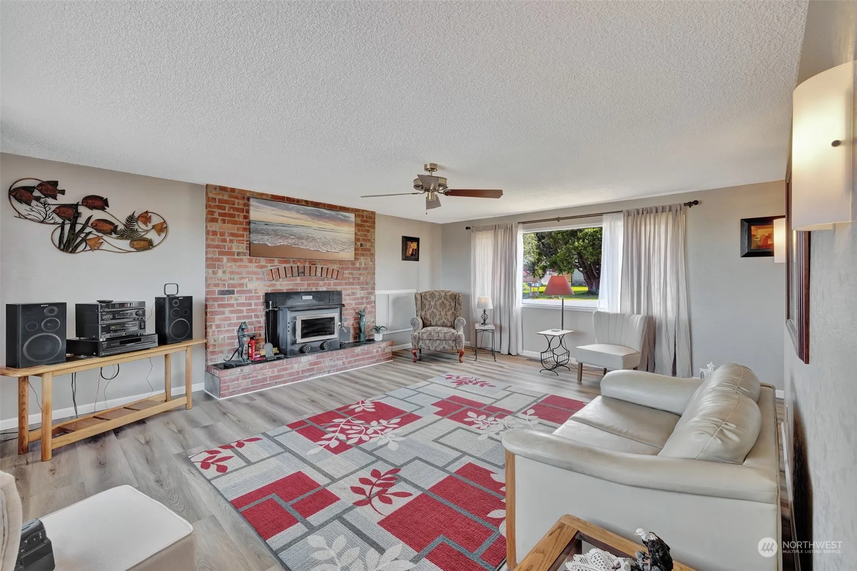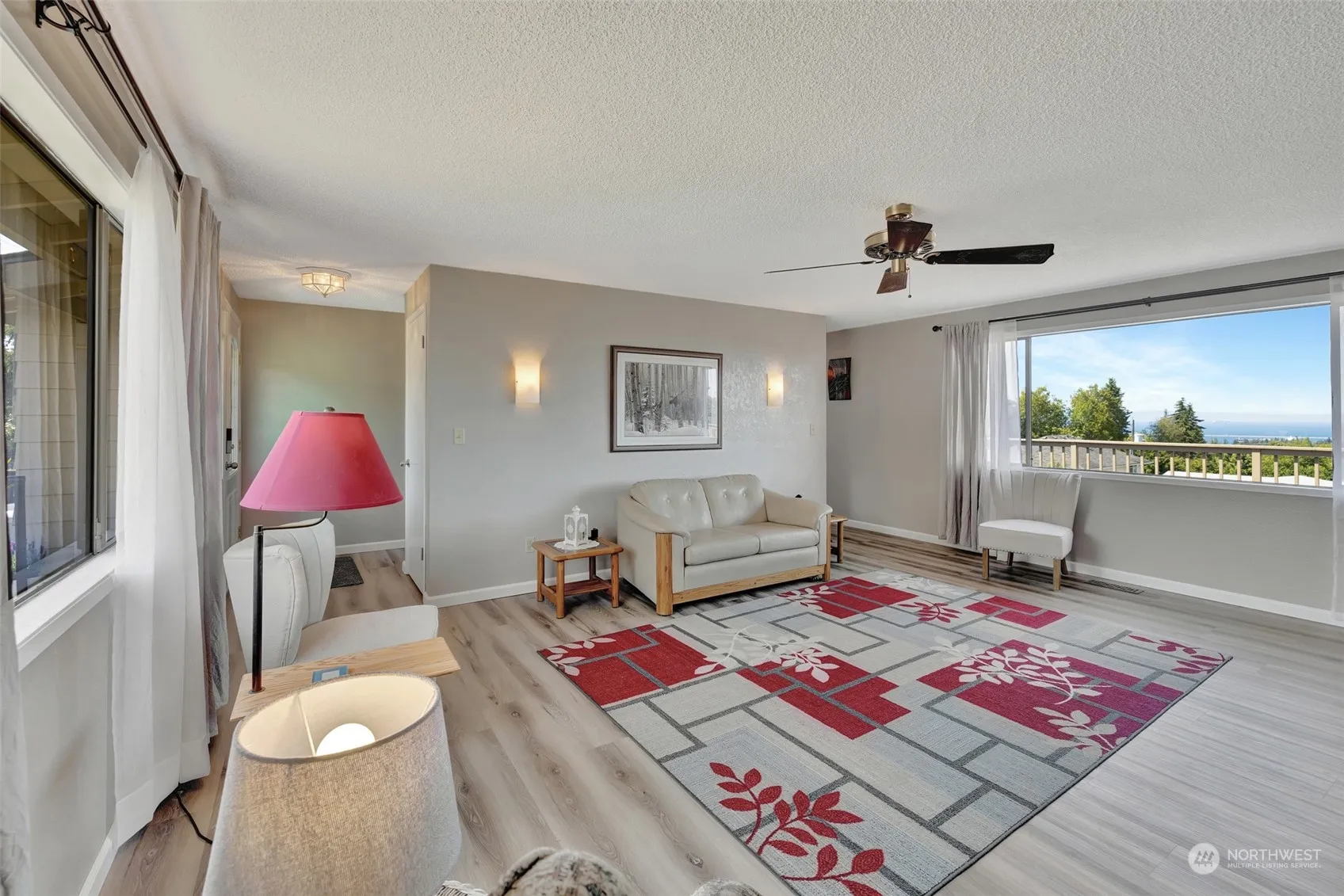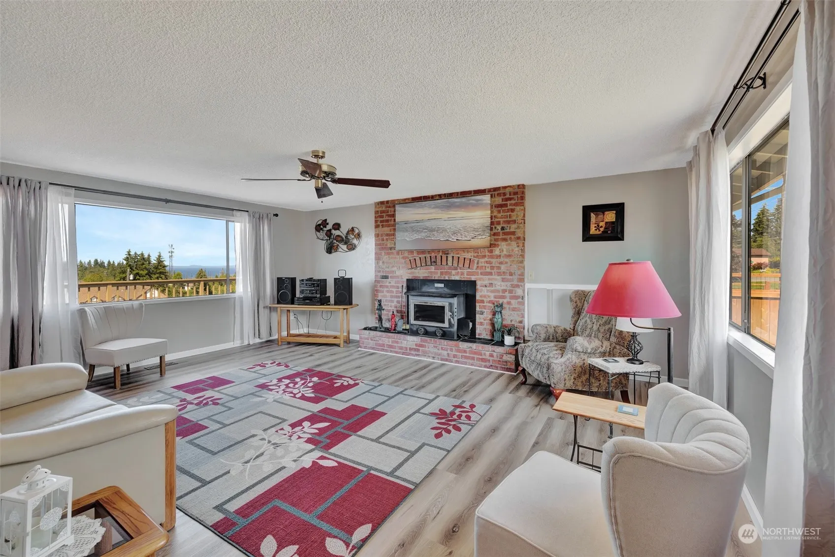 Located on the south side of Port Angeles, this updated home with 3 bedrooms and 3 bathrooms has a lot to offer. Enjoy a big view of the Strait of Juan de Fuca from the expansive deck that also serves as a carport for up to 4 vehicles. New flooring and paint makes this home move-in ready along with a new electrical panel and 1,752 SF. The primary bedroom is on the main floor. Two bedrooms are downstairs in the daylight basement with a sitting/TV room and a kitchenette. Extra storage/workroom in the basement. The backyard is fenced with access from alley. Fruit trees include cherry, apple, pear and peach trees. Room for a garden too. The wood fireplace provides ambiance while the heat pump does the work. All city utilities.