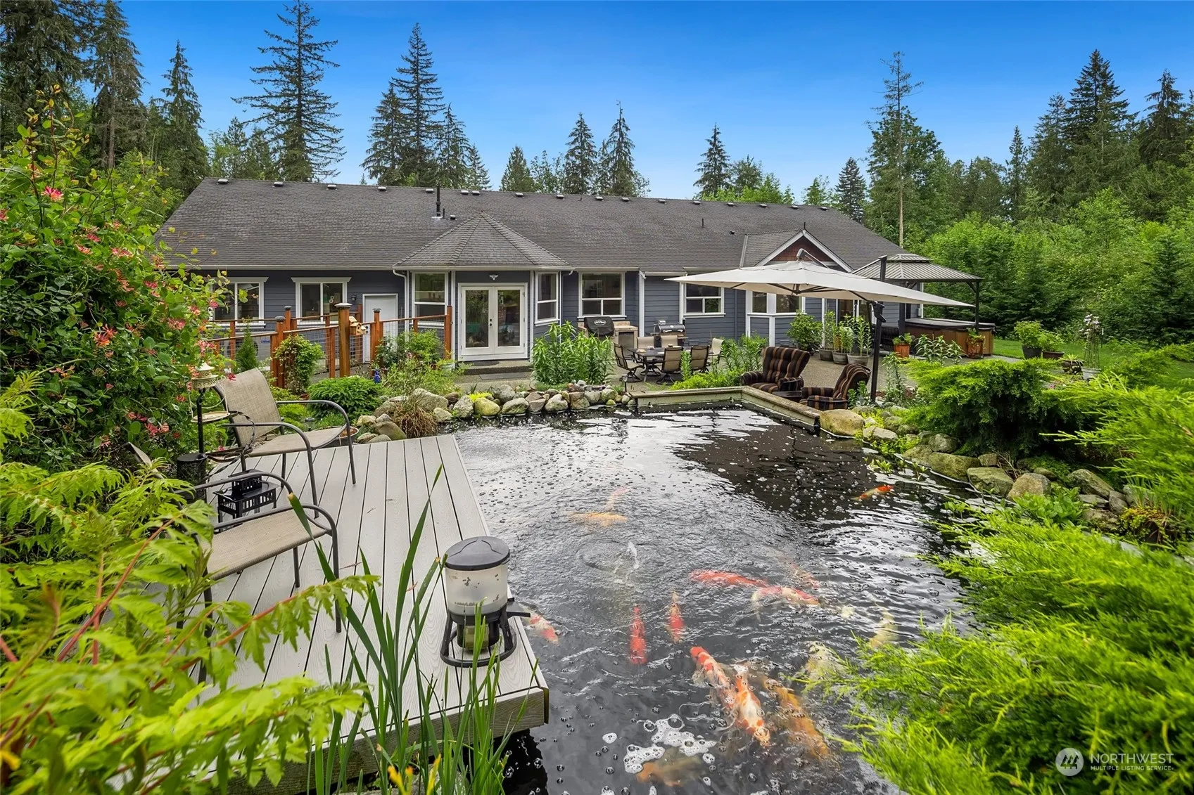 Discover luxury living on 5 private acres in Lake Stevens with this meticulously maintained home. Enjoy the comfort of a new heat pump and furnace ’23, a new well pump ’24, and solar panels ’23 with net metering. Wired for generator (included), and whole-house surge protection. The home features a great room, plus a Chef’s Kitchen with stained solid wood flooring. The primary 5-piece bath, updated in ’23, includes heated floors. The property boasts a stunning 12,000-gallon koi pond w/viewing deck, and a 36’x48′ heated shop that fits a 34′ RV/boat along with 5 cars, a 4-post 220v vehicle lift, a loft, circulating fans and a separate meter. Outside, enjoy a covered RV pad, garden shed, outbuildings, 8-person hot tub with LED lighting.
