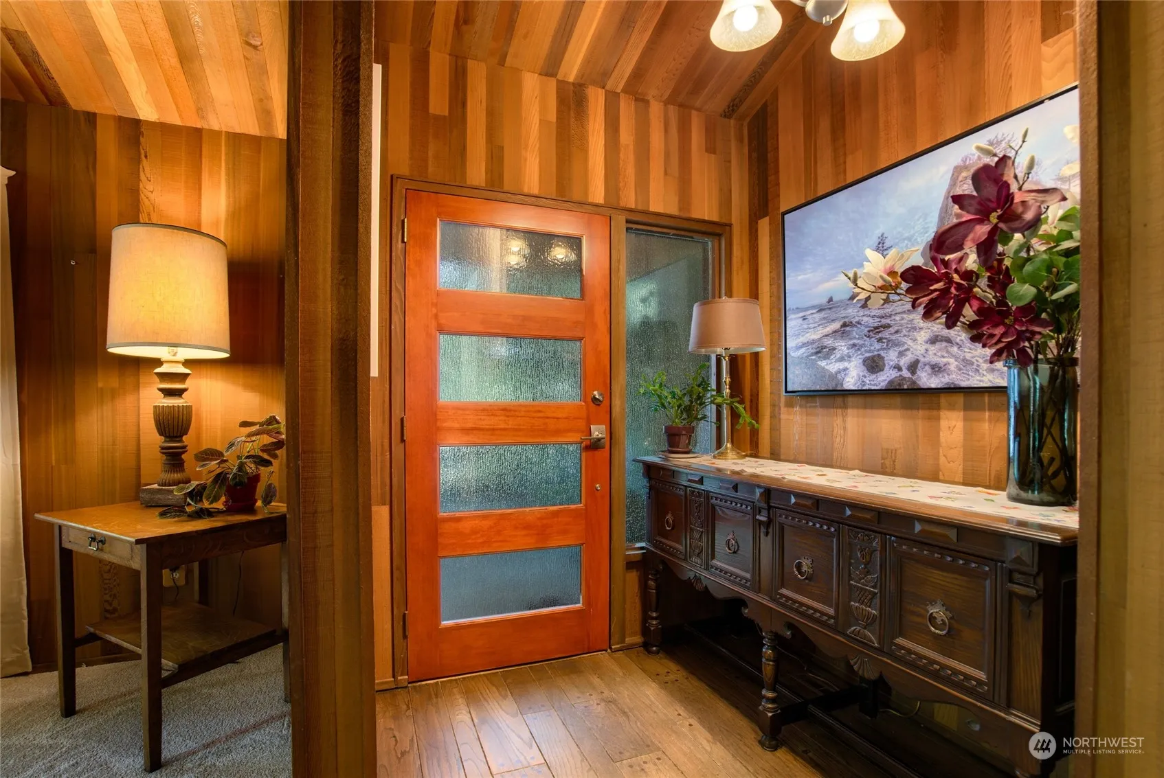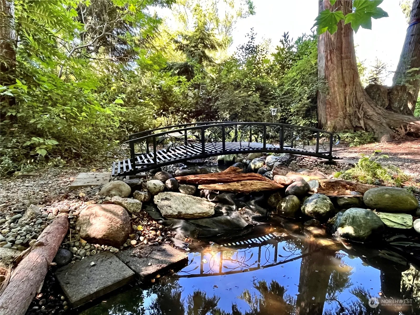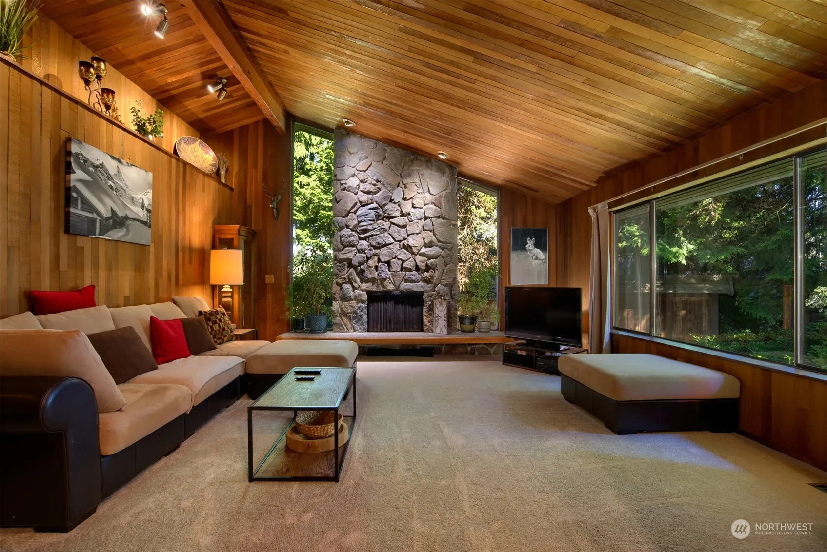 Classic updated mid century modern home! Unbelievable soaring vaulted living room ceiling, featuring a grand stone fireplace. With retaining the original features, there is new carpet, tile floors and light fixtures throughout. The large kitchen radiates lots of light, preserved cabinetry, new counters, sink, stove top, eating bar…and dining area. Huge oversized primary is en-suite w/remodeled bath, new tiled tub surround, counters and walk-in closet. Two nice sized bedrooms/remodeled guest bath. Wall of windows w/slider to patio and hot tub. Lets walk outside…entertain out back in the 14×16 gazebo surrounded by cedars, ferns, trails to the pond and cute little bridge! Just relax and meditate in the glam shed! Its magical! Fenced yard!