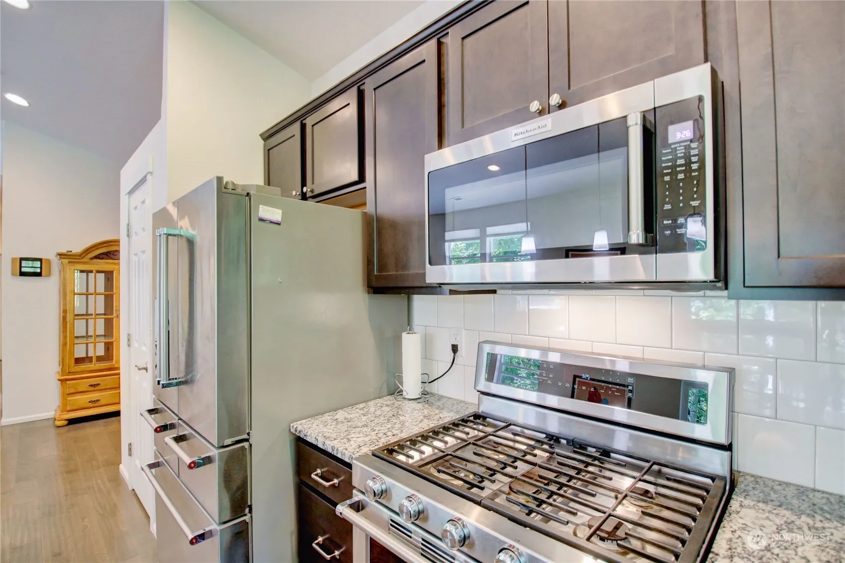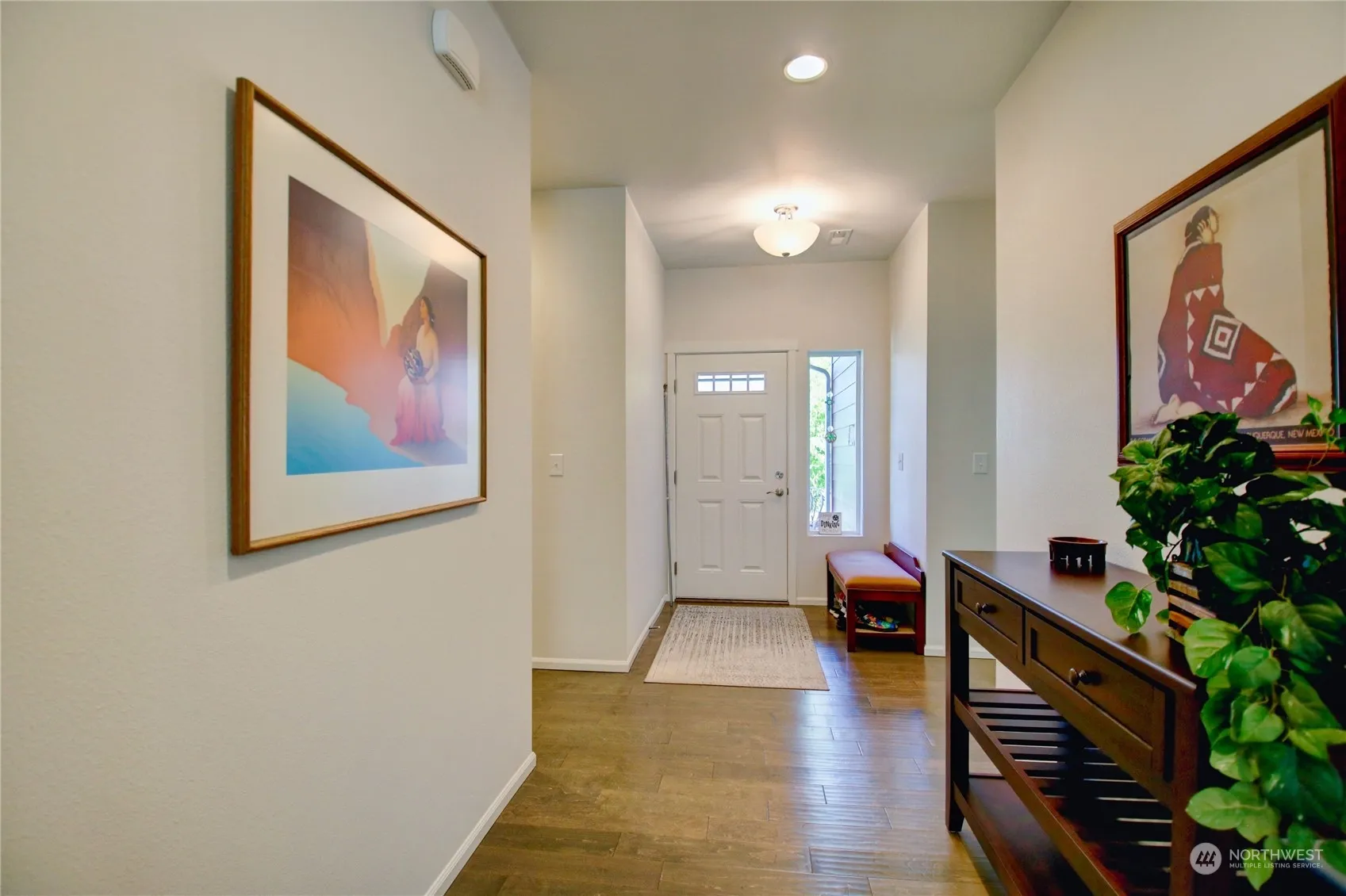 Discover luxurious living in Woodside 55+Comm – 1490 S.F. 1-level home features 3 bds, 1.75 bths. Open concept w/ vaulted ceilings, gas FP, ceil. fan. Kitchen shines w/ granite counters, soft-close cab./drawers, isle w/ eating spc, KitchenAid SS appliances. Prime bdrm w/ rc black-out blinds, en suite bath, dbl sinks, private shower/toilet, & lg w/i closet. Clever 3rd bdrm w/ barn drs, perfect for office/crafts/or..? Hall closet, util rm, 2-car garage w/ pull-down attic access complete this home. Sits on dead-end St. w/ lush greenery on 2 sides for semi-seclusion. Backyard features patio, hot tub, gas stub for BBQ, & room for patio furniture…all-day enjoyment. New Raintree irrig. system. HOA maintains exterior/landscape. Clubhouse/trails.