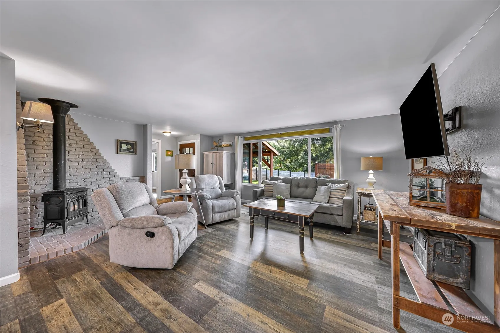 Remodeled single level home 5 min from the public boat launch on Big Lake! This beautiful home features 3 beds, 2 baths, open concept living room w/ cozy freestanding gas stove that heats the whole house. Bonus room currently utilized as an art space. Guest bedrooms equipped with radiant heat in the ceiling. The primary has a gorgeous ensuite w/ walk in tile shower & double shower heads and walk in closet. New LVP flooring, carpet, vinyl windows, granite counters, stainless appliances & farmhouse apron sink, tile floor and new cabinets. Outside you will find an awesome outdoor living space equipped w/ a covered deck, sauna, firepit, garden shed & woodshop out front. The backyard is fenced and very private. Ample parking w/room for an RV!