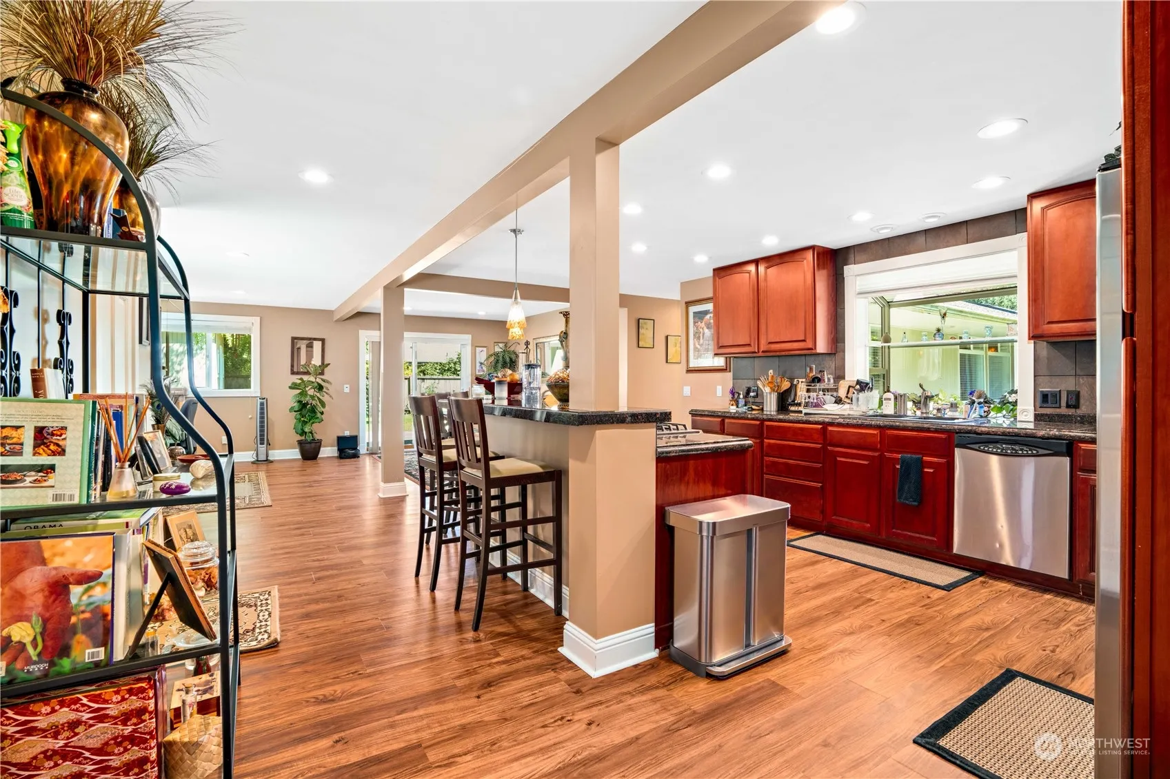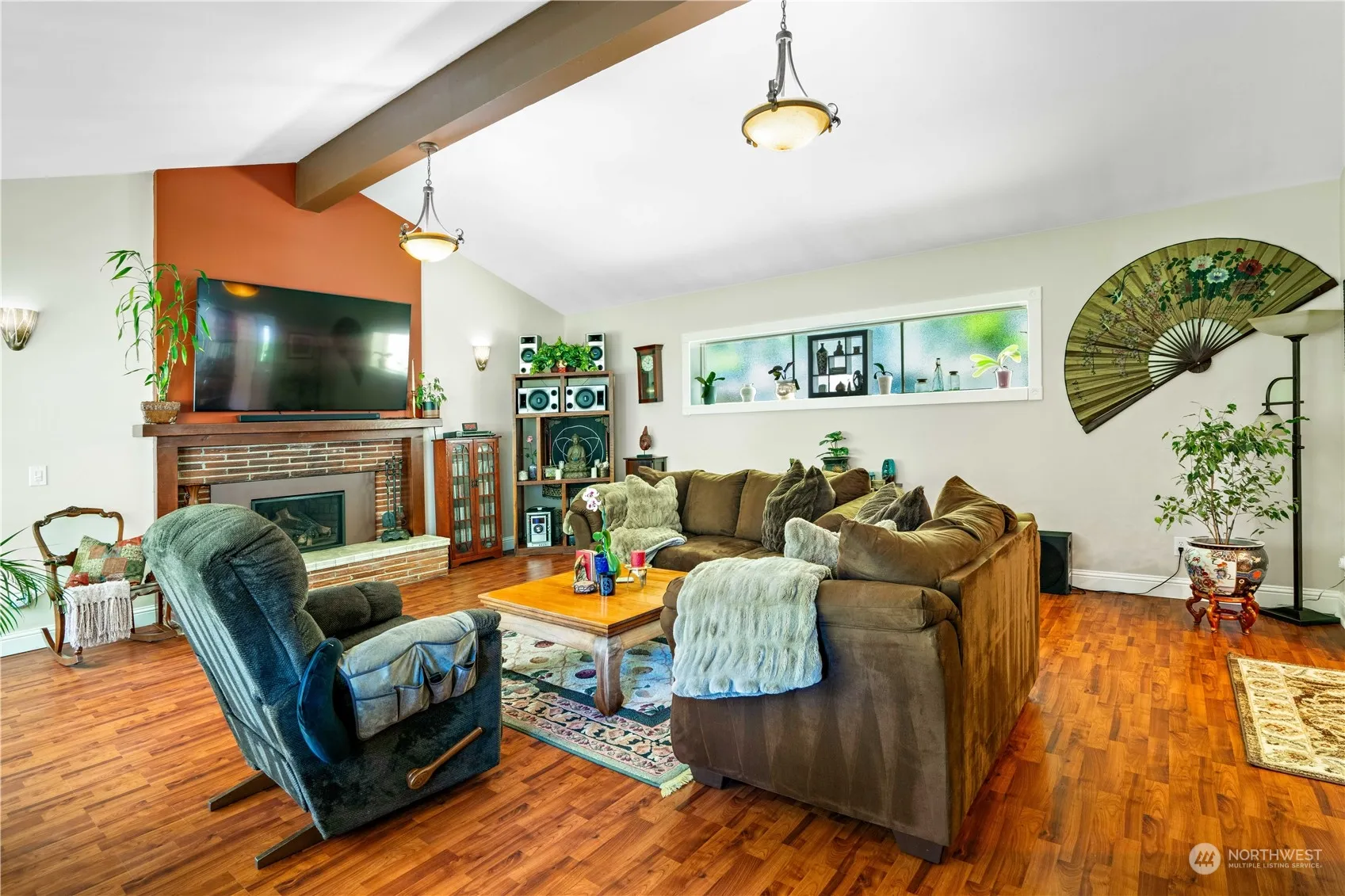 Nicely kept Rambler with vaulted ceilings situated on large fenced level lot. Inviting living room with gas fireplace. Large kitchen with dining table. Level fenced lot with storage shed. Well maintained yard. Close to many features, including Pfingst Animal Acres Park, Eagle Scout Park, LFP Towne Center, Burke Gilman Trail, Lyon Creek Waterfront Preserve, schools and bus lines.