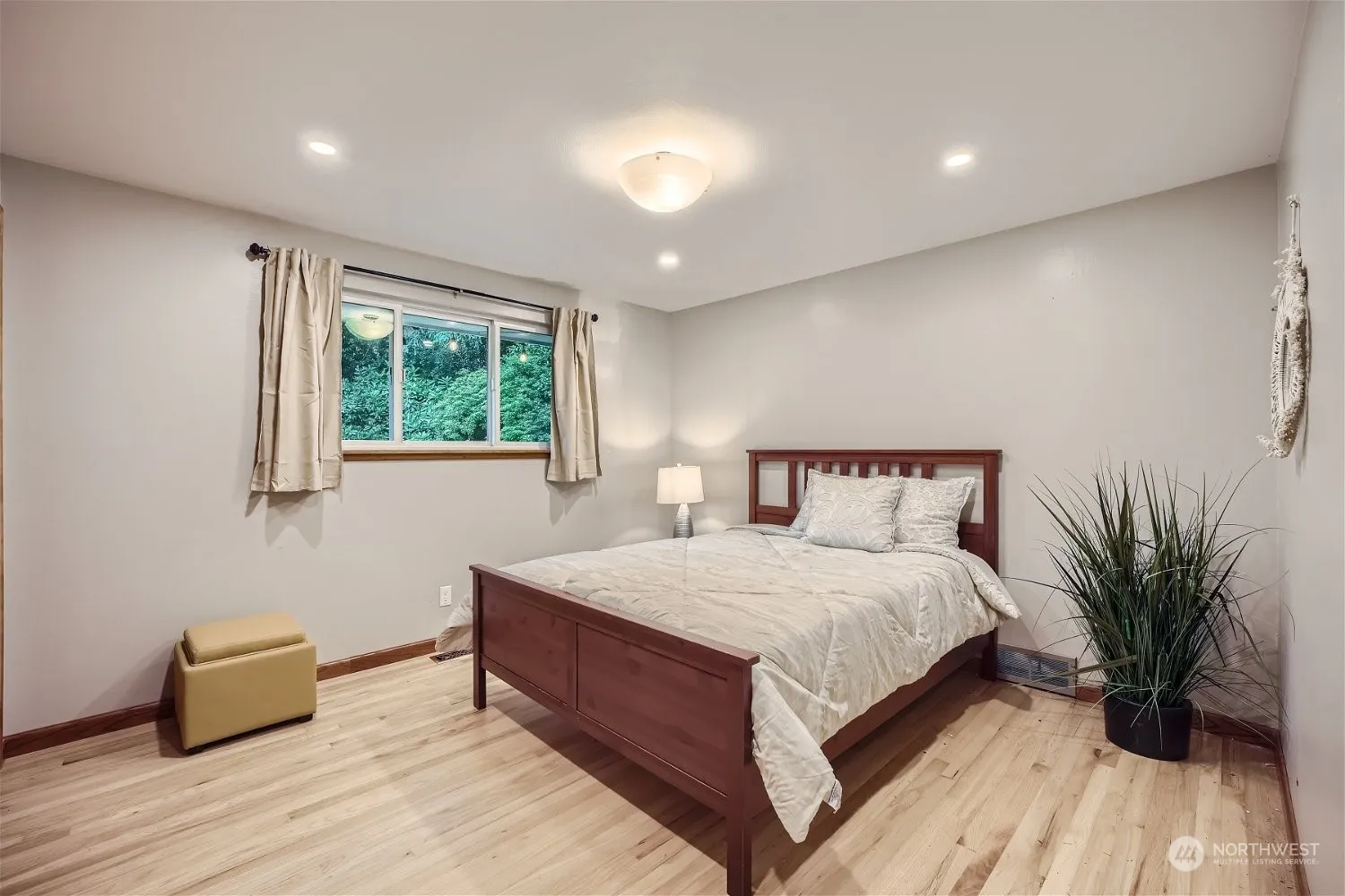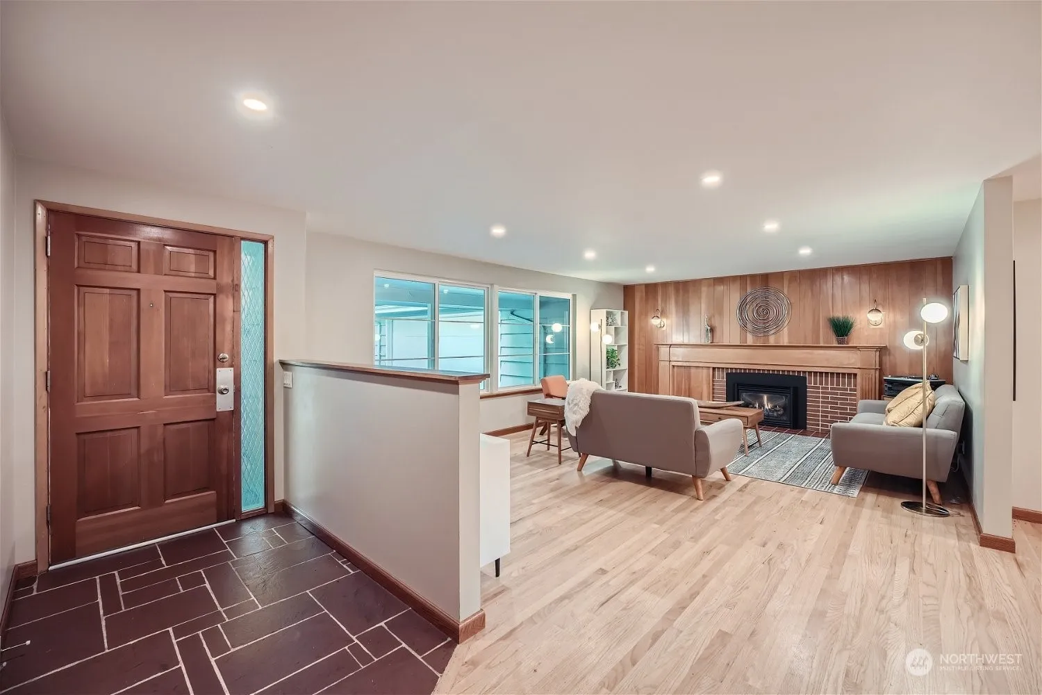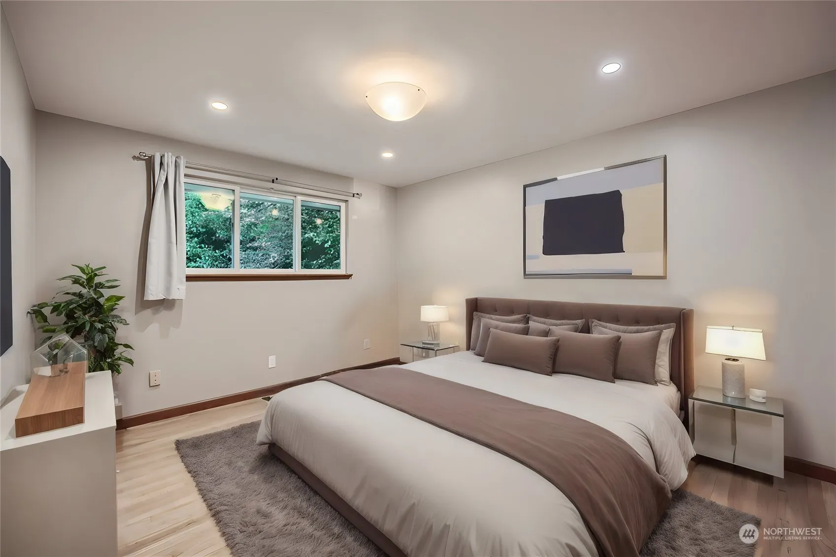 Rare mid-century modern rambler on a SW facing, oversized corner lot. This home has over 2100 square feet of living space and a private, park-like back yard. 4 generously sized bedrooms & 2.25 baths on a quiet cul-de-sac one block to LFP Elementary. Perfect floor plan offers living room, dining room, and huge entertaining space. Large primary bedroom w/ ensuite bath. Big 2 car garage, newer paint inside & out, new Milgard windows, gleaming real hardwood floors, gas heat, updated electrical box & lighting fixtures throughout. Desirable Shoreline Schools, possible access to the Lk Forest Pk Civic Club, boat launch w/ membership. Close to Local 104, Third Place Books, Burke Gilman Trail, Lake WA, I-5 & 405. Seller procured inspection.