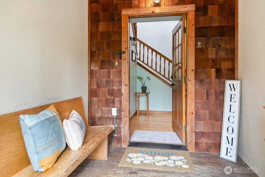 Tucked away on a peaceful dead-end street, this charming one-of-a-kind home sits on 2.5 private acres surrounded by mature trees and garden space. A covered front porch welcomes you to an open entry with high ceilings and an exposed staircase. Upstairs features the primary suite with a private deck, vaulted ceilings, walk-in closet, jetted tub, and ensuite bath, along with two additional spacious bedrooms and a full bath. The main floor offers open & spacious living areas filled with natural light. The inviting kitchen features an extraordinary amount of cupboard space, an island with a gas stovetop, an eating area, plus a separate dining area perfect for gatherings. Step outside to relax or entertain on the deck overlooking the territorial setting. The property also includes ample parking, an outbuilding, and a detached garage with a loft, ideal for hobbies, storage, or recreation. This home offers a wonderful blend of privacy, space, and convenience just minutes from town, with opportunities to personalize and make it your own.