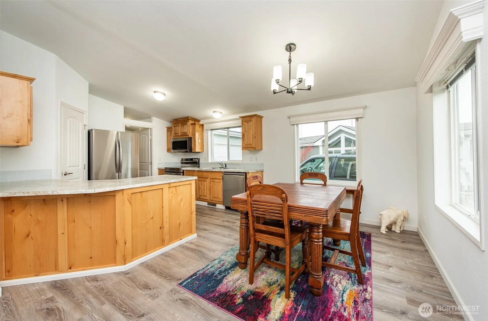 Majestic Olympic Mountain Views! Step inside to an open and airy living space, enhanced by vaulted ceilings and brand-new light fixtures and luxury vinyl plank flooring that extends throughout the home. The kitchen boasts all new stainless steel appliances. 2 Bedrooms PLUS office/den with French doors. The spacious primary bedroom is your private sanctuary, featuring an attached oversized primary bath complete with a step-in shower, double sinks, and abundant storage. Outside, you’ll find a large backyard, offering the potential to create a garden oasis or keep it low-maintenance—the choice is yours. Location is everything! You’ll enjoy the convenience of a desirable spot nestled right next to the Olympic Discovery Trail. This home is situated in a welcoming 55+ park in Sequim, WA, a top destination for retirees. Known for its mild, unique microclimate—often called the “Blue Hole”—Sequim receives significantly less rain than the surrounding areas, ensuring more sunny days for outdoor enjoyment. With world-class natural beauty, excellent healthcare facilities, a vibrant arts scene, and a friendly community, Sequim provides the perfect setting for an active, fulfilling retirement. Don’t miss this opportunity to embrace the low-maintenance, high-quality lifestyle you deserve!