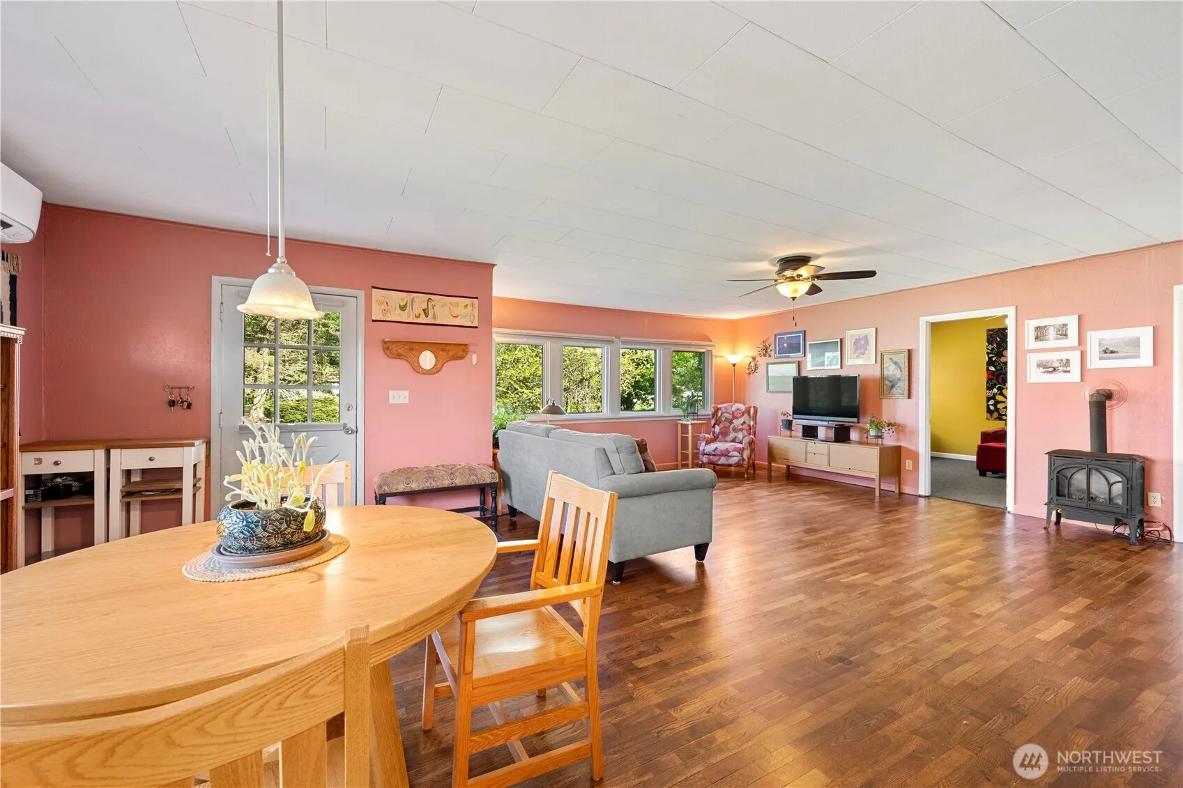 Charming Mount Vernon home in park-like setting with a country feel on a dead-end street – less than a 20 minute walk to downtown Mount Vernon! Original oak floors and cozy natural gas fireplace in the great room are enhanced by abundant natural light and an open, airy feel. Major updates include: Daiken Ductless Mini Split (2019), Renewal By Anderson double pane windows throughout (2023) with custom top down, bottom up blinds in great room. Recessed LED lighting in both kitchen and bathroom. Beautifully remodeled kitchen (2025) which offers a fresh, modern design with new appliances. Custom pantry with pull out shelves provide easy access to stored items. On-Demand tankless water heater provides an endless supply of hot water. Completely remodeled bathroom (2024) with walk in shower featuring top of the line rainfall shower head/handheld combo, separate sink and vanity areas. Set back on a quarter acre lot, the home boasts a stunning yard with a variety of mature trees including weeping willow, evergreen & maple; fruit trees including Italian prune & Shiro plum, apple & cherry. Gardening enthusiasts will appreciate the raised beds in the backyard, rain barrels for irrigation and ample outdoor space. Newer shed, Leaf Filter added to gutters, and new screen doors at front and back entries. RV parking with electrical hook-up. This is a home that offers warmth & functionality!