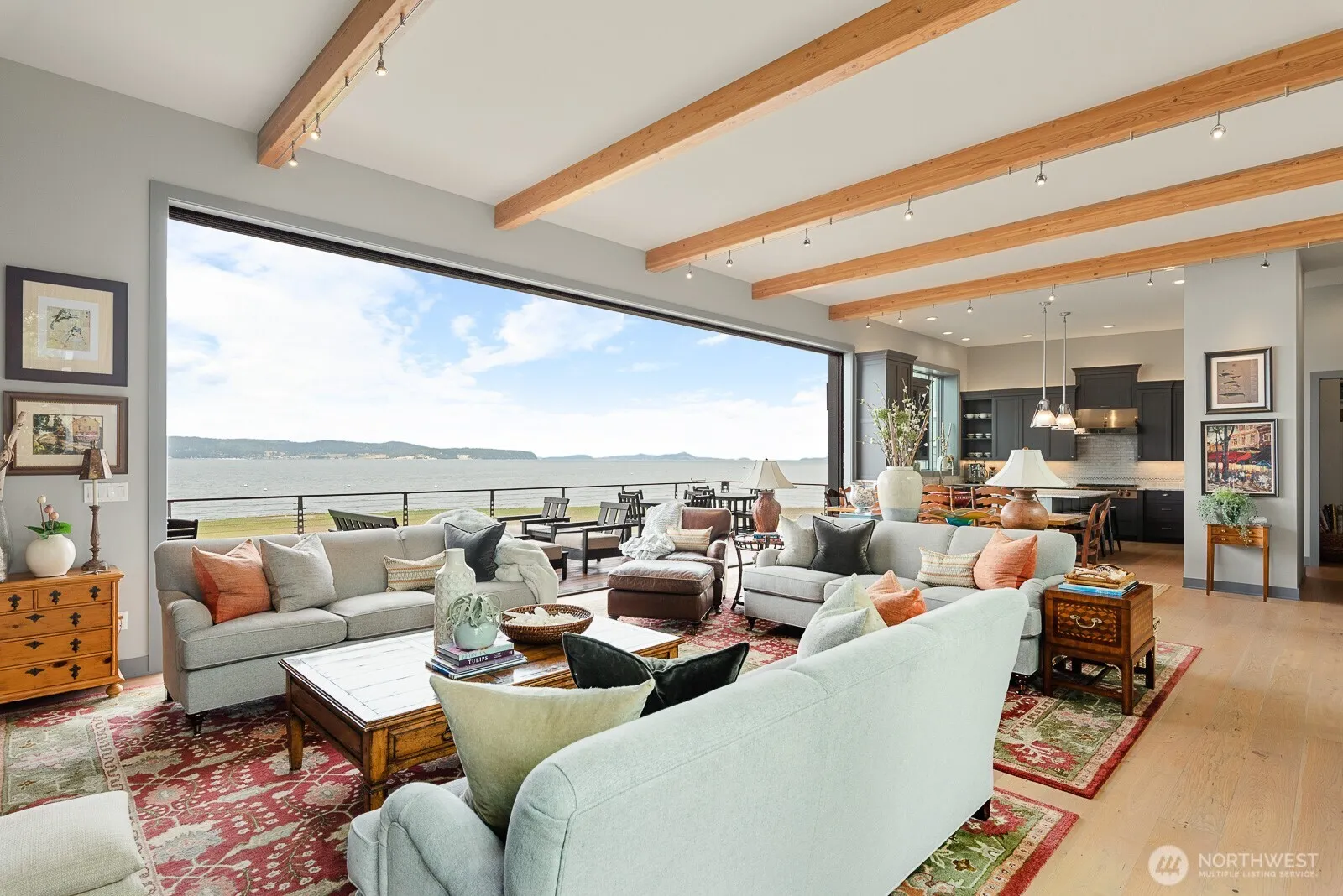 Extraordinary custom luxury estate on rare no-bank waterfront at the quick-access, most desirable, North tip of Camano Island’s Gold Coast. Just minutes to I-5 and an easy drive to the Eastside — no ferry required — this is walk-out beachfront living at its finest. Step from your Great Room directly onto the sand, launch a paddleboard, watch whales in the distance, or boat-up and tie-off in front of your home. Architecturally designed with no expense spared, the residence showcases 12’ ceilings and a stunning 28’ wide disappearing Fleetwood glass wall that fully opens the living space to the waterfront deck. Chef’s kitchen with Wolf and Sub-Zero appliances, honed marble countertops, full marble backsplash, hammered nickel sink & custom mahogany cabinetry. Main-level primary suite with 14’ ceilings, spa bath, limestone slipper tub & deck access with panoramic bay views. Upper-level features loft plus two oversized bedrooms with walk-in closets and water views from both bedrooms. Main level also offers an executive office with view and a bonus/exercise room–both which are flexible living spaces. Fifteen-foot ceiling garage accommodates indoor boat/RV parking. Metal roof, marine-grade finishes, Brazilian Walnut (Ipe) decking and fence, private shoreline with bulkhead tie-offs. No HOA. Allowable STR. Estimated $6M+ to reproduce at today’s costs, making this an exceptional value. A rare opportunity to own an irreplaceable, custom, walk-out waterfront estate. View the video!