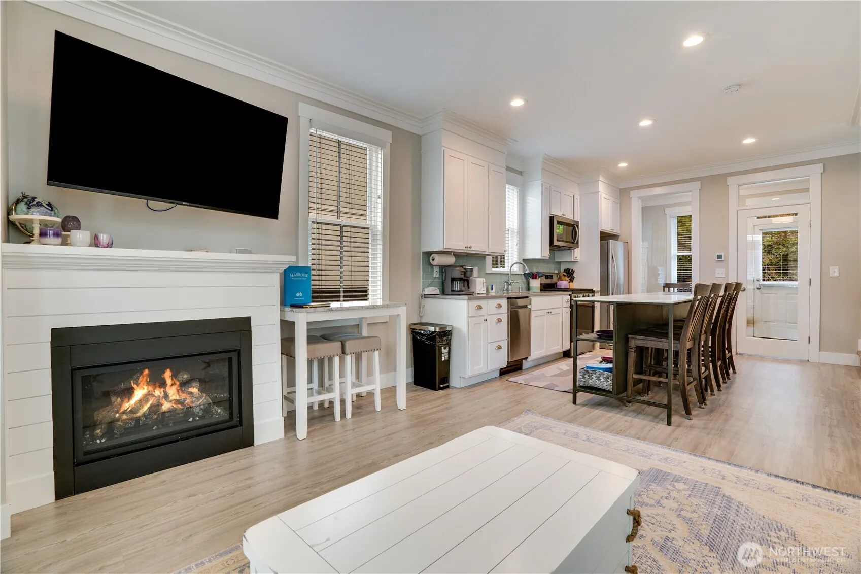 Welcome to Purple Pelican Paradise, a beautifully curated retreat designed for effortless coastal living in the sought-after community of Seabrook. The open-concept main floor features luxury vinyl flooring, a sleek kitchen with stainless steel appliances, and a welcoming living area centered on a cozy fireplace. Don’t miss the bonus/office space off the living area and half bath, too! Upstairs, two generous bedrooms and a full bath offer comfort and privacy, and the dedicated laundry adds convenience. Unwind in your private hot tub or enjoy a leisurely stroll to the Sunrise Pool & Fitness Center. With access to sandy beaches, expansive trails, charming shops, and resort-style amenities, this home blends style, comfort, and the best of beach-town living.
