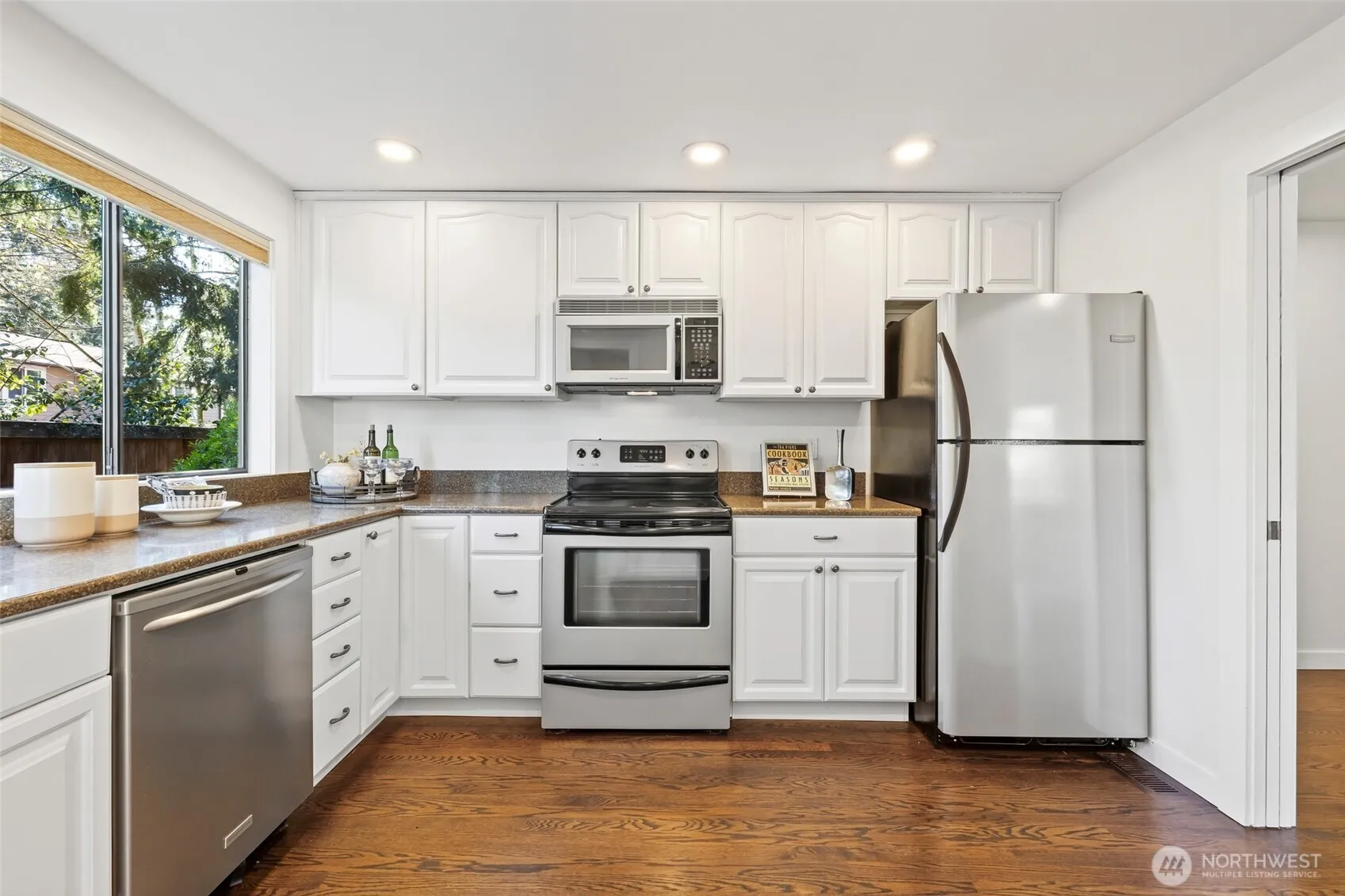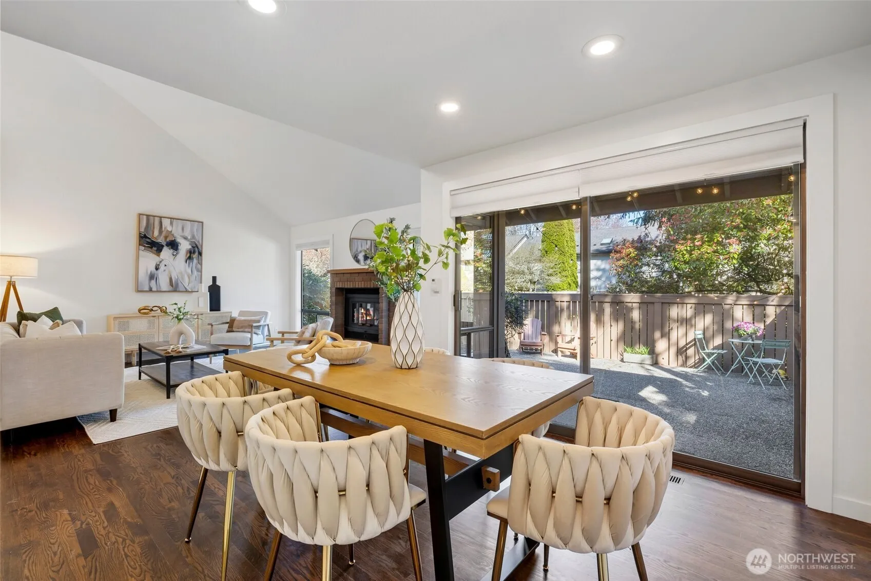 Experience a lock-and-leave lifestyle in this sun-drenched Craftsman townhouse, nestled within the serene Inglebrook community. Sharing only a garage wall, this 2BR/2BA residence lives like a single-family home, offering rare privacy and a sprawling floor plan just 12 blocks from Microsoft. Stepping inside, you are greeted by an open, airy layout featuring soaring vaulted ceilings, elegant oak hardwood floors throughout, and a large living room anchored by a cozy gas fireplace. Renovated kitchen boasting granite countertops, hardwood cabinetry, and a spacious dining area. A main-floor bedroom with a Murphy bed sits next to a full bathroom, easily converting into a gym or home office. The second floor is dedicated to the primary suite, featuring a steam shower retreat. Both bathrooms are beautifully updated with contemporary floating cabinets, sleek quartz counters and designer glass shower doors. HOA dues covers everything from siding replacement, exterior painting, roof/skylight/gutter replacement (2019) to landscaping, driveway upkeep, & master insurance w/earthquake coverage. Key highlights include fresh interior paint, central A/C, a new water heater (2026), and a 2-car garage with 2 driveway spaces plus 3 guest parking nearby. Step outside to a generous private backyard—a rare find that is perfect for pets, gardening, and outdoor enjoyment. Amenity includes club house, athletic court and gym. Mins to Crossroad mall and Interlake HS, and easy access to 520 and I-405.