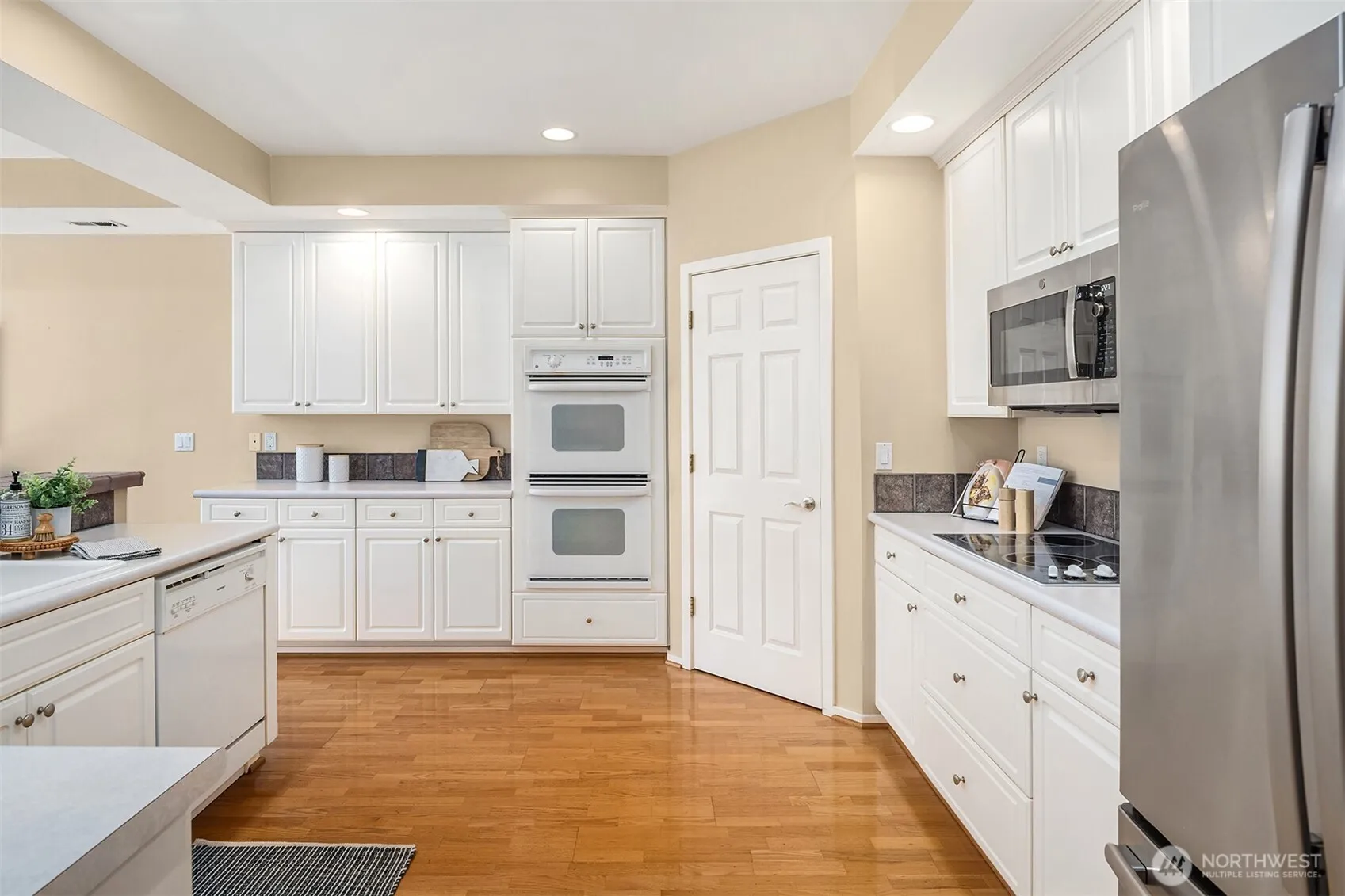 Welcome to The Arbors—a peaceful, verdant retreat you’ll love to call home. Nestled on a quiet dead-end street, this gated community offers privacy, security, and an unbeatable Bellevue location near Bannerwood Park. Surrounded by lush trees, this light-filled 2-bedroom, 2-bathroom home boasts Southern exposure, creating a bright, serene space. The single-level layout is designed for comfort and versatility, featuring a bonus room perfect as a home office, den, or entertainment space. The spacious white kitchen provides ample storage, a full pantry, and room to explore your culinary talents. The open dining area flows into the great room, where a gas fireplace and large South-facing windows create a cozy yet vibrant atmosphere. The private patio—accessible from both the great room and primary suite is great for morning coffee or evening gatherings. The primary suite has a walk-in closet, linen storage, dual sinks, and a separate commode room for added convenience. The second bedroom, complete with dual closets, is next to the full hall bath–ideal for guests. Perfectly positioned between Downtown Bellevue and Factoria, you’ll enjoy easy access to freeways, shopping, dining, and urban conveniences, all while savoring the calm of a park-like setting. The community offers ample guest parking, two secure garage spaces, three storage areas, and elevator access. This home is primed and ready for its next chapter. Don’t miss this!