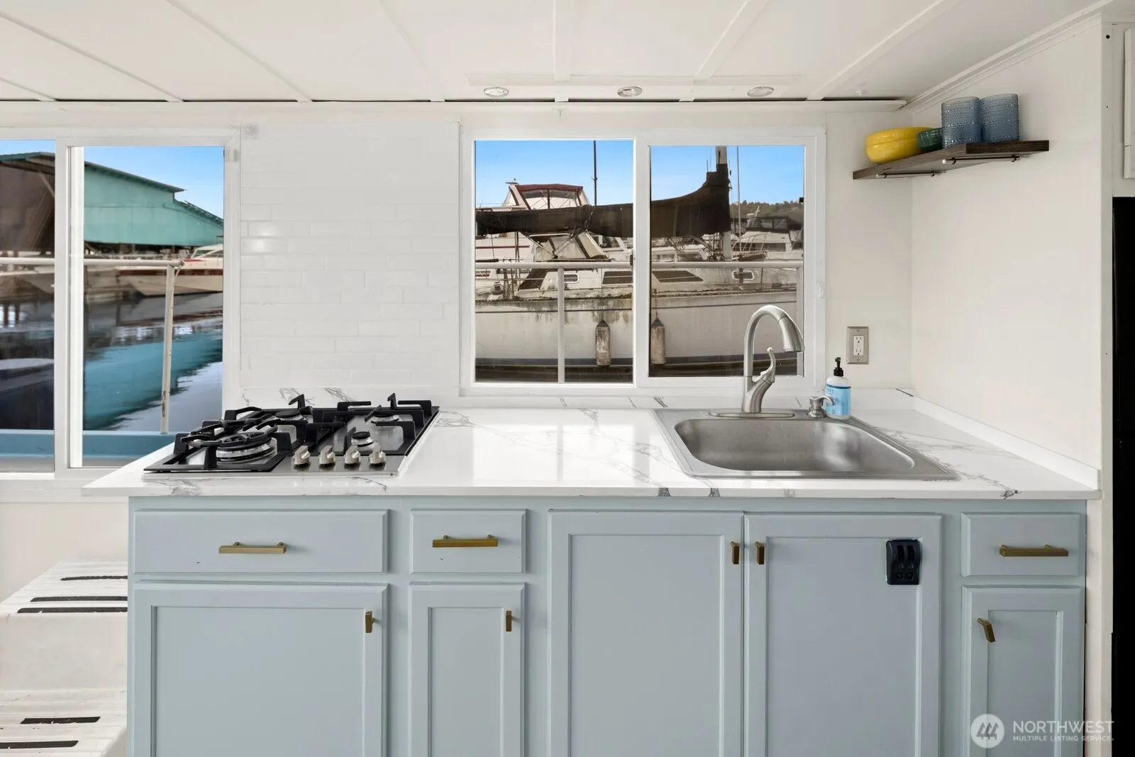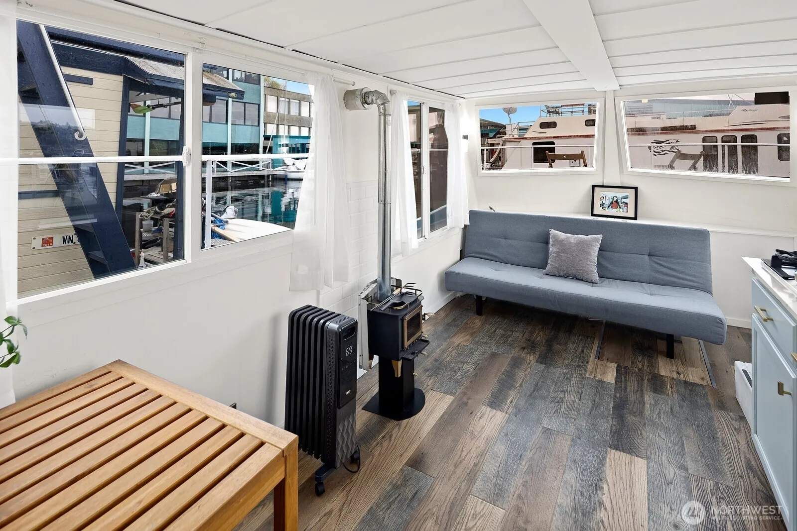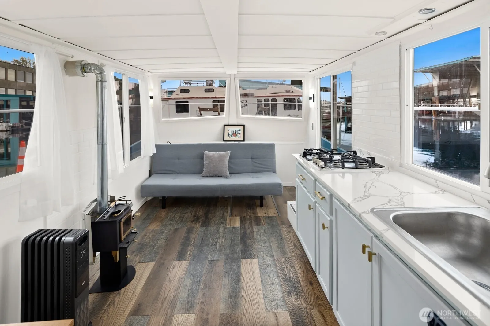 Every day will feel like a vacation in this recently remodeled houseboat! This classic Cruise-a-Home features new appliances, new counters, a new toilet, new electric panel, pex water system, and fresh paint. In the winter, enjoy a cozy wood-burning stove. In the summer, enjoy your rooftop deck. Well-located gated marina with onshore bathrooms and a deli. Enjoy direct access to the Cheshiahud Lake Union walk/bike path, and you have easy access to SLU and Fremont. Off-street parking available for a modest RPZ permit fee. This houseboat has been surveyed. The city FOWR plaque of 40 x 12 provides replacement option in the future to build a modern houseboat with the same footprint. No rentals allowed at this marina. Ask your agent for the current moorage fee. It includes electricity, water, and garbage.