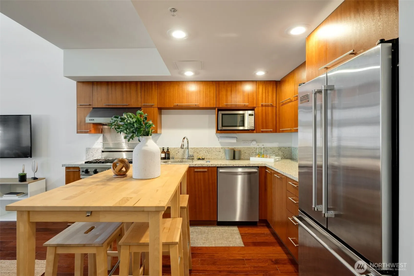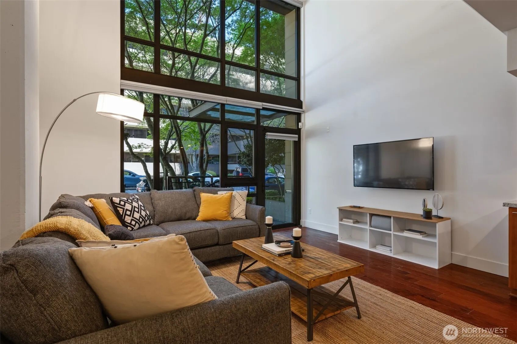 Luxury loft at Gallery Condominiums in Belltown. Only one of four Live/Work opportunities in this amenity rich community perfectly positioned near Seattle’s iconic landmarks. Convenience and quality shine with a double height window wall and two entrances into this spacious two level open living layout. Street level entry with a gated patio surrounded by lush foliage. Soaring ceiling height and a dramatic window wall show off this impeccably maintained one bedroom loft with motorized shades, hard surface flooring on the main level and A/C throughout. Large open kitchen with tons of cabinet storage, slab counters, Viking appliances and room for a prep island and eating bar are the backbone of this gracious living space. Entertain, relax, work from home, do it all in this flexible floorplan with a convenient half bath and interior entry on the main level too. Upstairs lofted bedroom has plenty of space for a king size bed and desk, double closets, w/d, and an ensuite double vanity bath. Garage parking and storage included. Gallery offers first class amenities that include 24/7 concierge, rooftop decks, owner’s lounge, fitness center, fido washing/relief zone and 2 guest suites. Ideally located near the new Waterfront Park, Sculpture Garden, Pike Place Market, Space Needle, Climate Pledge Arena; with tons of food, drink and services at your doorstep.