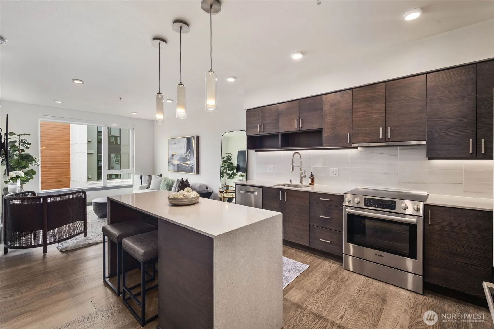 Live luxuriously in this FULLY FURNISHED 1-bedroom + den on the 5th floor, featuring smart lighting, a custom walk-in closet, and a flexible den for a home office or guest retreat. The open-concept kitchen boasts a quartz waterfall island, stainless steel appliances, and ample storage. In-unit washer/dryer and 1 premium parking stall included. Enjoy resort-style amenities: concierge, fitness center, club lounge, and rooftop deck with fire feature and BBQ. Minutes from The Village at Totem Lake, downtown Kirkland, top-rated schools, parks, dining, and shopping. Utilities included. Tenant occupied, please allow 24 hour notice. Available May 15, 2026 for move in.