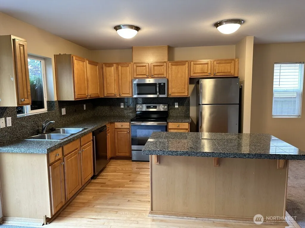 Available NOW! Spacious two bedroom/two bath home in the Glacier Valley neighborhood of Maple Valley! Located in the Tahoma School District, this home built in 2005, seems bigger than its 1360 asf. Great floorplan with two upstairs bedrooms, each has a separate bathroom, and the laundry room including the washer/dryer is located near the bedrooms. Kitchen with granite counters and stainless appliances, is open to the dining area, and the sliding doors that lead into the fenced backyard. There is an attached one car garage, with room for storage.