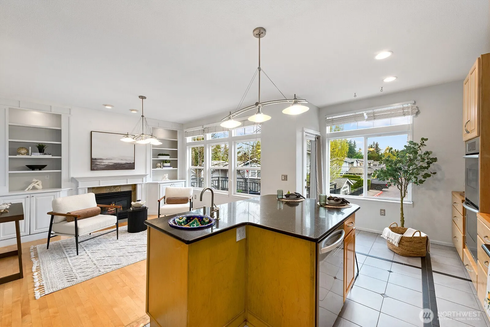 Welcome to this stunning, light-filled modern end-unit townhome in the heart of Rose Hill! Ideally located just minutes from Kirkland’s vibrant shopping, dining, parks, and waterfront, this home offers the perfect blend of style, comfort, and convenience. Beautifully updated 3-bedroom, 2.5-bath home featuring spacious living areas, including a great flex area off kitchen—perfect for entertaining, everyday living or dining. Bright and cheery chef’s kitchen complete with stainless steel appliances and hood, an oversized island with chef’s sink, and thoughtful design. Enjoy indoor-outdoor living with two private decks—ideal for relaxing or hosting guests. Harwood flooring adds warmth and sophistication. 5-piece primary bath. Lower level has large rec room or could be used as bedroom/flex area, office upstairs could potentially be used as bedroom. Newer H20 heater 2022, smart washing machine 2022, smart top control dishwasher 2023. Attached 2-car garage and additional driveway parking provide convenience and flexibility. Beautiful setting and outlook. With a well-managed HOA in quiet and well maintained development. Walkable access to shops and restaurants, and an unbeatable location and minutes from Costco. Close to the coming soon “NE 85th Street Station”–residential, retail, park and linked by transit. Don’t miss this exceptional opportunity to own in one of Kirkland’s most desirable neighborhoods! This home has it all!