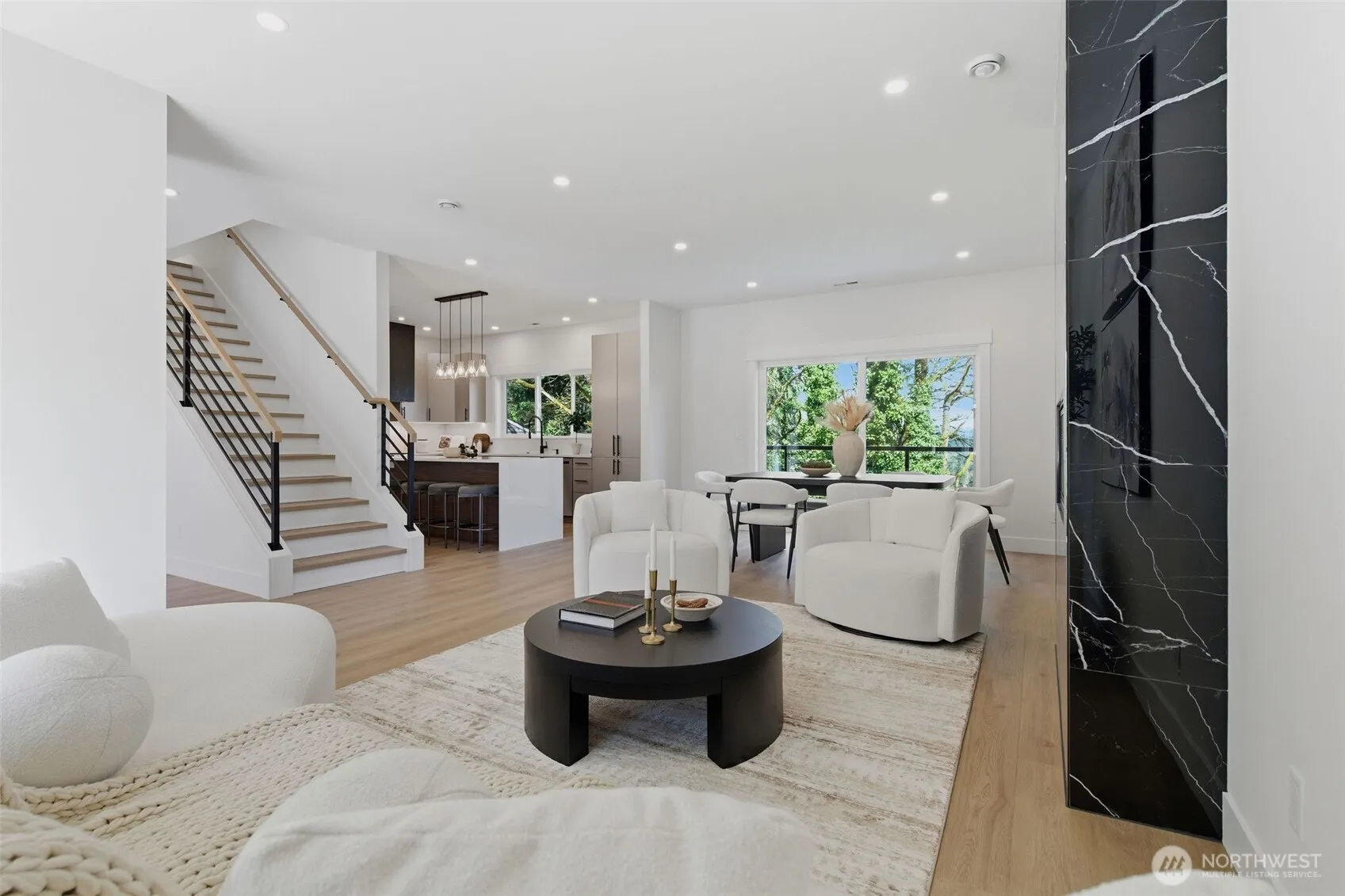 New construction, completed 2026. 3,132 square feet backing directly to greenbelt — no rear neighbors, full tree canopy, and consistent quiet due to the natural buffer behind the home. Four bedrooms across three levels. The kitchen features custom finishes, and premium materials throughout, built in gas connection for oven/range available — it’s the centerpiece of the home for a reason. Bathrooms are finished well above typical new construction with high-end tile work, fixtures, and detailing that are worth seeing in person. Upper level includes three bedrooms and a primary suite with real separation from the rest of the house. Lower level offers a fourth bedroom with separate access and rough-in potential for a kitchenette — a natural fit for multigenerational living, long-term guests, or rental income. The greenbelt is what sets this one apart. The lot backs into mature tree cover with no development behind it. No sight lines from neighboring properties to the rear. Large decks extend directly out toward the greenbelt, putting you right at the edge of the tree line — usable outdoor space that feels connected to the natural surroundings rather than separated from them. Mornings are quiet, birds are a constant presence, and the deck-to-greenbelt connection makes the outdoor living space feel significantly larger than the lot itself. Totem Lake, Juanita, and top-rated Kirkland schools are all a few minutes away.