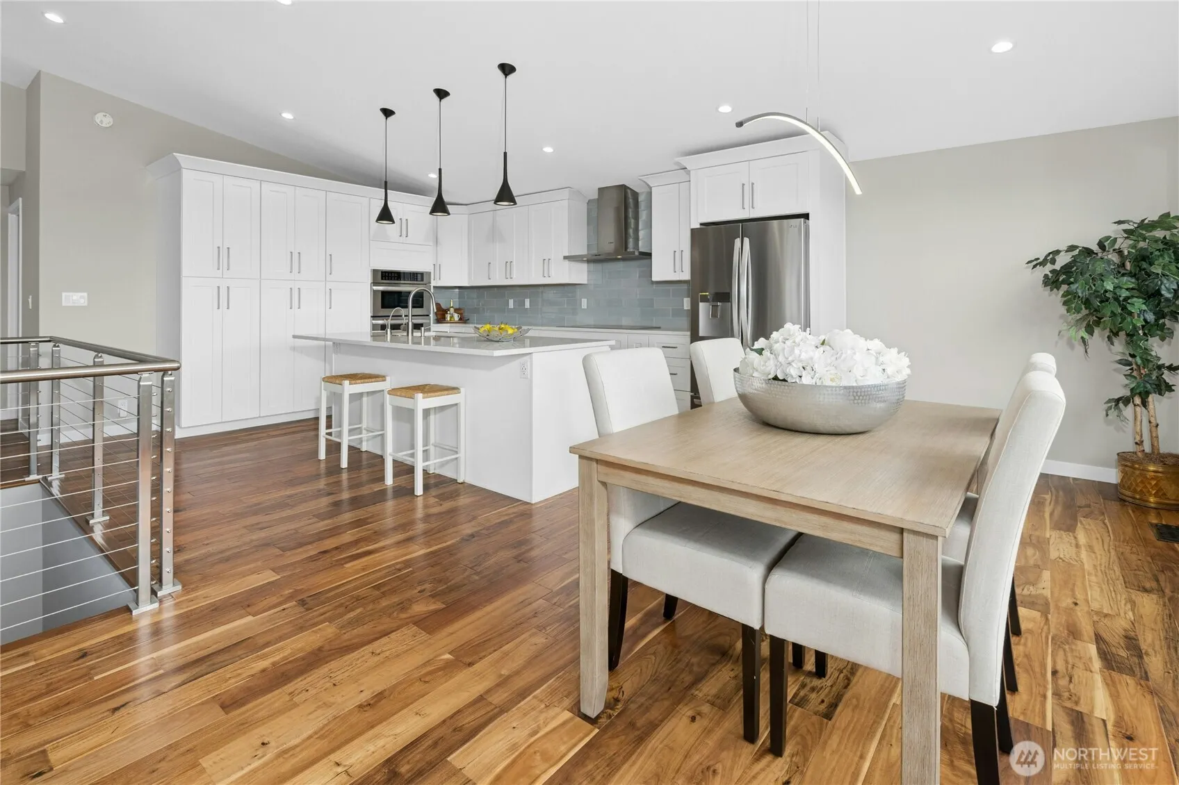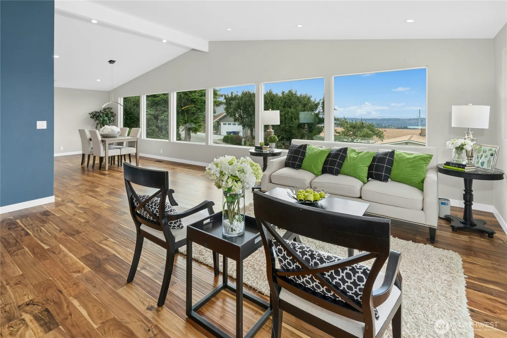 This fully remodeled mid-century home delivers 270-degree panoramas of Lake Washington, Seattle skyline and the Olympic Mtns, visible from nearly every room and spectacular at sunset. Remodeled in 2019–2020: new windows, doors, roof w/ attic insulation, gas furnace, heat pump (A/C), plumbing, tankless water heater. Move-in ready! The open great room is anchored by vaulted ceilings, Acacia engineered hardwood floors, modern cable railing & large picture windows that frame the view. The kitchen is well-designed with crisp white cabinetry, quartz counters, a large island, 36″ Bosch induction cooktop, hood & dishwasher, LG double wall oven, on-demand filtered hot/cold water. The large entertaining deck sits perched above the street & tree canopy, the best seat in the house for golden-hour sunsets. Automatic exterior shades control light & privacy. The primary suite is an elevated retreat: Organized closet systems, heated bathroom floors & towel warmer, double sinks, & a TOTO washlet bidet. The lower level offers flexibility with a separate entry, full bedroom, ¾ bath, family room, laundry, storage, & workshop, ideal as a private home office suite, guest wing, or creative studio. Tech features include garaged Level 2 EV charging, Cat7 ethernet, Ring security, deep 2-car garage. Fully pre-inspected. Private backyard. Award-winning Bellevue schools: Somerset Elementary, Tyee Middle, Newport High.