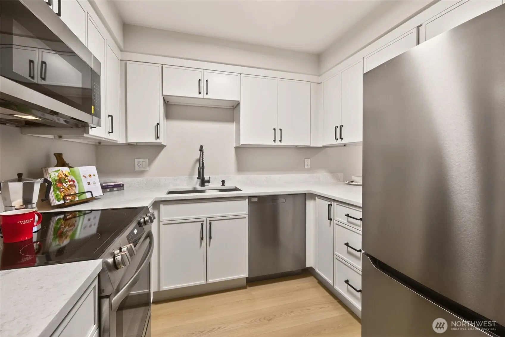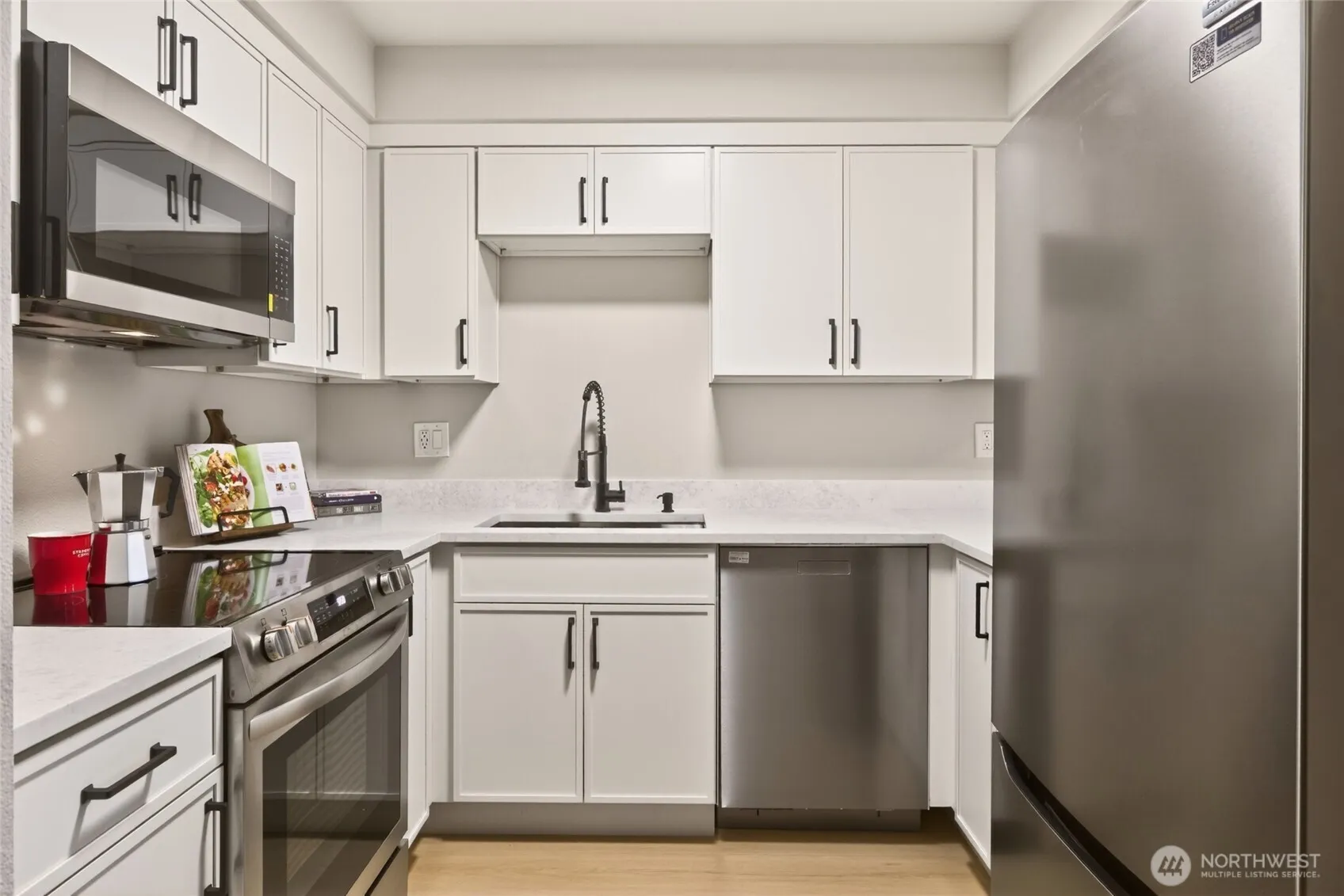 [ Downtown Kenmore & Lake Washington Waterfront just outside your front door!] Fantastic Walk, Bike, Transit, and Lifestyle Enjoyment Score here with numerous breweries, dining, shopping, the Burke-Gilman Trail, and parks – all within a few short moments away. This Top-Floor Corner End-Unit with Reserved Garage Parking features a Brand New Remodel with New LVP wide plank floors, New Stainless Appliances, All New Micro-Shaker Cabinets & Beautiful Honed Quartz Counters, New Lighting & Fixtures, New Water Heater, New Tiled Shower, New Solid Wood Doors & Matte Black Hardware, Vaulted Ceilings + AC. The covered BBQ Deck offers year-round enjoyment, and the wood-burning fireplace adds to the ambiance. Great closet space + Huge Storage or Pantry. Fitness / Game room means it’s all right here!. No Rental Cap & Low Dues, Pet Friendly. Amazing proximity to transit and bus options. Excellent Walk-Score. Pre-Inspected and Move-in-Ready!