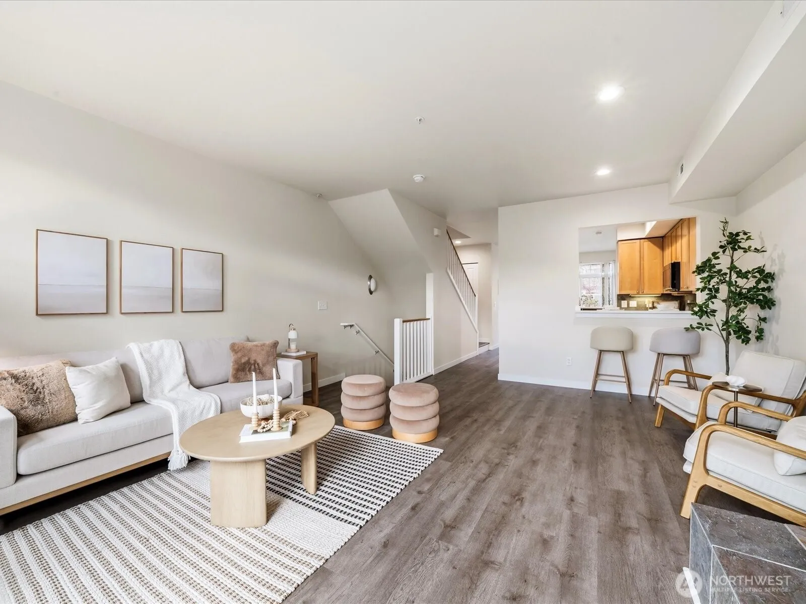Beautifully updated townhome in a gated community with an unbeatable location! This light-filled home offers 3 bedrooms, 2.25 baths, and a spacious tandem 2-car garage with additional W/D hookups or electric car charging outlet. The brand-new kitchen features quartz countertops, stainless steel appliances, and recessed LED lighting unique to this unit. New waterproof vinyl plank flooring and fresh interior paint enhance the bright living spaces, highlighted by vaulted ceilings, large windows, and skylights. The HOA is well maintained with lower dues at $539.00 which includes water and sewer. Enjoy breakfast in the sunlit dining area or relax by the gas fireplace. Step out onto the sunny balcony for added outdoor space. Walk to T&T, Target, Factoria Mall, and nearby restaurants, with quick access to I-405, I-90, and transit routes (203, 240) connecting to Bellevue, Kirkland, and the greater Eastside. Close to the 42-mile East Lake Sammamish Trail extending throughout the Lake Washington area. Nearby parks include Newcastle Beach Park and The Golf Club at Newcastle. Located in the award-winning Bellevue School District: Woodridge Elementary, Tyee Middle, and Newport High School.