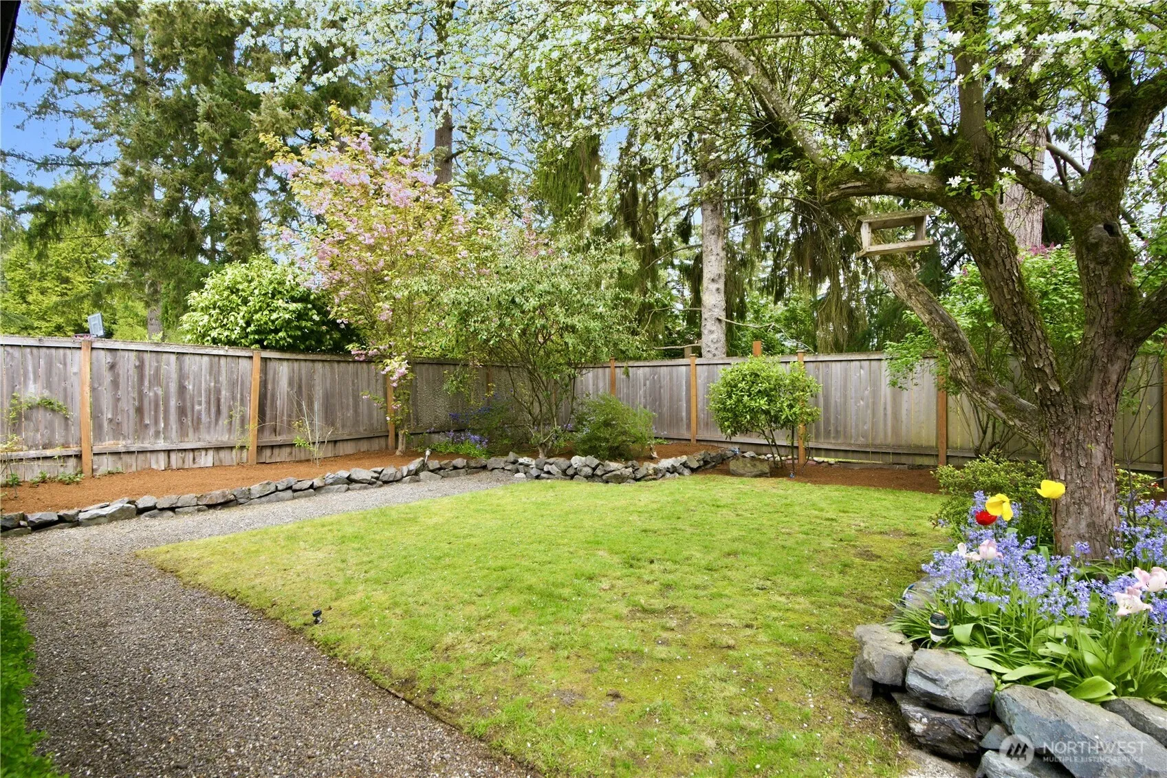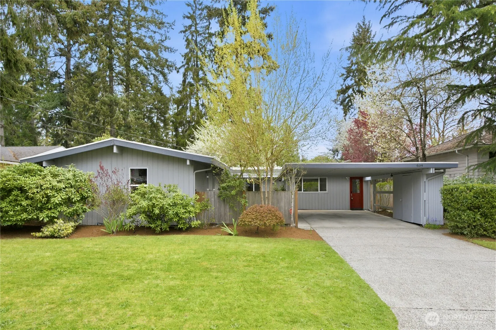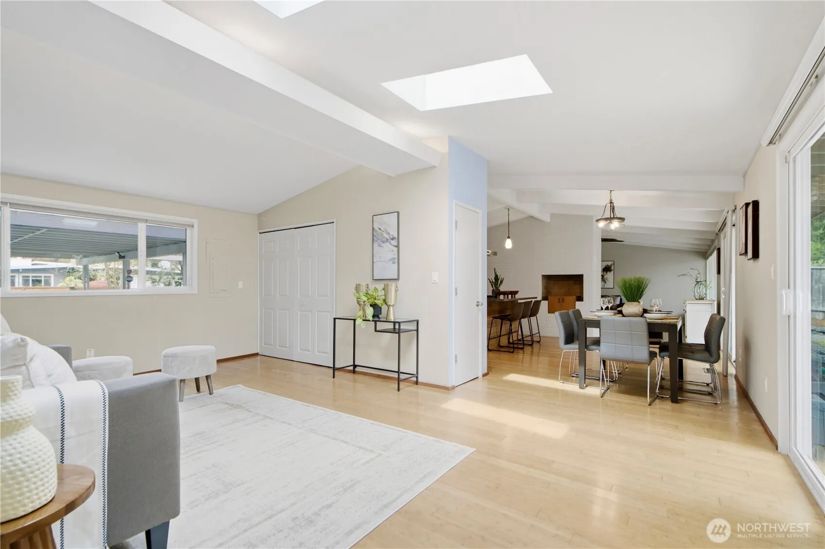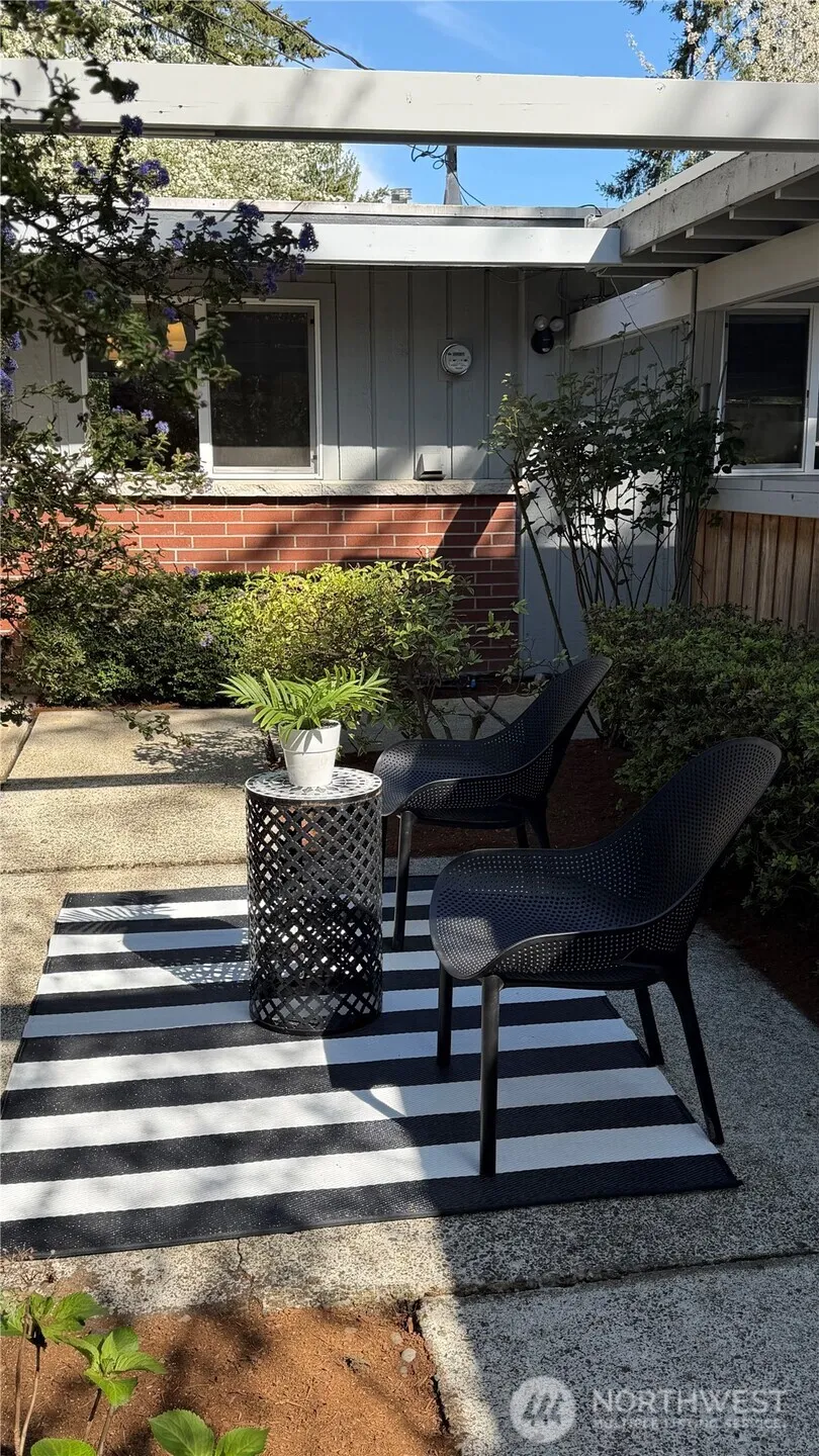 Thoughtfully redesigned and meticulously maintained, this inviting mid-century home blends timeless character with modern comfort. The open-concept layout features vaulted, beamed ceilings and expansive windows that fill the space with natural light, while a cozy gas fireplace and custom built-ins create a warm, welcoming atmosphere. The updated kitchen offers a slab island, under-mount sink, gas range, and stainless steel appliances, seamlessly connecting to the living and dining areas—perfect for everyday living and entertaining. The spacious primary suite includes an en-suite bath and walk-in closet, with additional flexible spaces for work or relaxation. Large sliding doors open to a private backyard with a patio and generous storage outbuilding. Situated on a wide lot along a quiet street, this home is located in the highly regarded Bellevue School District and just minutes from parks, shopping, dining, and major tech campuses