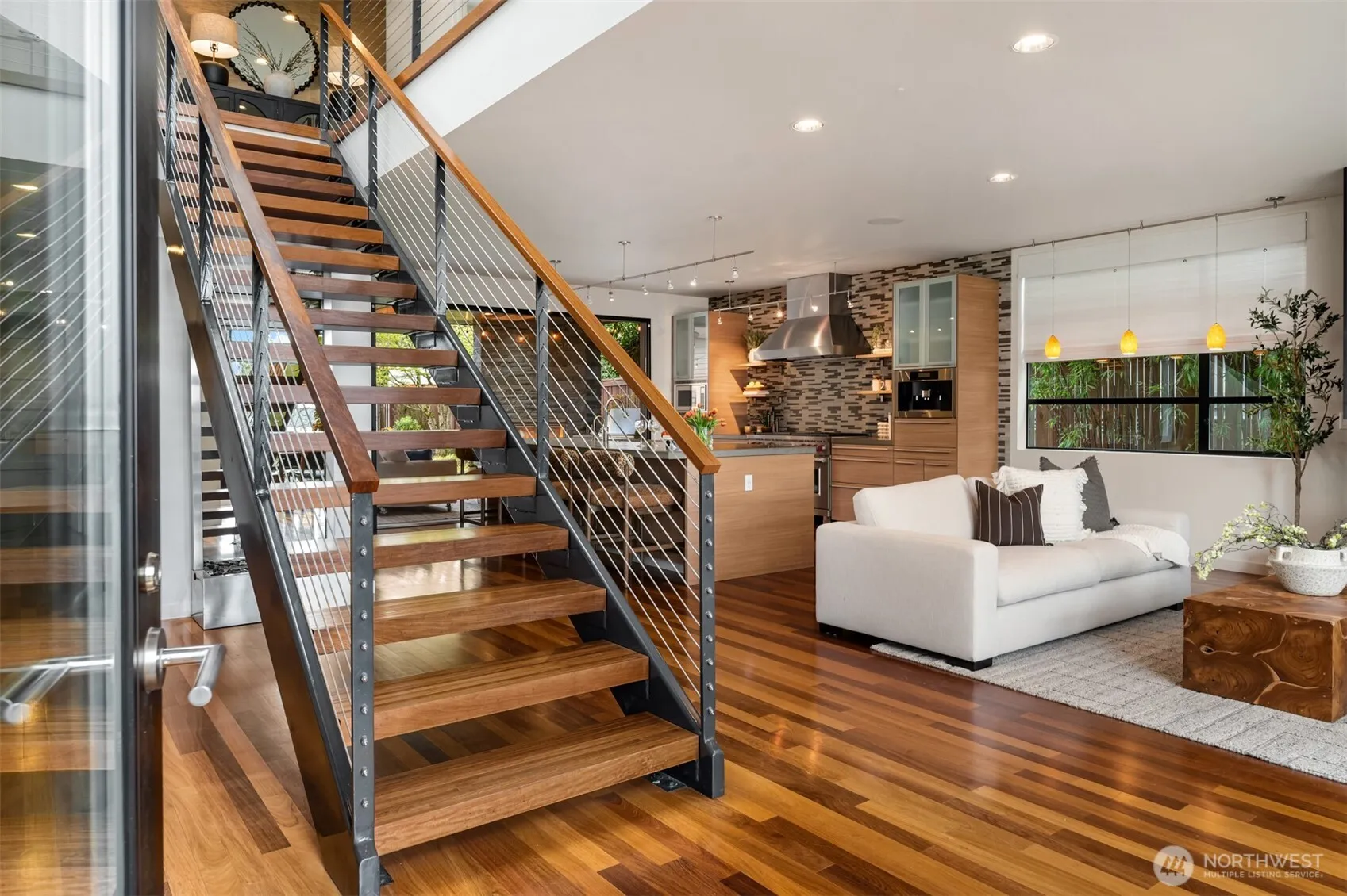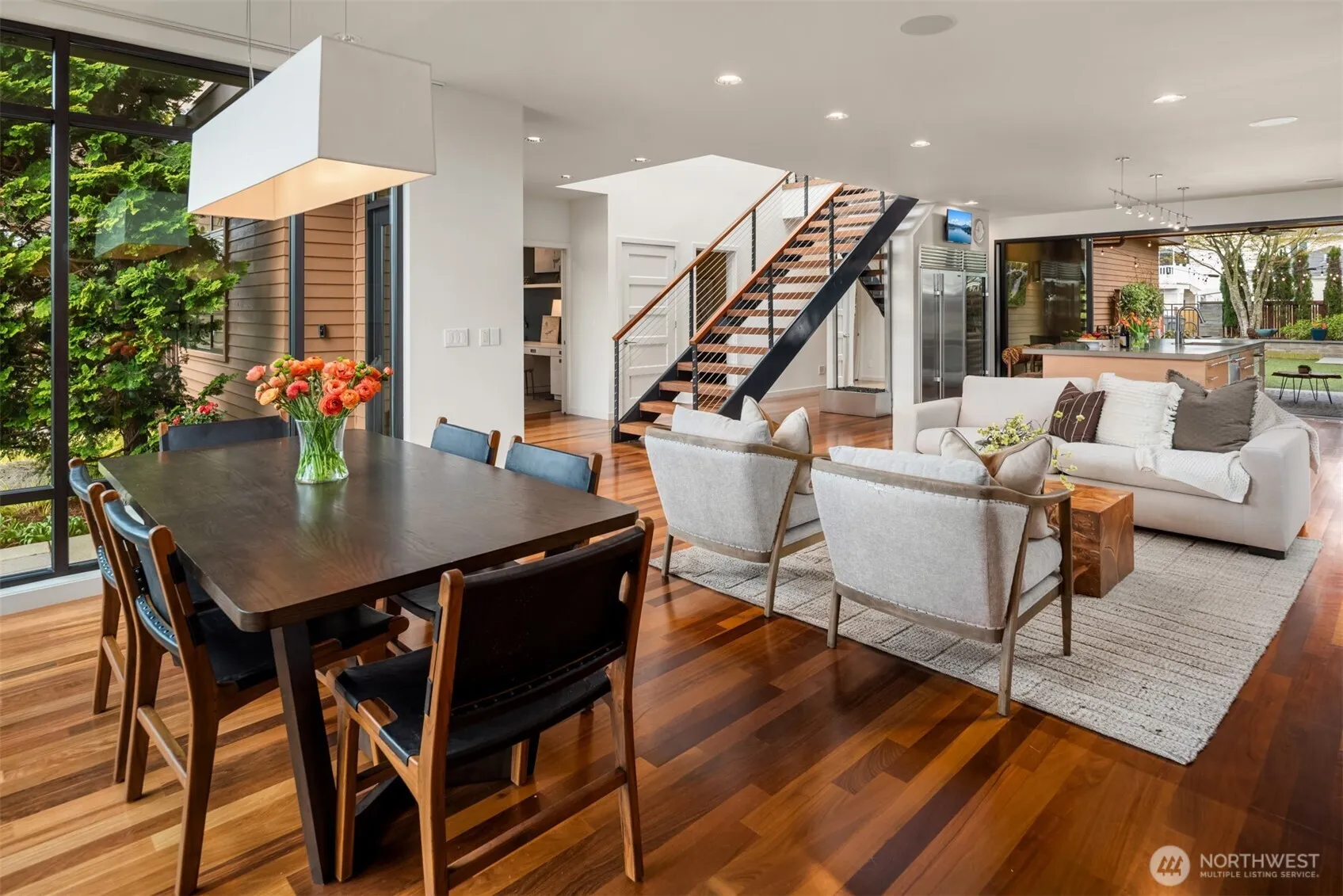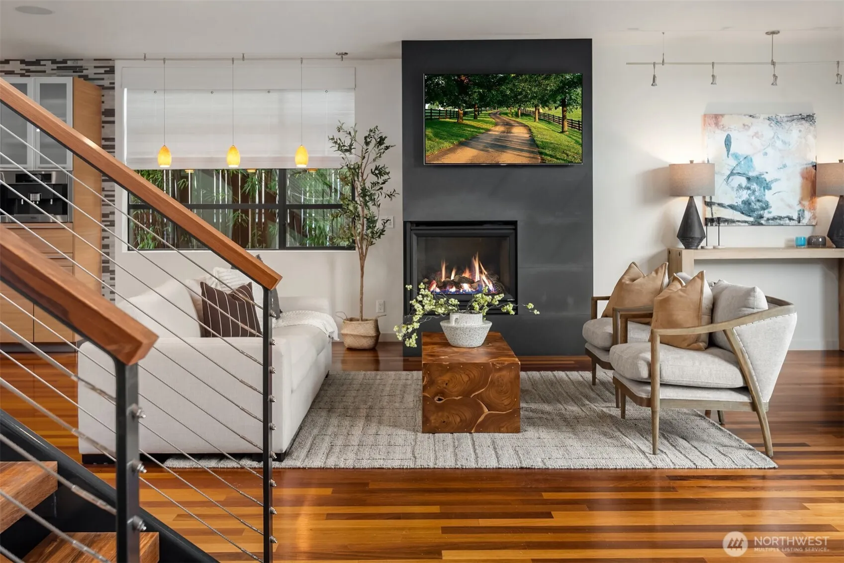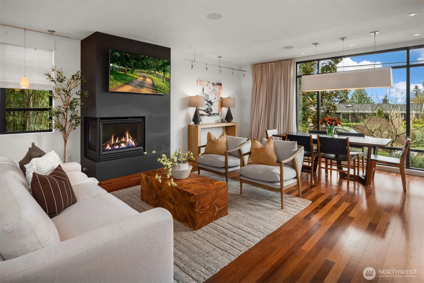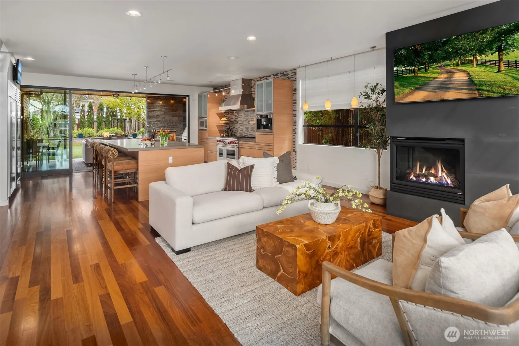 Set in Kirkland’s West of Market, this Northwest Contemporary is defined by volume, light, and seamless indoor-outdoor living. Tall ceilings, skylights, and walls of glass create an open, airy feel throughout. The main level is designed for both everyday living and entertaining, with a sleek kitchen featuring a Wolf range, warming drawer & two Subzero fridge drawers, Miele built-in coffee system, wine fridge, and deep sink, flowing effortlessly to living and dining spaces. Floor-to-ceiling glass sliders open to a covered patio with fireplace, built-in BBQ, and TV—an inviting extension for year-round evenings outdoors. A dedicated office with sliding doors and a flexible suite with ¾ bath introduce versatility, complemented by a laundry room. Upstairs, find views of Lake Washington and the city. Three ensuite bedrooms provide a well-balanced layout, along with an additional laundry room that adds everyday convenience. Manicured grounds with turf lawn and a two-car garage. Cement pad is wired for a hot tub, offering an easy opportunity to enhance the outdoor retreat. Set near the waterfront, top-rated schools, downtown Kirkland’s restaurants and boutiques. Easy access to parks, marina, and 520 brings a natural ease to daily living.