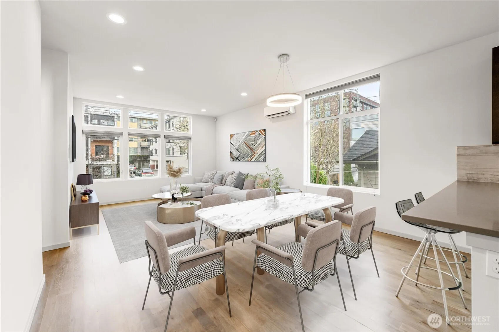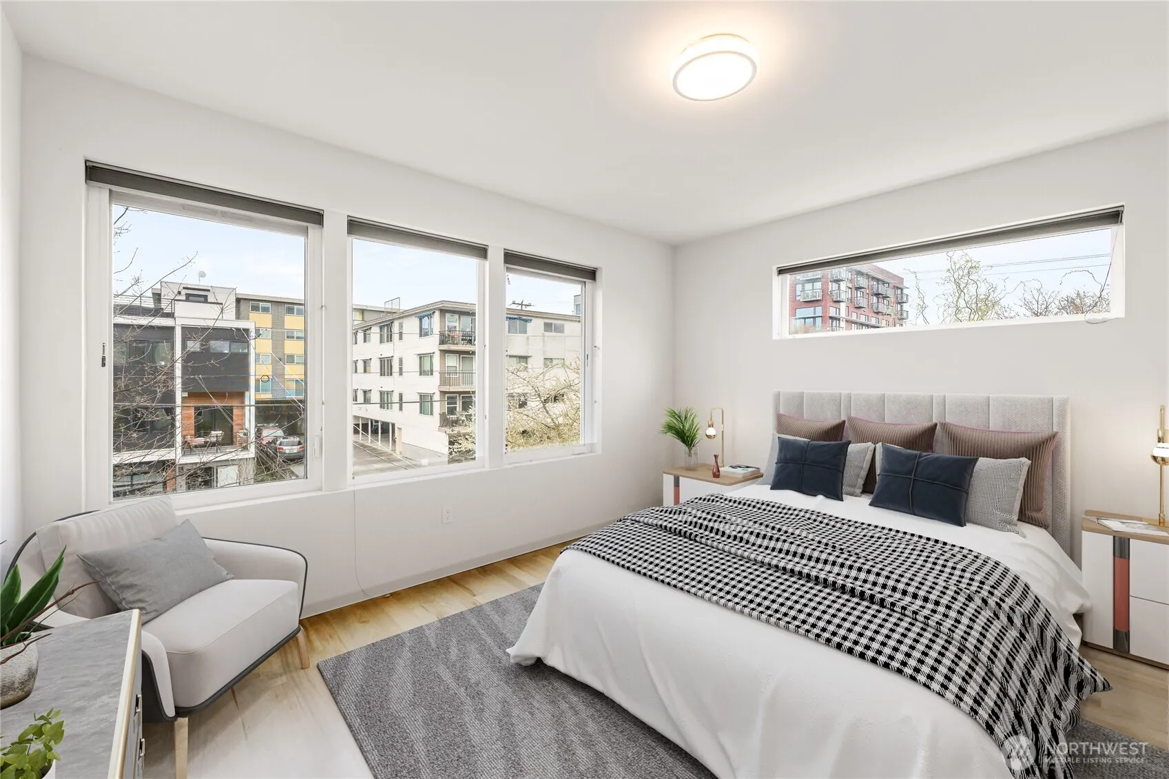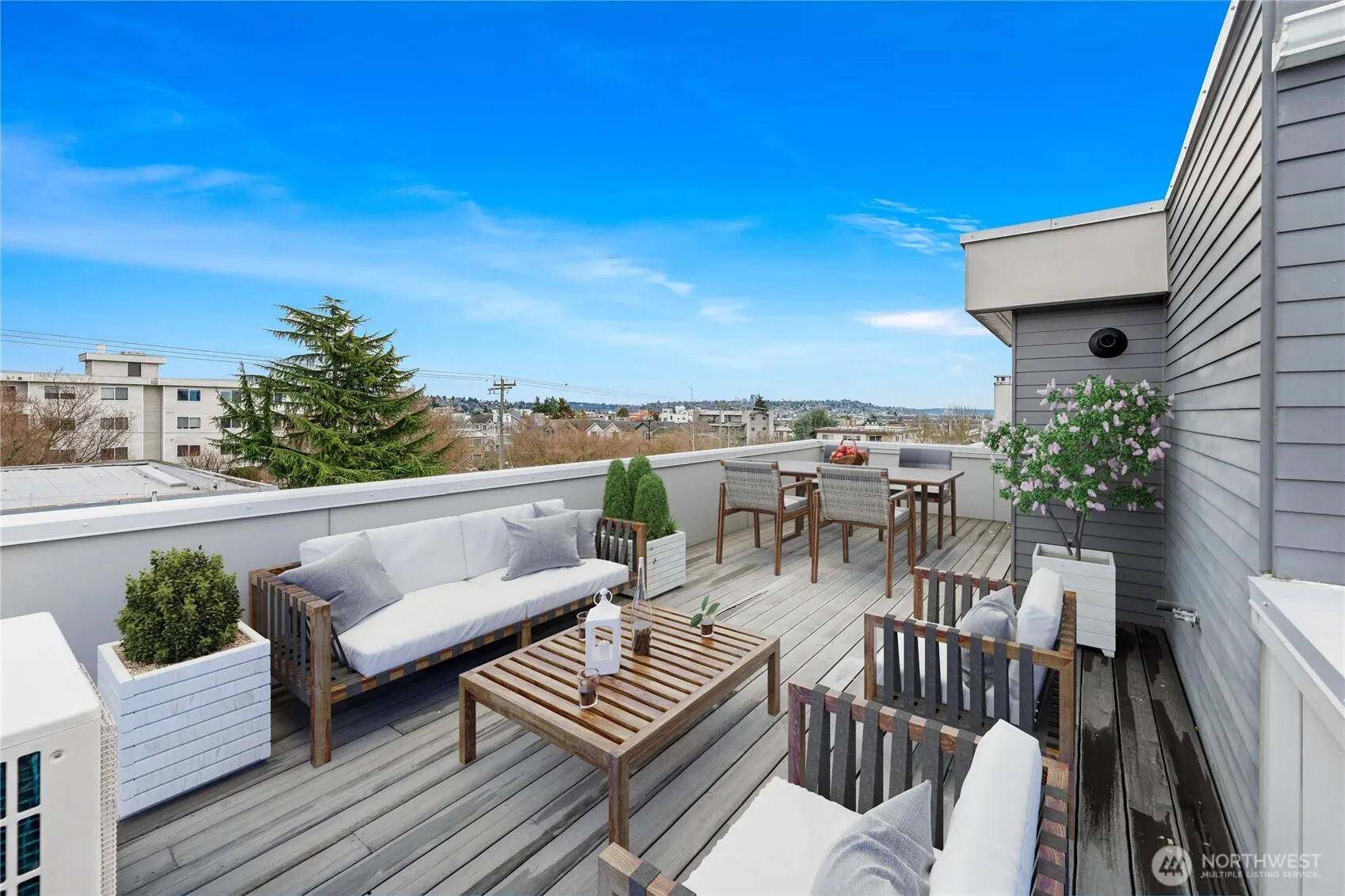 Discover urban living at its finest in this stylish townhouse nestled in the heart of Seattle’s coveted Ballard neighborhood. This vibrant community offers an unbeatable lifestyle, celebrated for its unique blend of historic charm and modern amenities. Living here means embracing exceptional accessibility, with popular local eateries, celebrated farmers market, and fabulous parks nearby. Commuting is a breeze with convenient access to major transit lines, connecting you effortlessly to downtown Seattle and beyond. For those who prefer two wheels, dedicated bike routes are plentiful, including the beloved Burke-Gilman Trail. This thoughtfully designed townhouse features two comfortable bedrooms and 2.5 bathrooms, offering both privacy and convenience. Enjoy gentle radiant heating on the ground floor and bathrooms. Mini-splits provide heating and air conditioning on the second and third floors. The attached garage provides indoor parking and extra storage space. This home includes refrigerator, washer, and dryer. Venture outside on your private covered patio, or ascend to the show-stopping rooftop deck – both offering stunning views of majestic Mount Rainier, perfect for entertaining or quiet contemplation. Please note that a small section of wood flooring was damaged by moisture from a terra cotta planter. This spot is located near a wall and easily covered by furniture or a plant. This home perfectly balances modern comfort with the dynamic energy of Ballard.