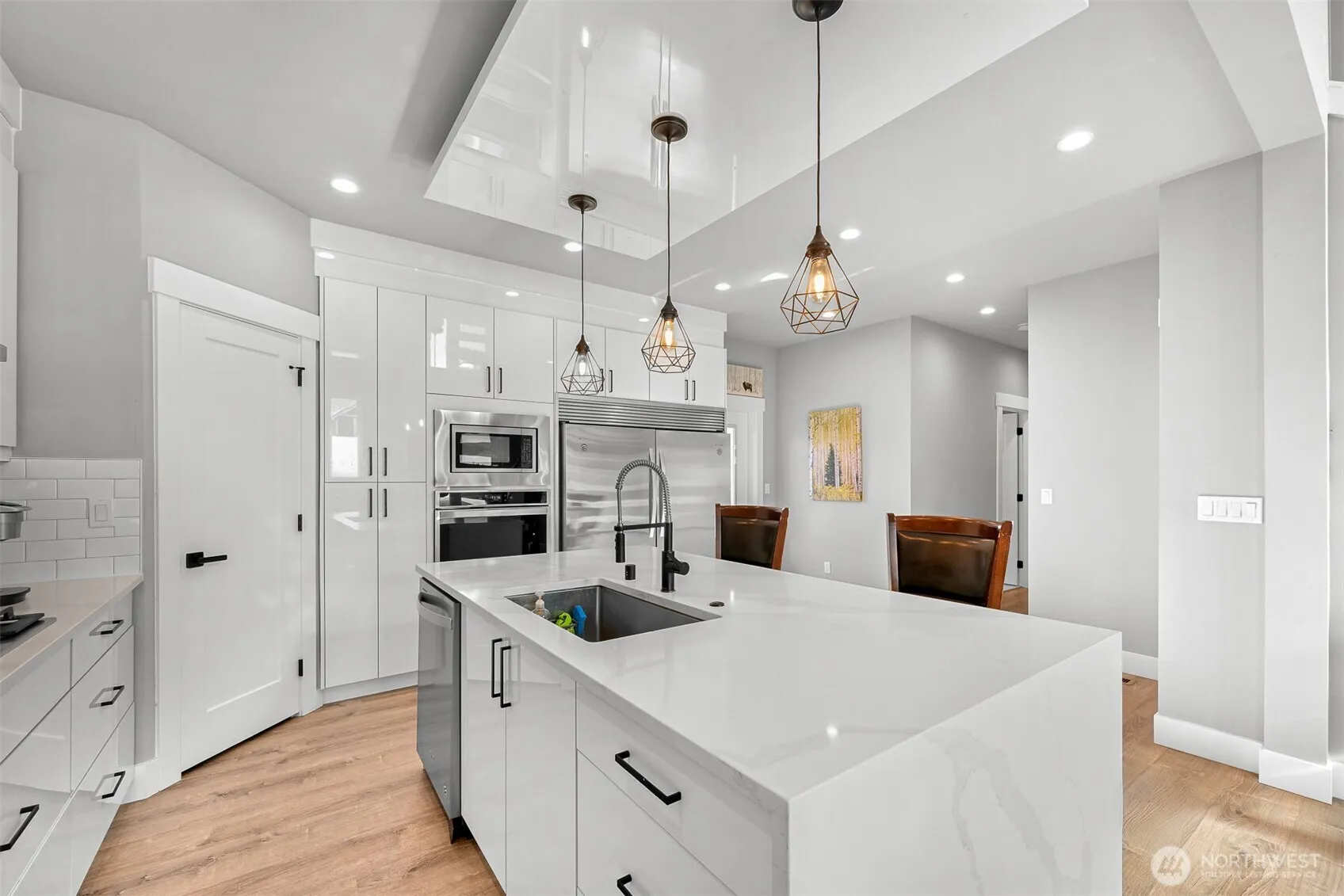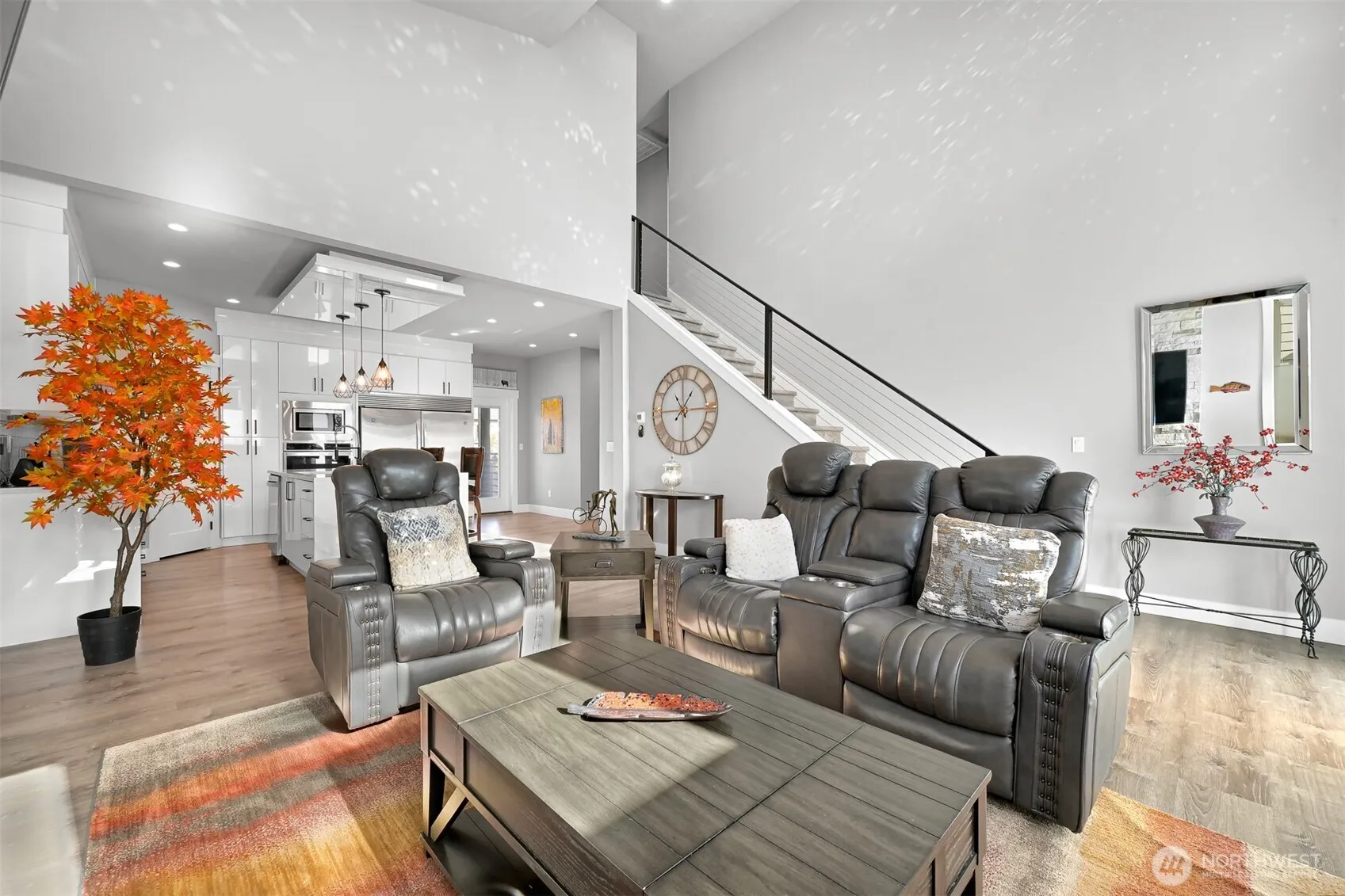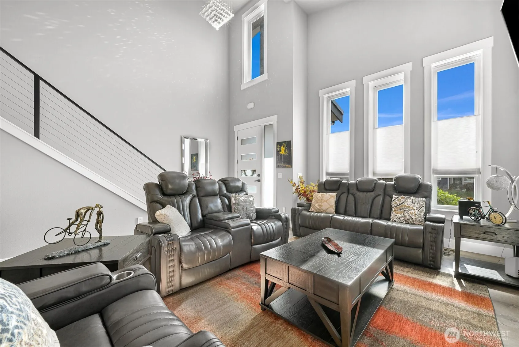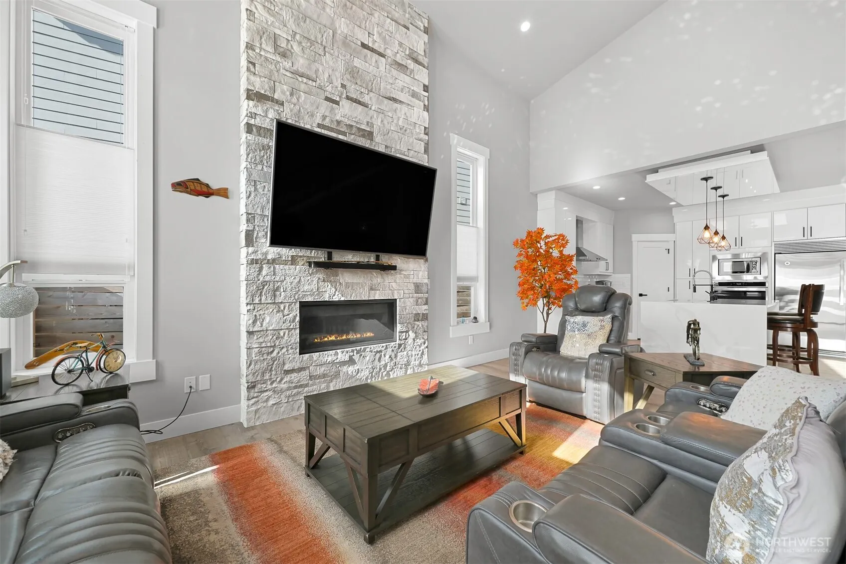 One of Ferndale’s modern elegance in desirable Malloy Terrace. This open and spacious 4-bedroom home welcomes you with soaring 19 ft ceilings in the living room anchored by a gorgeous floor-to-ceiling rock wall fireplace. Chef’s kitchen features sleek waterfall quartz counters, a walk-in pantry, & double fridge. One bedroom on main sits adjacent to a full bathroom. The primary suite upstairs offers a walk-in closet, bathroom w/ double vanity + step-in shower, and French doors that lead to its own covered deck. Fully fenced yard backs to the community greenspace & trail. Close to Vista Ridge Park & Cedar Creek Park plus easy access to I-5 via Thornton Overpass. Come and see this gem!