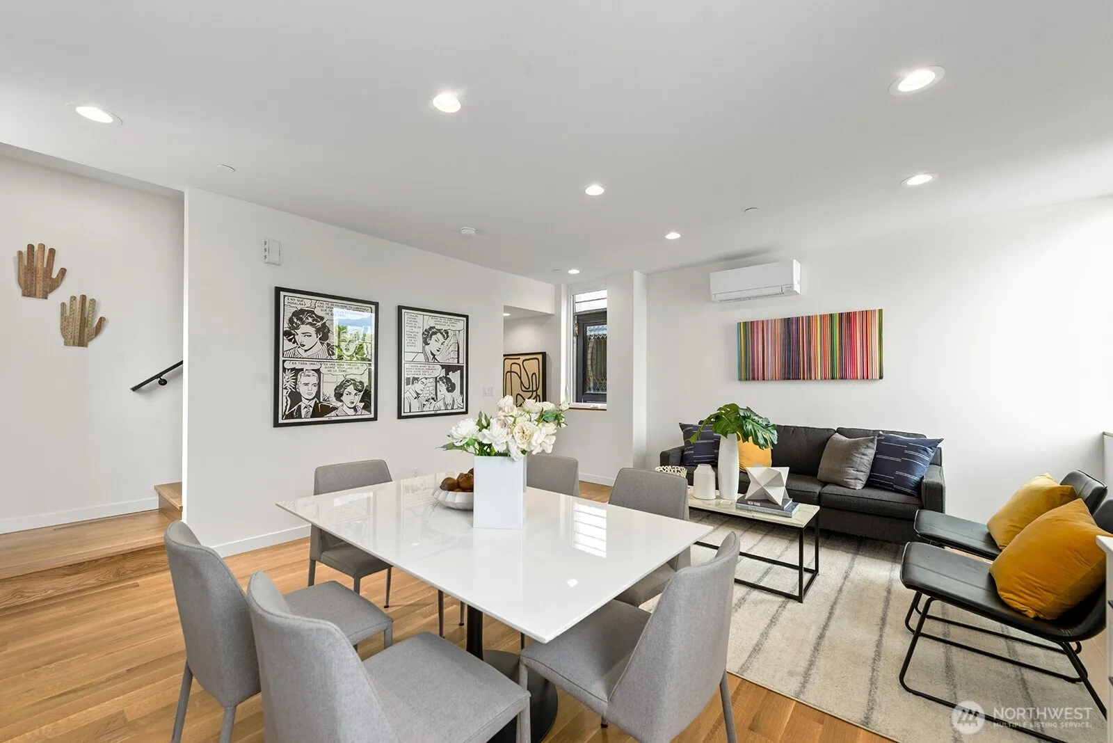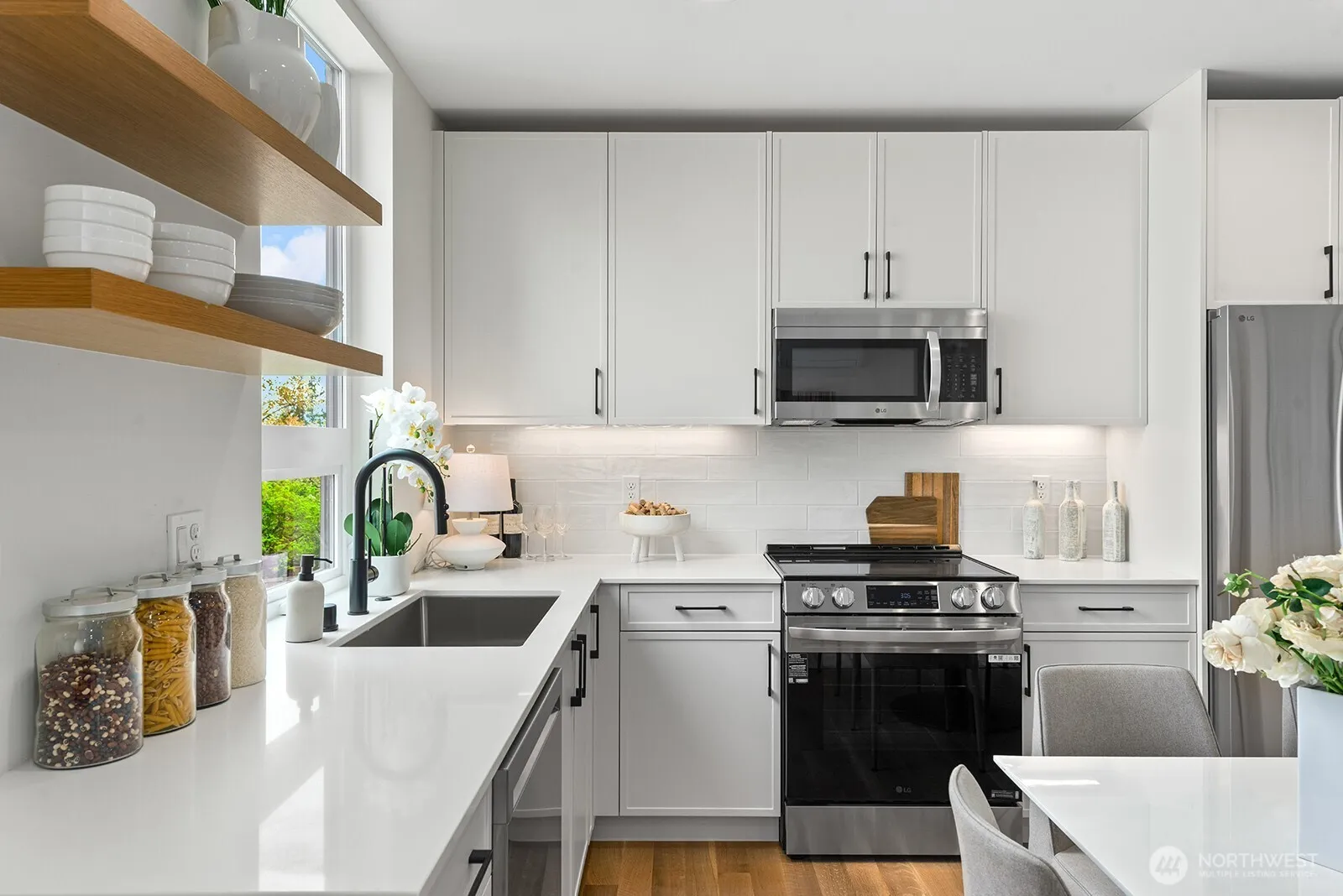 Stunning new construction by Build Sound, ideally positioned in the heart of Wallingford. This thoughtfully executed home offers crisp modern architecture, clean lines, real hardwood floors, elevated finish quality, abundant natural light, and picturesque Seattle views. The entry level features a spacious bedroom with a private en suite full bath—perfect for guests, a home office, or flexible living. On the second floor, enjoy bright open-concept living anchored by a chef’s kitchen with custom cabinetry, quartz countertops, stylish backsplash, and stainless steel appliances. The third level serves as a serene primary retreat, complete with a luxurious en suite bathroom. Crowning the home is an expansive rooftop deck offering sweeping views of the Olympic and Cascade Mountains, the Space Needle, and Lake Union—an ideal setting for entertaining or unwinding. With a Walk Score of 91, you’re steps from Wallingford’s vibrant collection of shops, restaurants, cafes, parks, and more. Additional highlights include dedicated EV ready off-street parking, mini-splits for efficient heating and cooling, additional storage, and convenient access to I-5 and Highway 99. If you’re seeking well-located new construction that’s built to last, this exceptional home delivers.