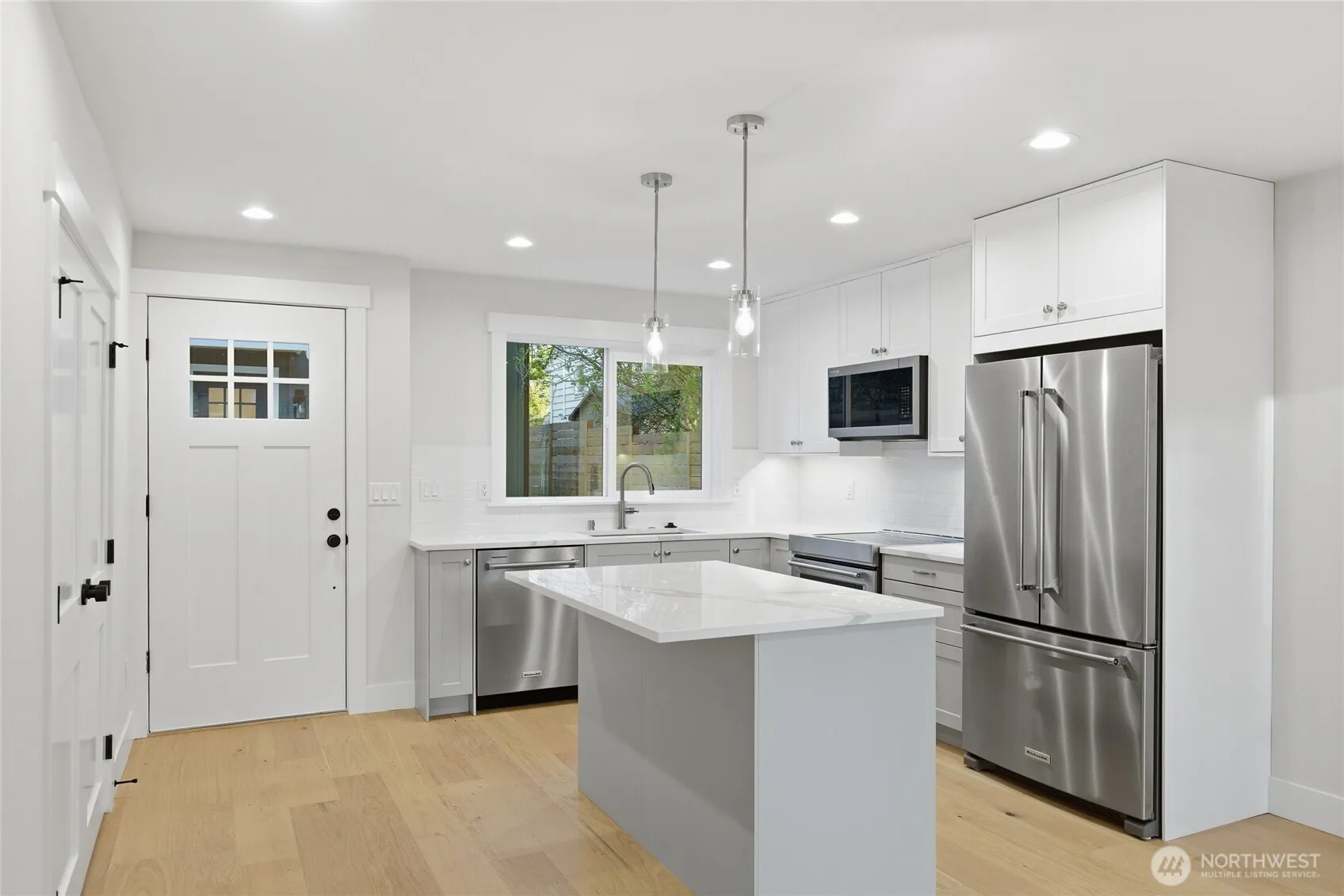Crisp modern design meets everyday comfort. Two story detached home from Seattle favorite boutique builder Garton Developments on one of the finest tree-lined streets in North Green Lake. Thoughtfully designed new construction, these home blends modern craftsmanship with timeless finishes. Wide-plank hardwoods, clean-lined shaker doors, and black hardware create a cohesive, elegant look, while a custom entry drop zone adds practical style. The kitchen features two-tone Bellmont cabinetry, quartz counters, full-height backsplash, and a spacious peninsula with pendant lighting. Bathrooms showcase designer tile, quartz, and modern fixtures, including a spa-like primary suite bath and a boutique powder room. Additional highlights include plush carpeted bedrooms, black spindle stair railings, curated exterior lighting, and a neutral palette for a bright, calm feel. Don’t miss the heated garage/flex room, a rare find for in-city new construction. Total of 2 parking spaces (one inside garage and one uncovered outside). Set on a quiet, peaceful street yet just moments from vibrant conveniences including Green Lake, Northgate Station, North Seattle College and much more!