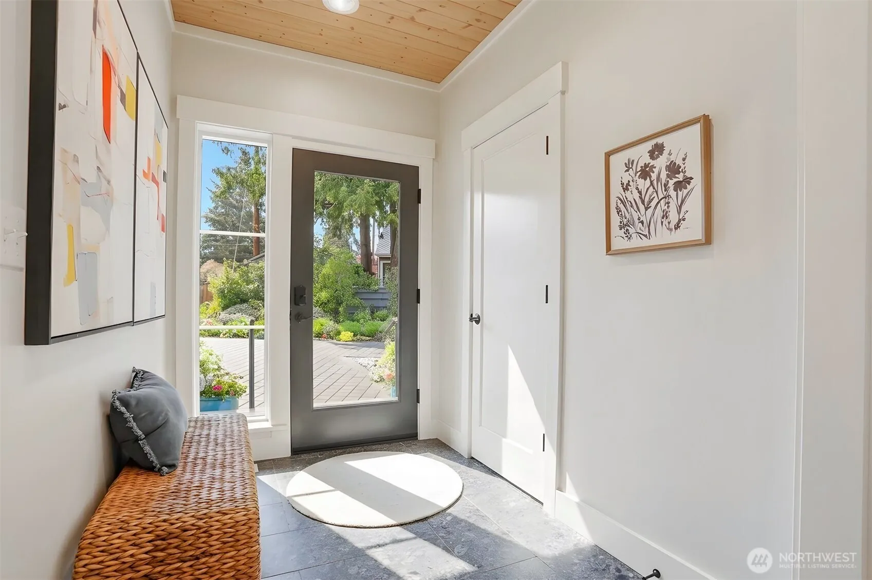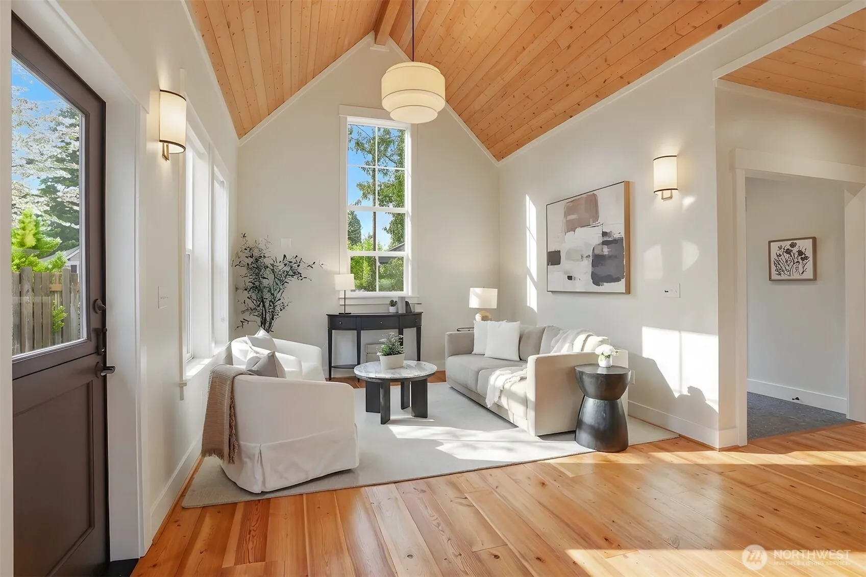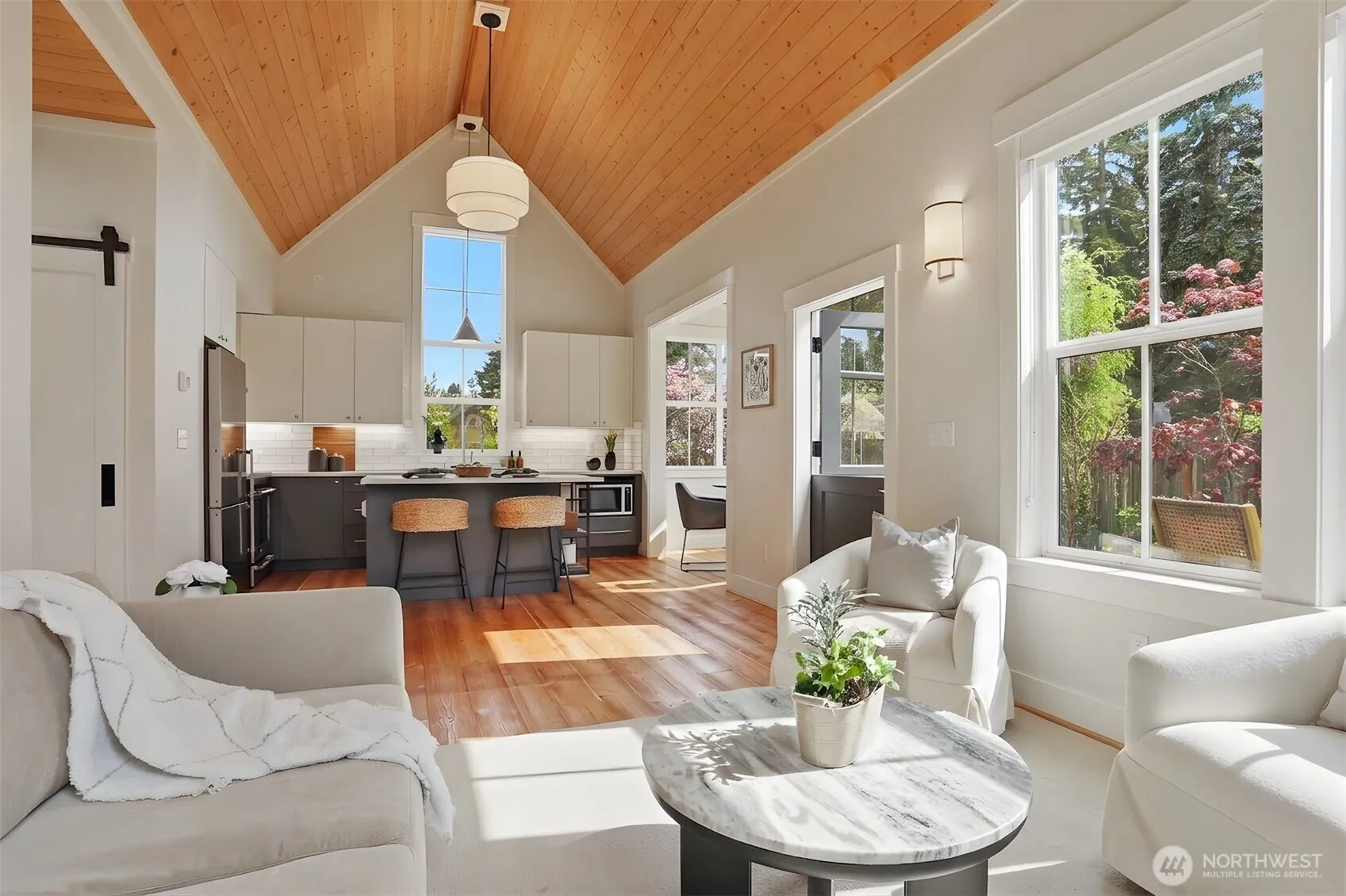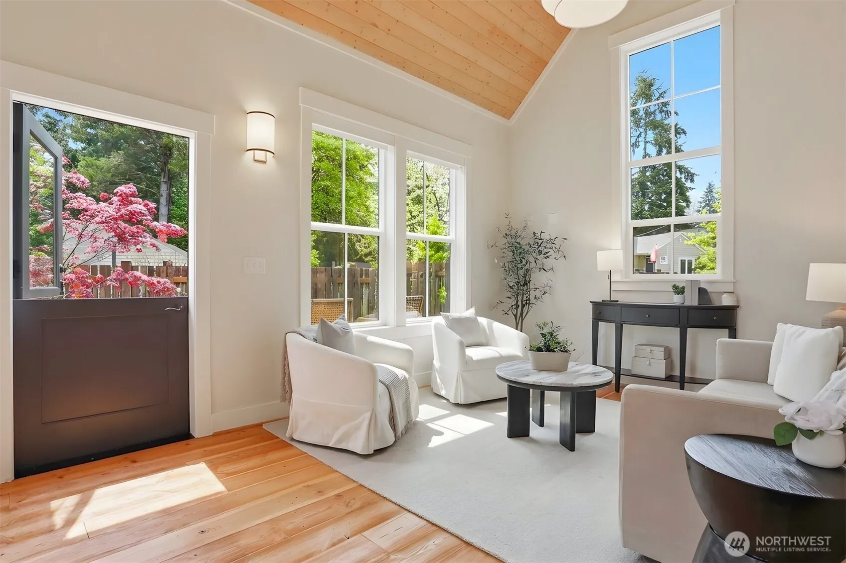 Head over heels in love! Darling one level cottage with glorious gardens! It’s like jumping into a page in Sunset magazine! Seriously! All the right spaces! Single level Modern Farmhouse-filled with light! Artful design! Lovely windows! Pine paneled vaulted spaces-solid wood-planked floors-dutch door offering outside space in-outdoor sitting areas-DREAMY! Dining room surrounds you with joy overlooking SW facing gardens. Sun light drenched kitchen has lots of beautiful quartz counter space, storage galore and professionally equipped. Tucked away down a private lane in this ever coveted pocket community on its own 6067 sf lot, this 1000 sf cottage has 2 bedrooms, heated tiled bath, large walk in shower, double sink vanity. Plus, there’s room for your home office, workspace, gear, crafts-whatever you desire in the 365 sf one-car garage with bump out, private entrance, window, ample pull down attic storage with barn door detail, wired with car charging capability. Built 4-star Green High efficiency Heat pump/AC. Pinehurst Light Rail, Northgate Whole Foods all coming soon! Hazle Wolf STEM k-8-one mile away. See today!