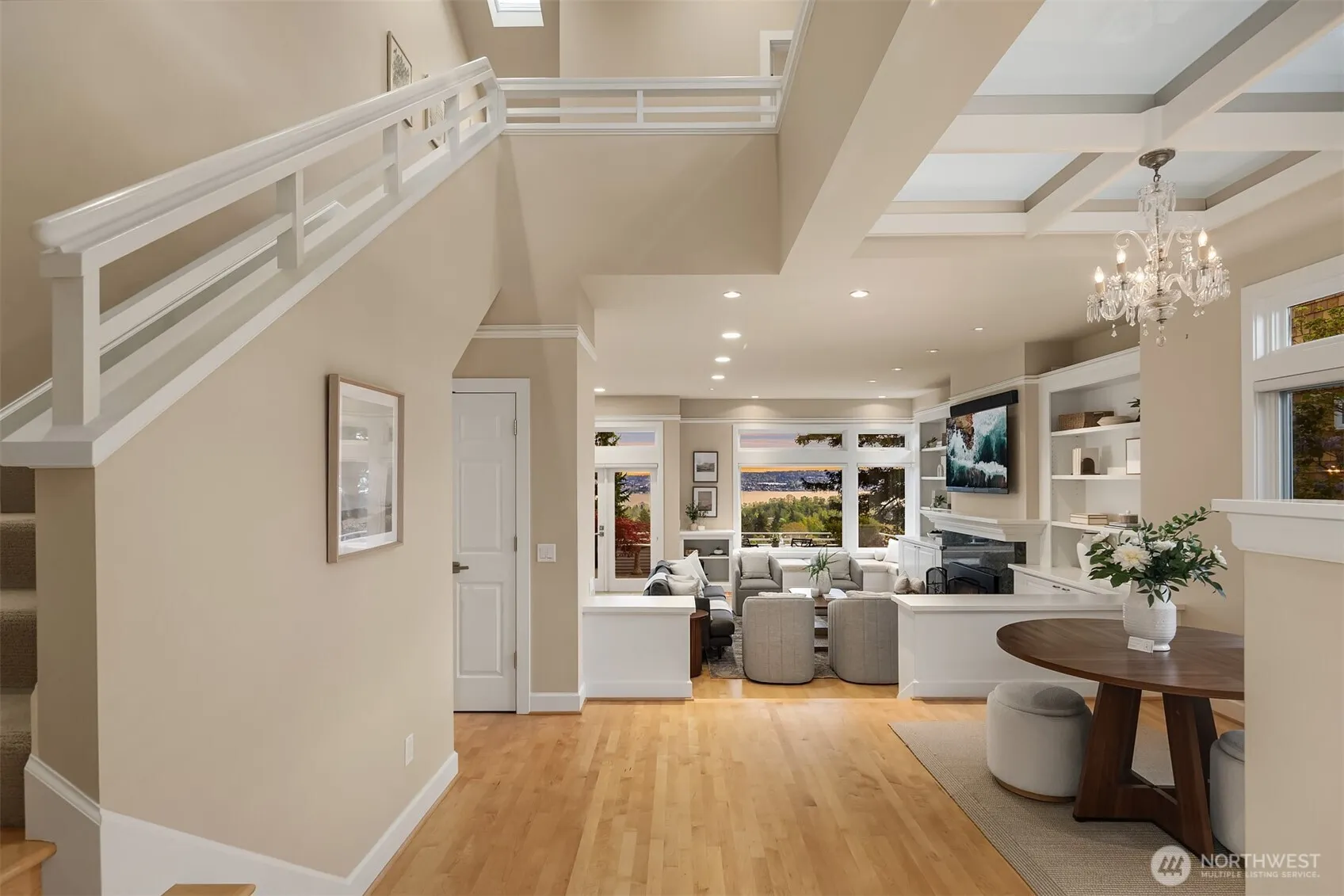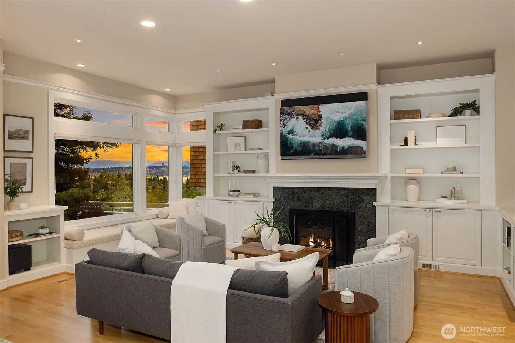 Set high above the neighborhood, this View Ridge home is defined by expansive views of Lake Washington, the Cascades, and Mount Rainier, with living spaces and outdoor areas oriented to take it all in. The main level is light-filled and designed for connection, with open living, dining, and kitchen spaces that flow directly to a beautiful deck. Large windows bring in natural light while keeping the focus on the view. Upstairs, the primary level lives like a private retreat, with a spacious bedroom, spa bathroom, and expansive closet with in-unit washer and dryer. A dedicated office with custom built-ins and its own view offers a separate work space, while a flex area with custom glass tile allows light to filter through to the main floor below. The lower level offers a rec room, bedroom, bathroom, wine cellar, utility space, and access to a spacious, covered balcony. Terraced grounds feature irrigation, native plantings, hardscaping, water feature, and a distinctive fern wall—creating a sense of privacy and tranquility. Features convenient smart home systems with A/C and expansive three-car garage off the alley. A rare combination of view, versatility, and a peaceful, elevated setting in one of NE Seattle’s most delightful neighborhoods.