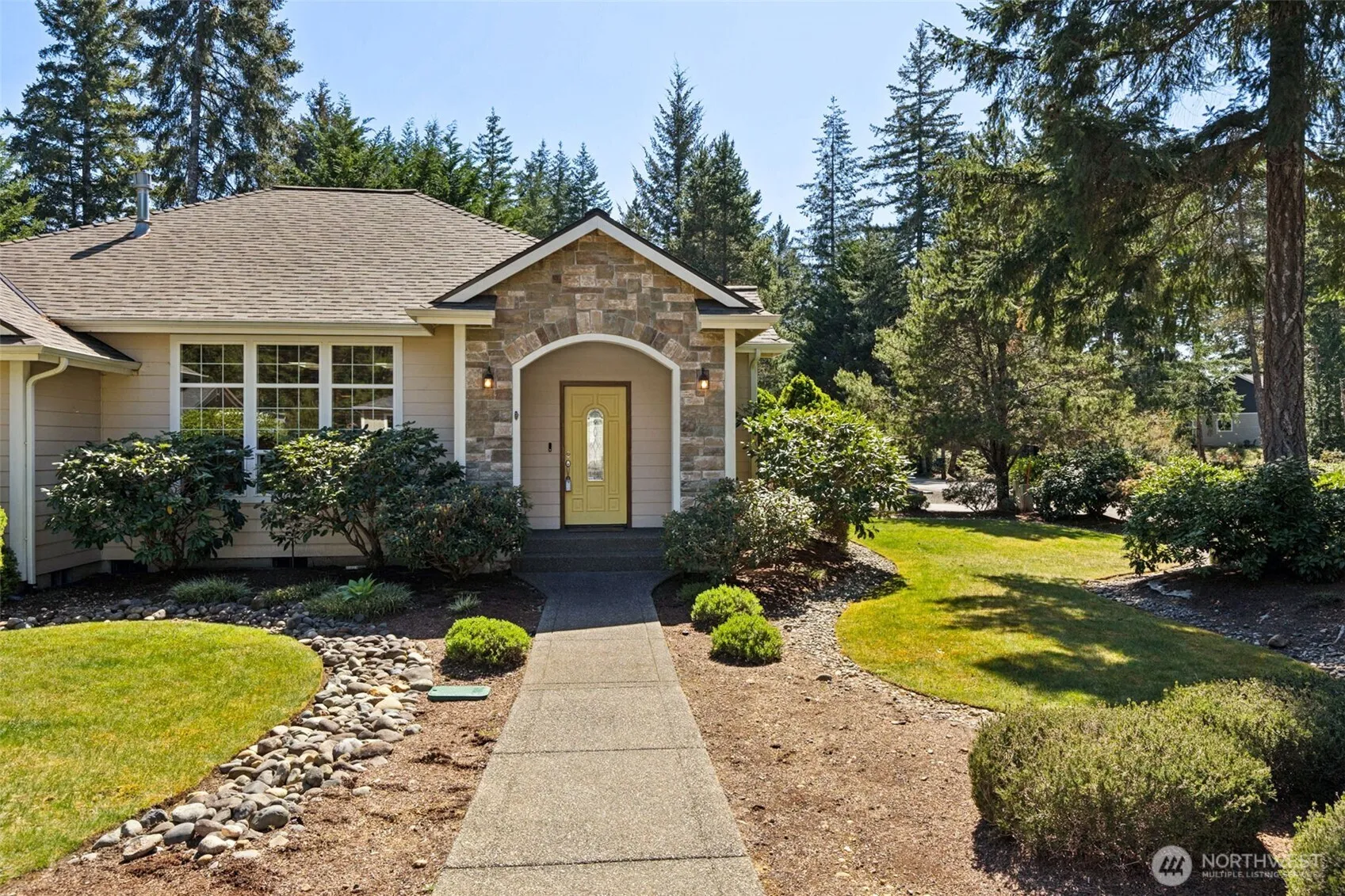 Tucked below the 14th tee in desirable Alderbrook with golf course views, this well-maintained rambler offers 2 bedrooms plus office/den and 2 full baths. Inviting entry with cherry hardwood floors opens to a light-filled great room featuring vaulted ceilings, skylights, and a striking stone fireplace. Open-concept kitchen flows seamlessly into the main living area, ideal for everyday living and entertaining. French doors lead to a versatile den or home office. Spacious primary suite includes a 5-piece bath with jetted soaking tub. Situated on a large corner lot with attractive Hardi-plank and stone exterior, private patio, and RV parking with power. Additional features include wood blinds and security system. Alderbrook HOA dues include unlimited golf for two, with access to the clubhouse and 18-hole course. Enjoy close proximity to Hood Canal, scenic hiking trails, and Alderbrook Resort.