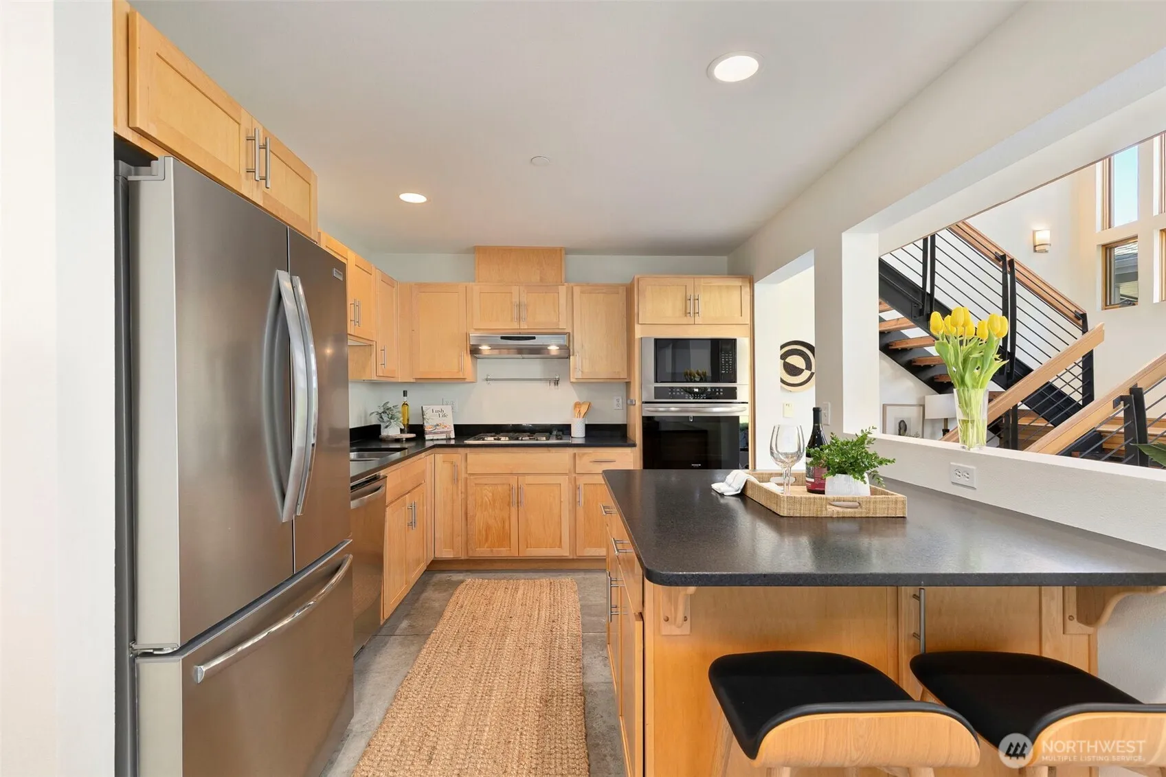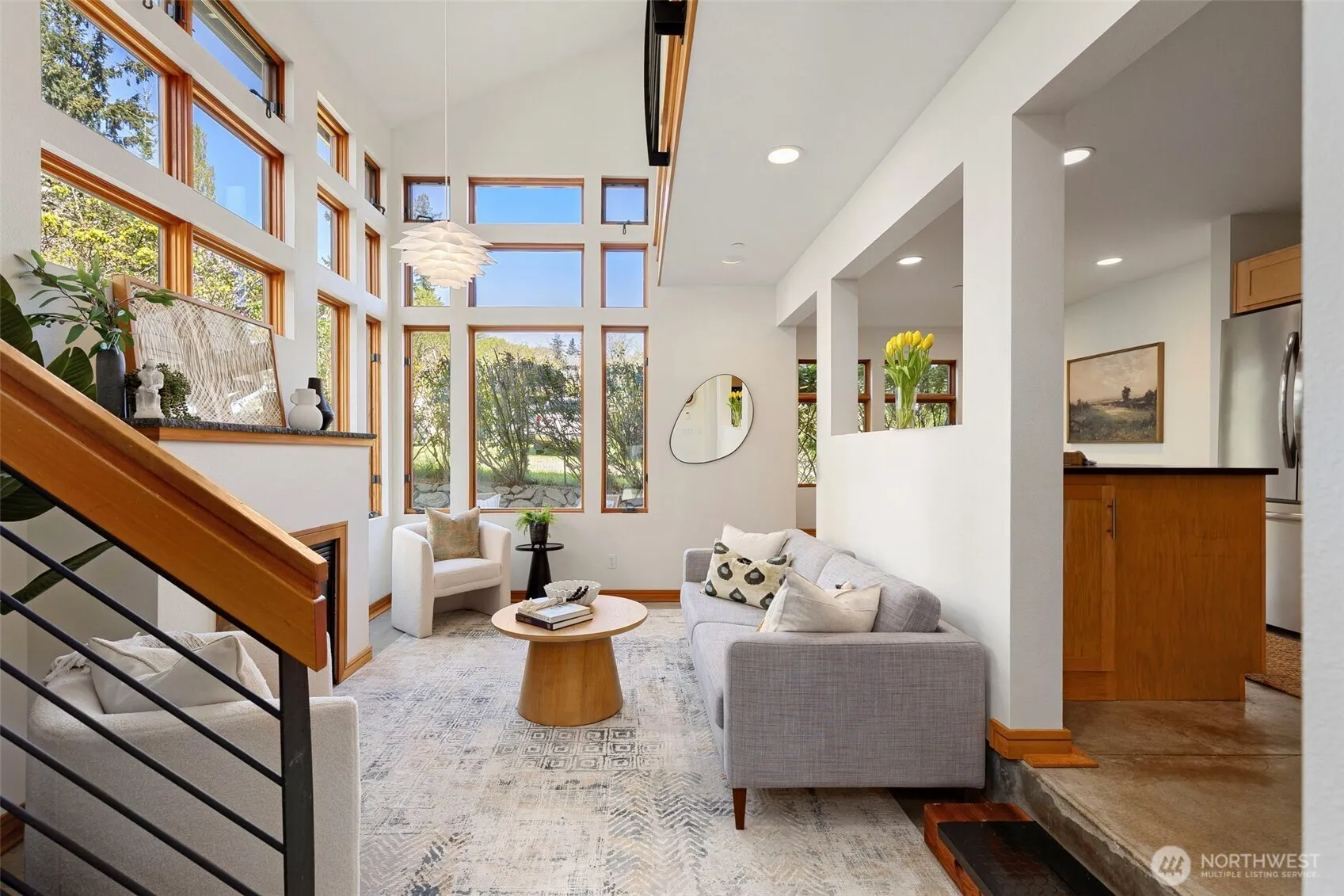 Tucked just off Madison Avenue, this Winslow townhome offers genuine walkability to town without the feel of being in it. Soaring cathedral ceilings and walls of windows give the main floor a scale and light that’s rare in a townhome. Radiant-heated concrete floors run the main level, anchored by a propane fireplace and a kitchen with maple cabinetry, honed granite countertops, a generous island, and dining access to a private garden patio. Upstairs, heated bamboo floors carry through the upper level. The primary suite includes an en suite bath, marble countertops, and a California Closets walk-through system. Two additional bedrooms and a full bath complete the upper level — one bedroom could easily serve as a home office. The private patio extends living space year-round. Rooftop solar, a fire sprinkler system, and updated kitchen appliances reflect a home that’s been thoughtfully maintained. A one-car garage rounds out the practical side — covered parking and storage this close to Winslow is a genuine advantage. One block from everything Winslow has to offer, tucked into a peaceful enclave — convenience without compromise!