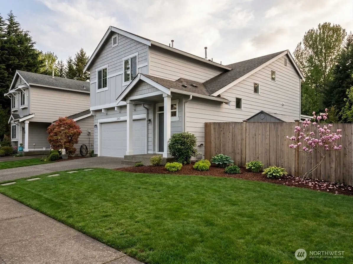 Nestled on a highly desirable corner lot & cul-de-sac. The home immediately impresses with a soaring two-story foyer and an open, light-filled great-room concept that highlights the thoughtfully designed, vaulted ceilings throughout. Featuring an expansive pantry and a casual eating bar, ideal for both morning coffee and evening entertaining. The upper level is intelligently planned, hosting four spacious bedrooms. This includes a tranquil master suite designed for total relaxation, alongside a full guest bath and a conveniently located laundry room, ensuring daily chores are effortless. Step outside to enjoy the serene outdoor living space, where a patio cover provides perfect shade for year-round enjoyment, shade cover included. The property boasts a large, private back and side yard, beautifully landscaped and awaiting a gardener’s personal touch. Practicality meets convenience with a two-car garage and additional off-street parking. Recently refreshed with new interior and exterior paint, this home is truly turn-key. Its prime location offers unparalleled convenience, with QFC and Starbucks located right across the street. Enjoy the perfect blend of neighborhood charm and easy access to every amenity in this exceptional home.