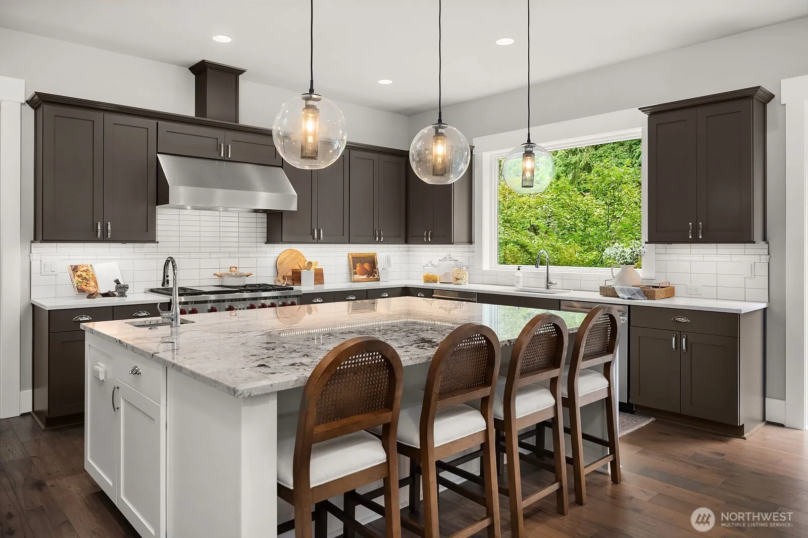 A custom JayMarc home in West Bellevue’s Enatai neighborhood, minutes from downtown Bellevue, I-90, and Old Bellevue’s shops and dining. The 5,800+ square foot floor plan offers 6 bedrooms, 5.25 baths, 10-foot ceilings 1st floor, rich millwork, and custom built-ins throughout. The gourmet chef’s kitchen is the heart of the home, featuring a supersized marble island, Sub-Zero refrigerator, Wolf appliances, a walk-in pantry, and seamless flow to the great room, ideal for everyday living and entertaining. A private main-level guest suite provides flexibility for guests or multigenerational living, while the upper-level primary retreat impresses with a spa-inspired five-piece bath and generous walk-in closet. Year-round entertaining extends outdoors to a covered patio with fireplace and a fully fenced, low-maintenance yard. Additional highlights include a 100-bottle temperature-controlled wine vault, a dedicated office, an expansive daylight basement, and a 3-car garage. No HOA and the rare option for a 38′ boat slip on Lake Washington complete the package. Unbeatable walkable location near Enatai Elementary, Lake Washington waterfront parks, Old Bellevue dining and shopping, plus convenient bus access to Seattle and Seahawks games.