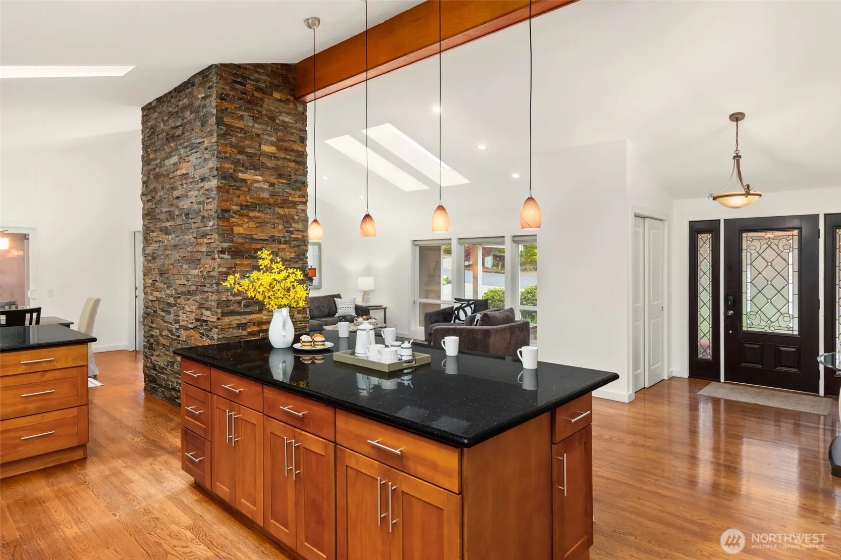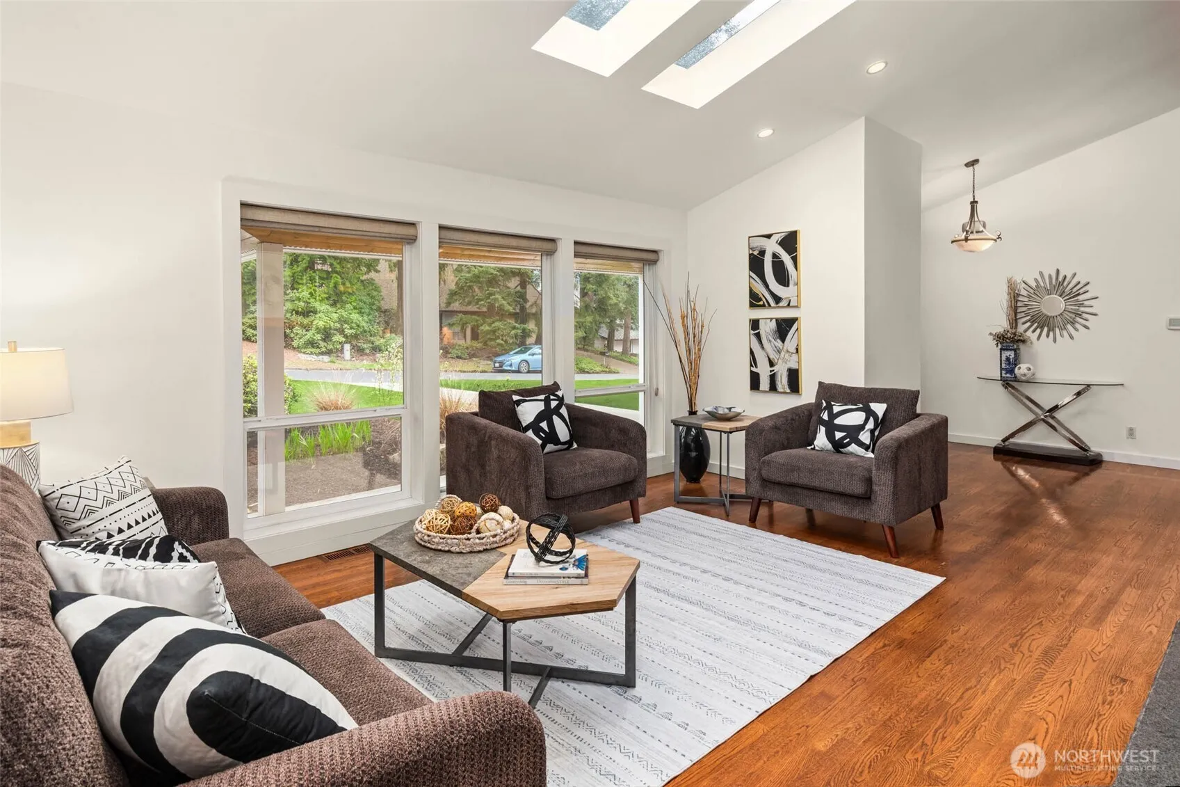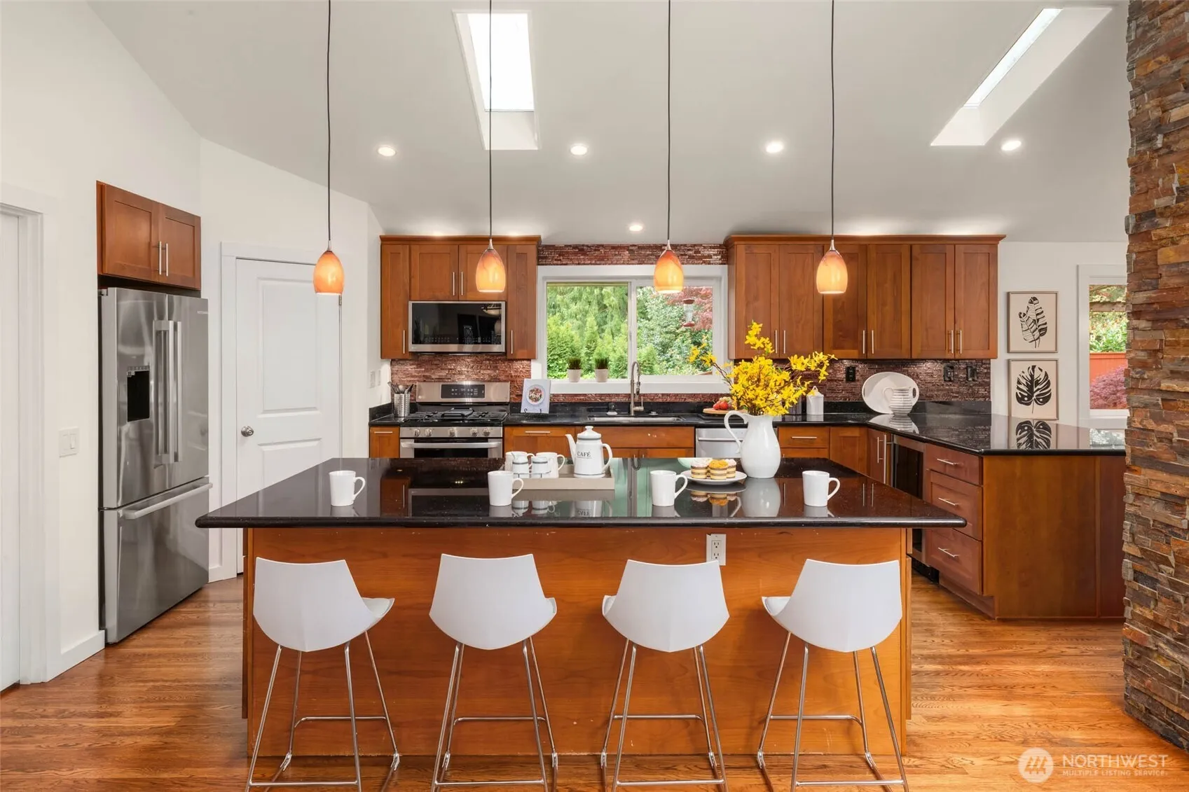 Stunning tri-level home nestled on an idyllic, tree-lined street in charming Newport Hills. From the moment you arrive, the exceptional curb appeal makes a lasting impression. Fully equipped with A/C, EV charger and solar panels for low utility bills! Thoughtfully remodeled with timeless finishes, this home seamlessly blends style and function with a versatile layout designed for today’s lifestyle. An open-concept main level is anchored by a striking fireplace and showcases gleaming hardwood floors, vaulted ceilings, and natural light from skylights above. The chef inspired kitchen features stainless steel appliances, a beautiful island with seating, and walk-in pantry. Upstairs is 3 bedrooms highlighted by an expansive primary suite with oversized walk-in closet and remodeled bath. The lower level offers a 4th bedroom, a ¾ bath, and an expansive laundry room, along with a stunning, retreat-like family room designed for both lively gatherings and cozy movie nights. Step outside to a covered patio overlooking an impeccably manicured, level, fully fenced backyard. A charming detached studio with electricity provides the perfect space for a home office, creative retreat, or potential ADU. Ideally located just minutes from Bellevue and Seattle – just around the corner you’ll find shopping and dining. Just down the hill you’ll have freeway access for an easy commute in any direction. Located in the highly regarded Bellevue School District, including Newport High.