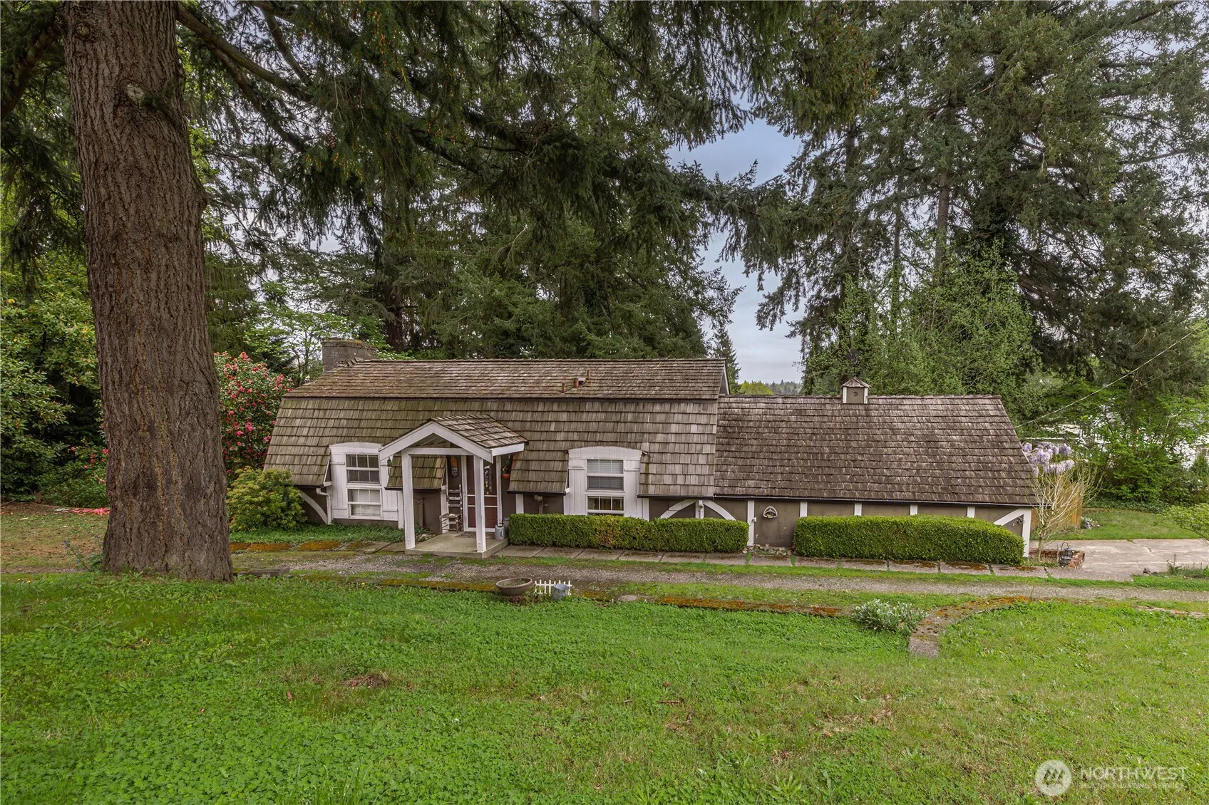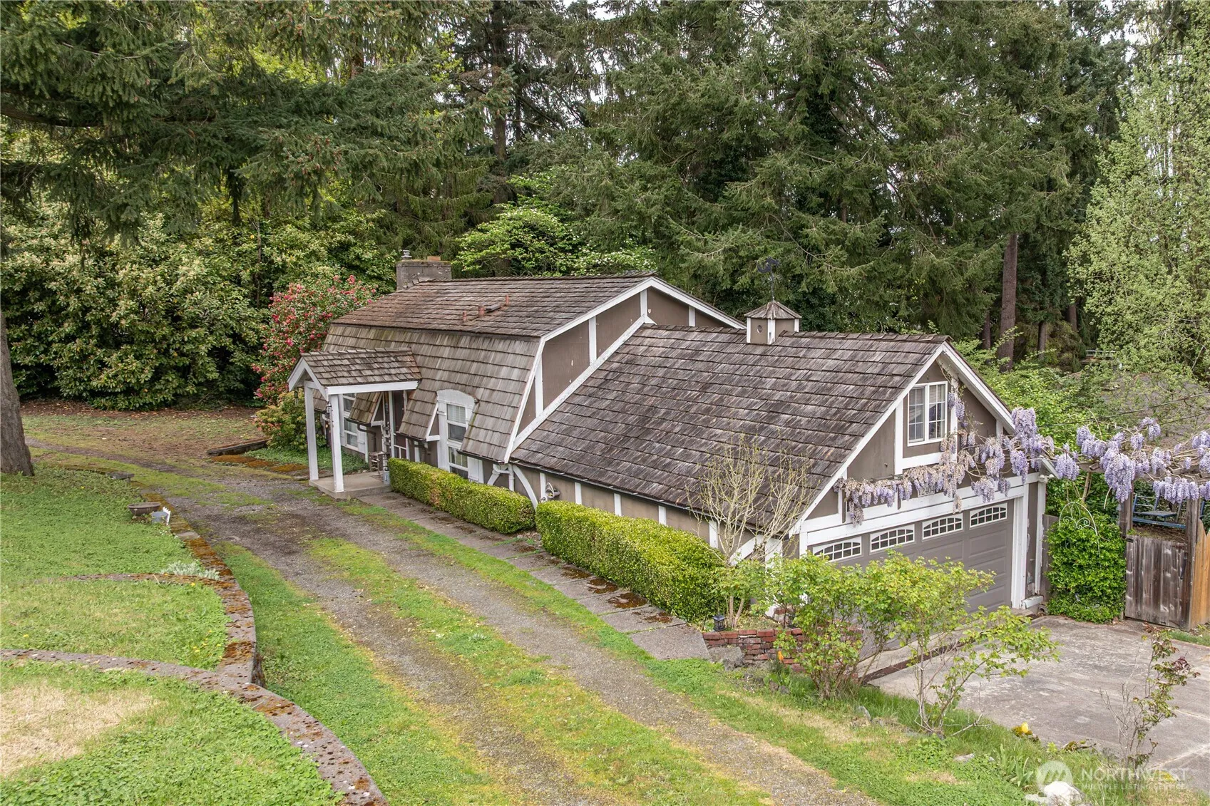 In the heart of everything Bellevue, just minutes to downtown, this unique home offers timeless charm and character. The architectural style features a barn inspired silhouette, vaulted ceilings, exposed beams, planked wood ceilings and beadboard accents create interest throughout. On the main floor, the classic cottage style kitchen has a farmhouse feel, cabinetry with hints of scalloped trim, a butcher block island with cooktop plus an adjoining eating space. In addition, there is a dedicated dining room with bay window, a 1/2 bath and the spacious living room is anchored by a cozy wood burning fireplace. You will be greeted by a loft entering the upper floor which provides separation between the primary suite and two additional bedrooms. The primary includes an ensuite bath and unfinished bonus space. The upper floor also includes a 3/4 bath. A covered patio provides an inviting outdoor setting ideal for relaxing, entertaining and enjoying the peaceful surroundings of this established community. Set on a generous .31 acre lot, the mature landscaping creates a feeling of privacy and there is ample space for parking with attached garage and two driveways. Value is in the land and desirable Bellevue School District. This home is being sold as is. Repairs may be needed providing an opportunity for customizing in a prime location. Bellevue Botanical Garden and Wilburton Hill Park are a stroll away.