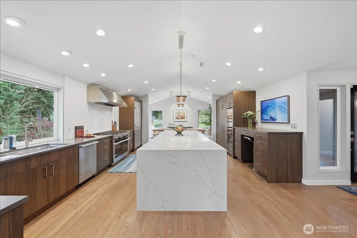 Open the front door to your new home where luxury meets long-term performance on a private, one-acre estate just minutes from the heart of Woodinville Wine Country. Spanning 4,110 square feet, this home was meticulously renovated for enduring comfort rather than quick resale, boasting high-value infrastructure investments like an 8.5 kW solar system, a 2014 metal roof, and enhanced R-19 wall assemblies for maximum efficiency. The show-stopping chef’s kitchen is a culinary sanctuary featuring vaulted ceilings, professional-grade Miele and Thermador appliances, and custom walnut cabinetry, while the flexible lower-level apartment with its own entrance offers the perfect footprint for multigenerational living or rental potential. Enhanced accessibility features include a roll-in shower and heated floors, providing comfort and true aging-in-place utility. Outdoor living is elevated by a lush fruit orchard, greenhouse, and swim spa conveniently situated next to the primary suite’s private deck. All complemented by a 3+ car garage & shop with dual 50-amp EV charging and immediate access to the Pipeline Trail and top-rated Northshore schools. With integrated smart-home automation, a high-capacity five-bedroom septic system, and zero-VOC materials throughout, this property offers a rare blend of sustainable technology and sophisticated design in the Pacific Northwest’s premier tech and wine corridor.