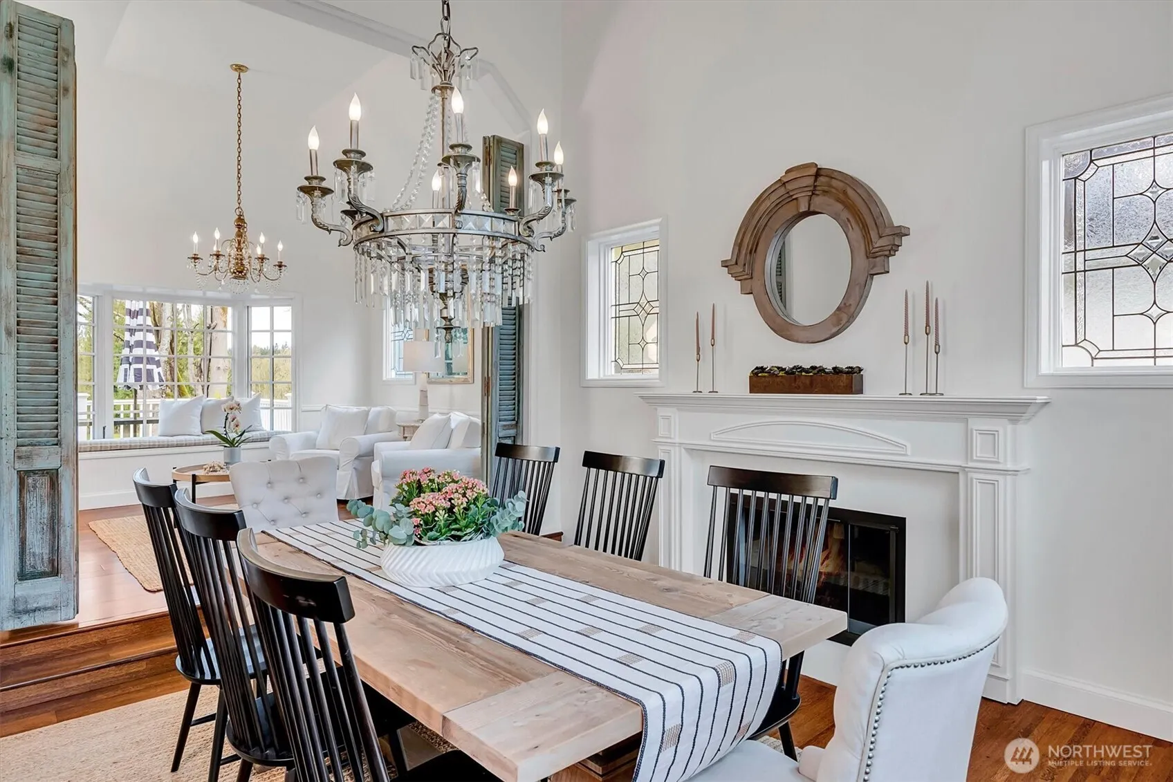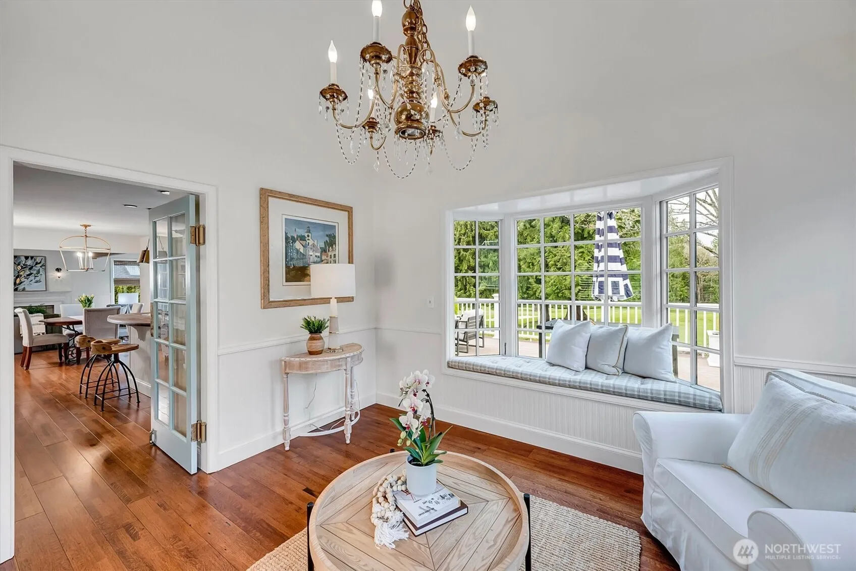 Peaceful retreat in Bear Creek. A rare setting along two fairways in Bear Creek Country Club, where privacy meets sweeping golf course views and unforgettable sunsets. Set back from the course for a private feel, this home captures light from every angle creating a warm, inviting atmosphere throughout. From the moment you enter – rich hardwoods, soaring ceilings, and a statement chandelier set the tone. The home flows effortlessly from formal to casual spaces, with a charming sitting room just off the kitchen perfect for morning coffee or quiet conversation. The kitchen, finished with marble counters and a generous island with butcher-block top, opens to comfortable gathering spaces designed for everyday living and entertaining. Upstairs, the primary suite is a true retreat, complete with its own fireplace, sitting area, spa-inspired bath, and beautifully organized California Closets. Flexible living spaces include a spacious bonus room ideal as a guest suite or fourth bedroom, along with a main-floor office near a 3/4 bath well-suited for multi-generational living. Out back, a wrap-around deck invites you to dine, relax, and take in the expansive fairway views, evening sunsets, and the occasional hot-air balloon drifting by. All within a gated community offering a park, playground, and tennis, pickleball, and basketball courts – with optional country club membership. Great HOA with attention to Community!
