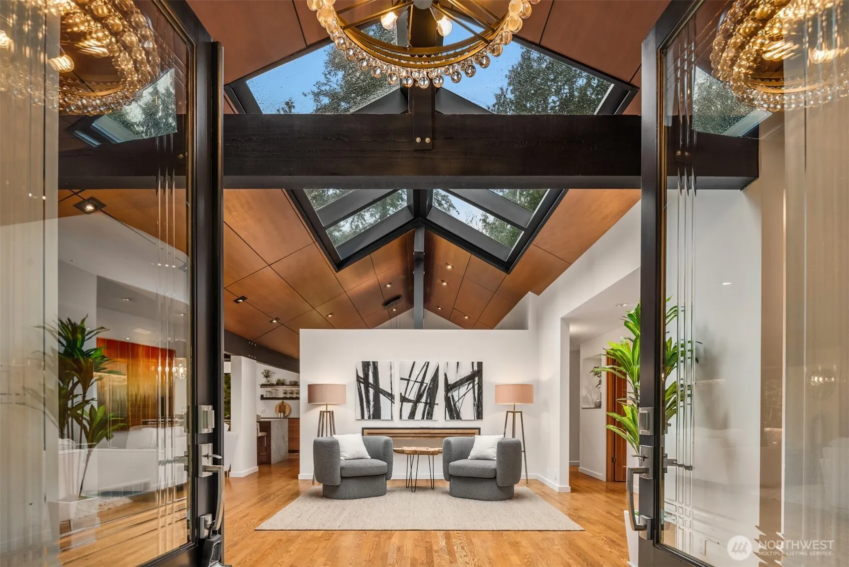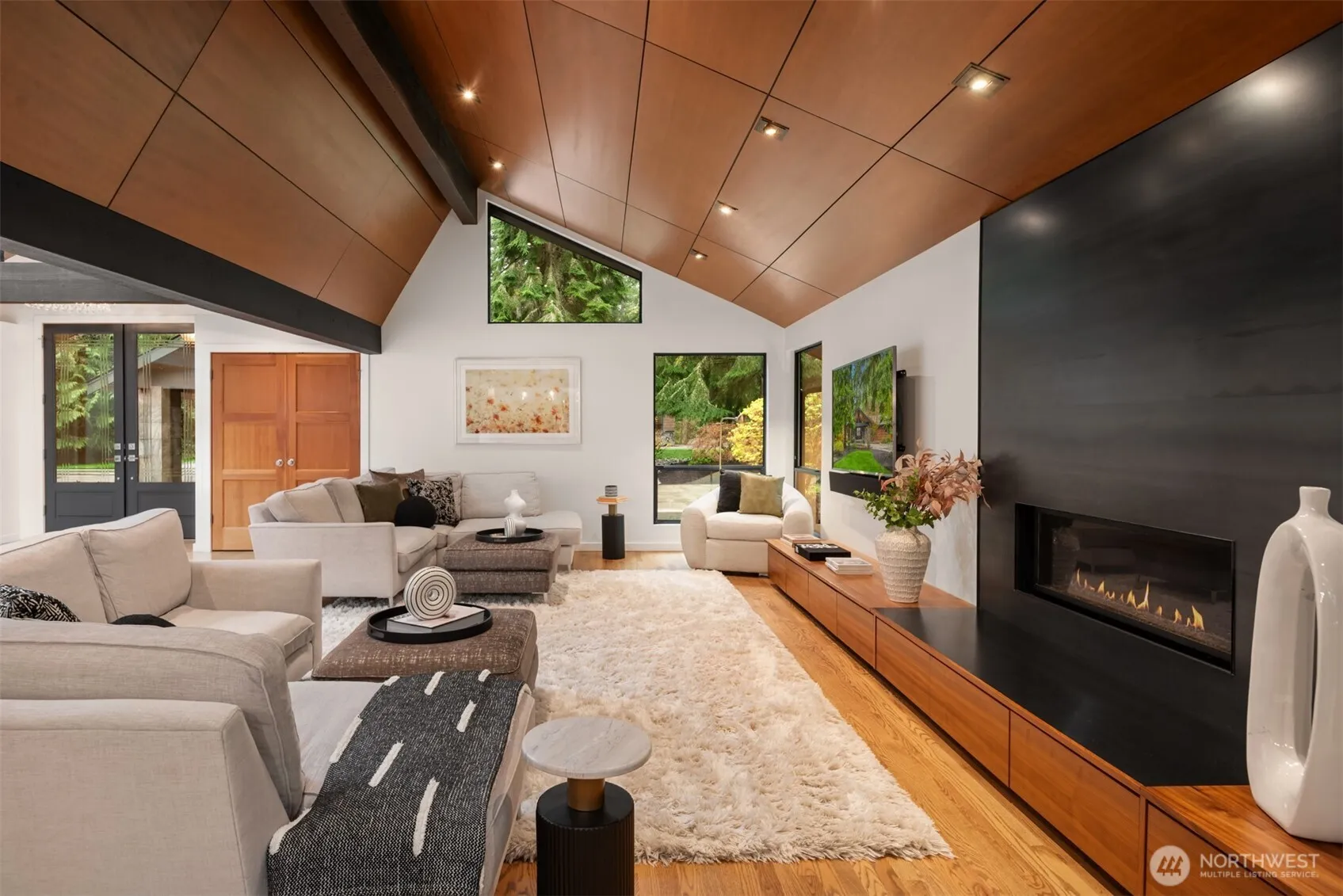An extraordinary expression of Pacific Northwest modernism, this reimagined Woodinville estate blends architectural presence with refined livability on a level acre enveloped in evergreens. A sweeping circular drive arrives at a covered porte cochère upon arrival. Inside, nearly 3,600 sqft unfolds with a striking, design forward aesthetic. Vaulted ceilings with walnut stained detail, beams, & rich wood flooring create a warm yet sophisticated atmosphere. The main level offers seamless living with 3 beds, office, & thoughtfully curated spaces that balance openness with intimacy. At the heart of the home, a chef’s kitchen makes a bold statement with walnut cabinetry, a marble waterfall island, & Sub Zero & Wolf appliances. A NanaWall system dissolves the boundary between indoors and out, opening to an expansive deck designed for elevated entertaining & year round enjoyment. The primary suite is a serene sanctuary, featuring soaring wood lined ceilings, a custom dressing room with crafted fir built ins, and spacious en-suite bath filled with natural light. Versatility defines the estate, with a substantial 32 by 40 detached garage complete with workshop and a refined flex space above, plus an additional 24 by 36 finished structure ideal for a luxury gym, office or hobbies. Surrounded by curated landscaping, the grounds offer privacy, RV parking, & a generator, all just moments from Woodinville’s acclaimed wineries, dining, and convenient access to the Eastside tech corridor.